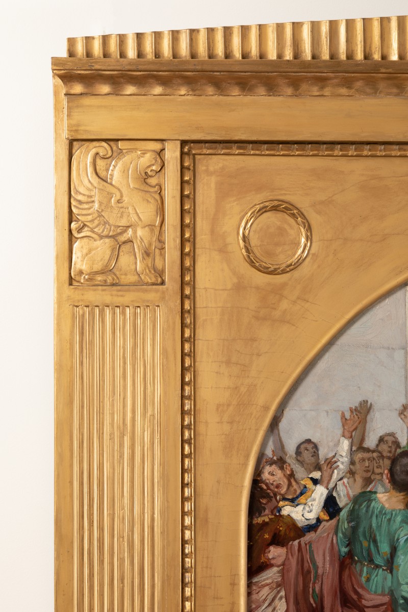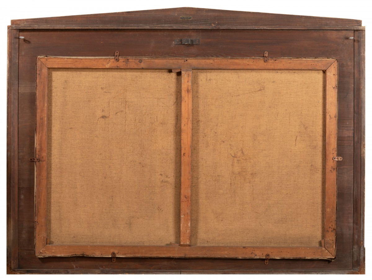 Original canvas. Very beautiful frame in the shape of a temple with fluted columns supporting winged lions.