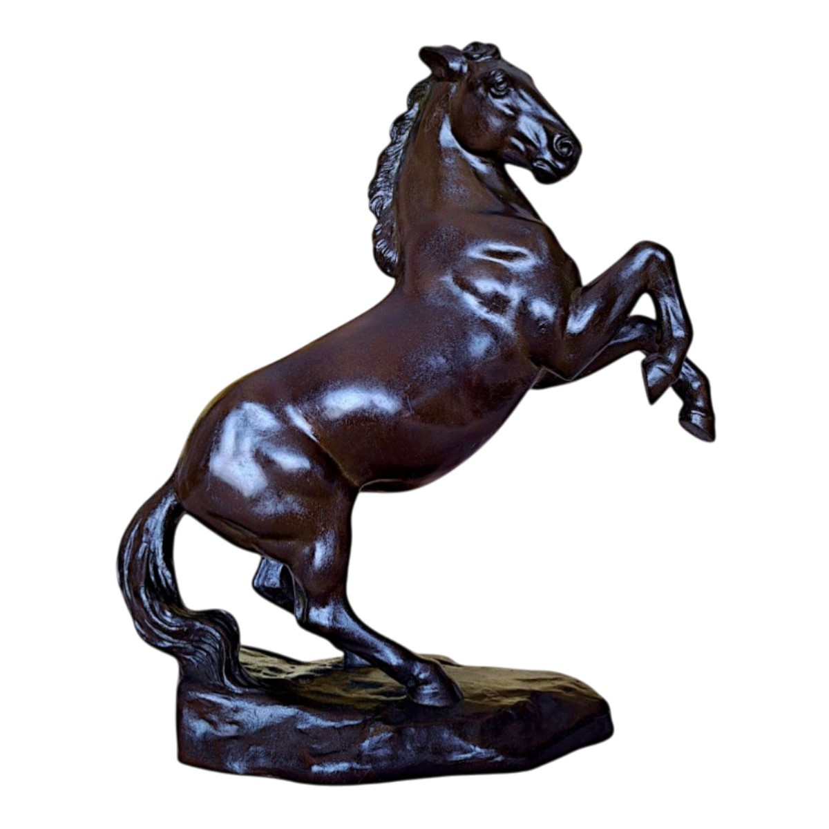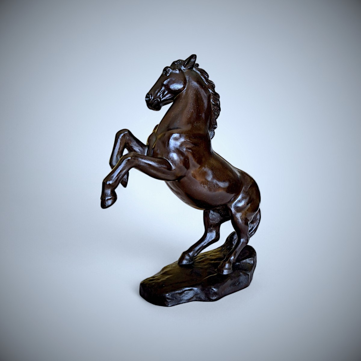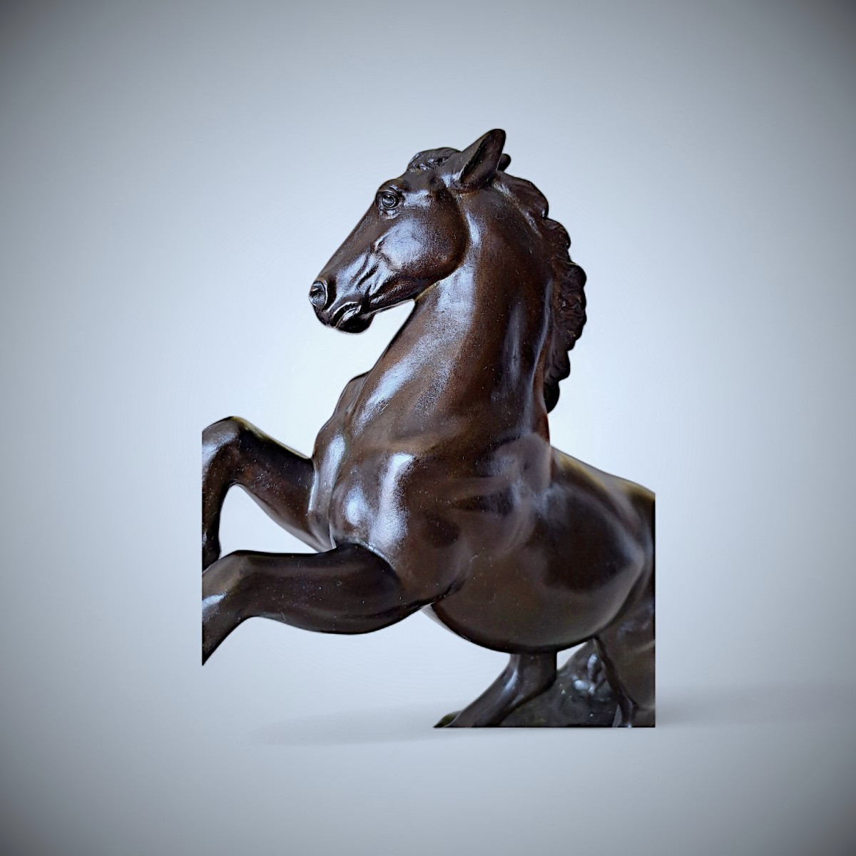 This striking bronze sculpture depicts a rearing horse, captured in a moment of controlled tension and forward momentum. The power of its anatomy, the arched neck, and the raised forelegs are rendered with exceptional clarity and balance, while the subtly modulated surface and deep, lustrous patina accentuate the sculptural volumes. The naturalistic base anchors the composition, reinforcing the contrast between stability and dynamic movement.