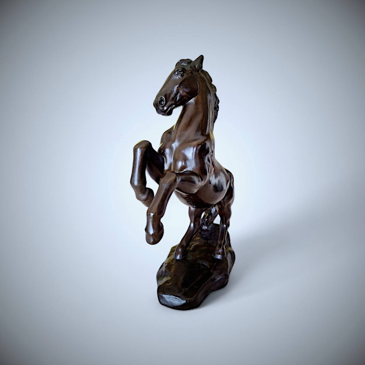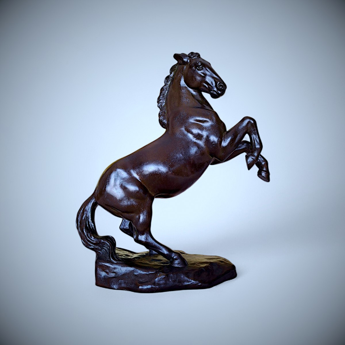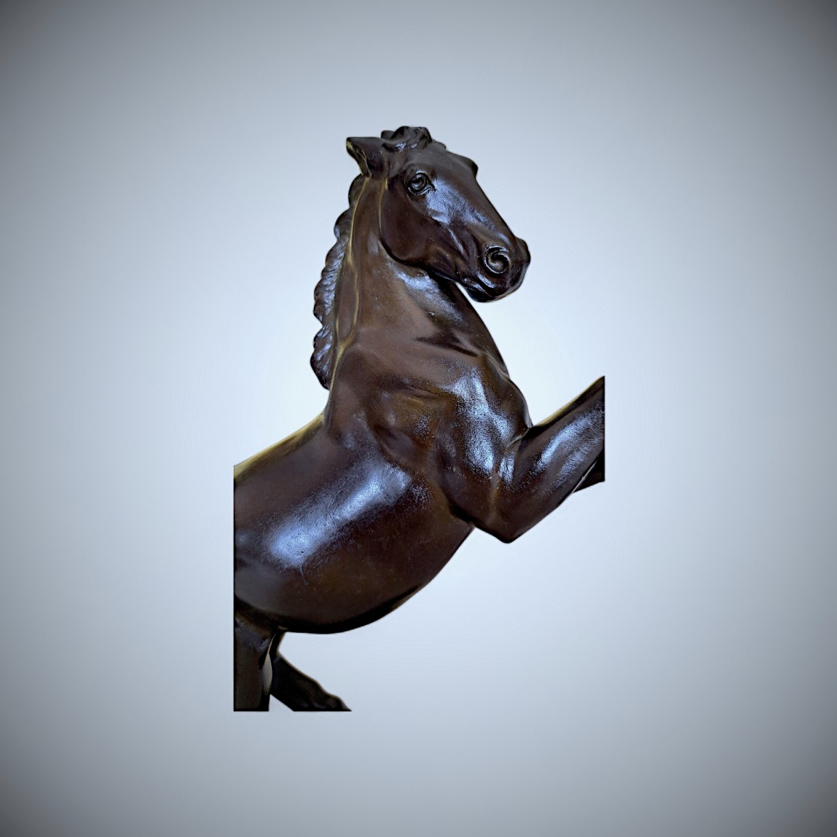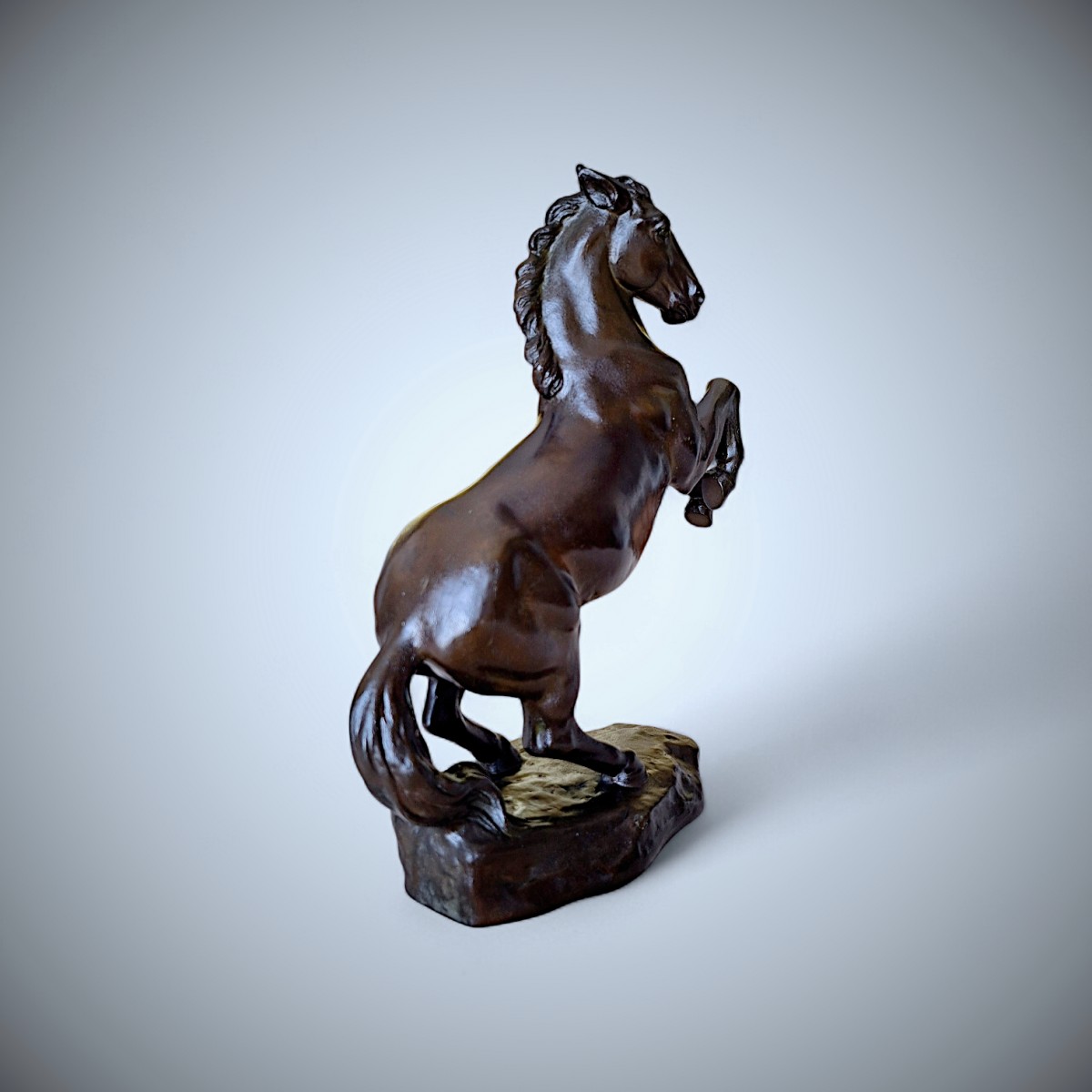This striking bronze sculpture depicts a rearing horse, captured in a moment of controlled tension and forward momentum. The power of its anatomy, the arched neck, and the raised forelegs are rendered with exceptional clarity and balance, while the subtly modulated surface and deep, lustrous patina accentuate the sculptural volumes. The naturalistic base anchors the composition, reinforcing the contrast between stability and dynamic movement.
