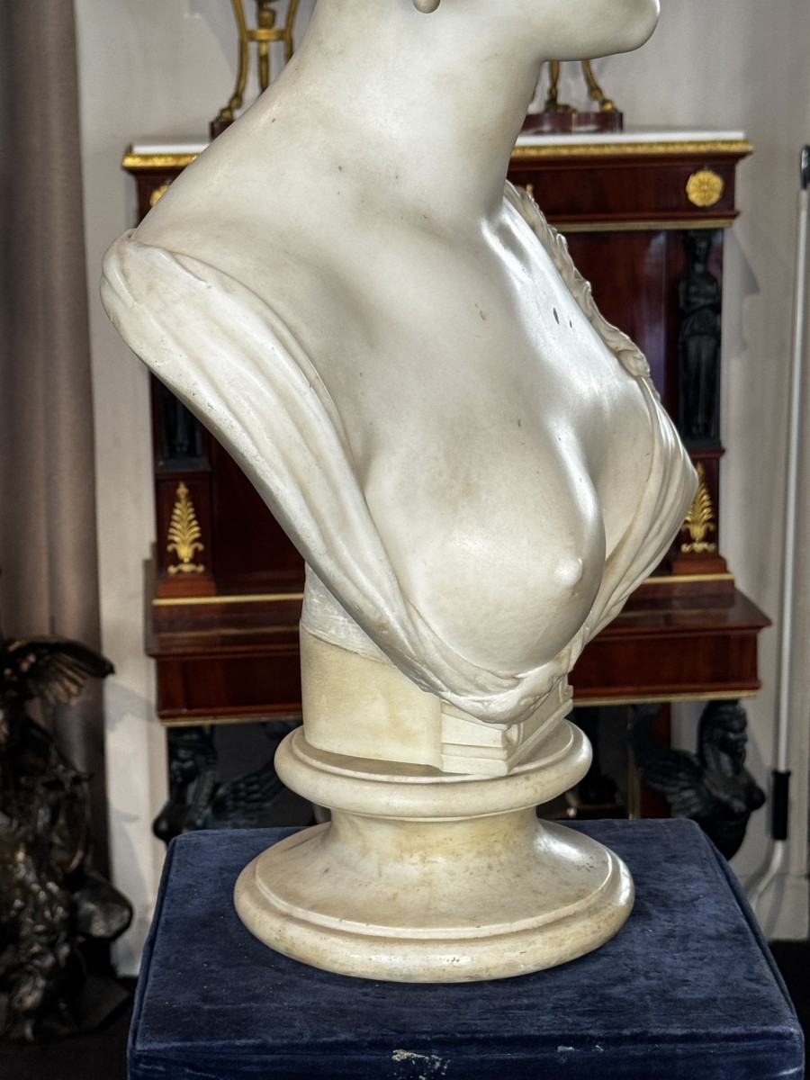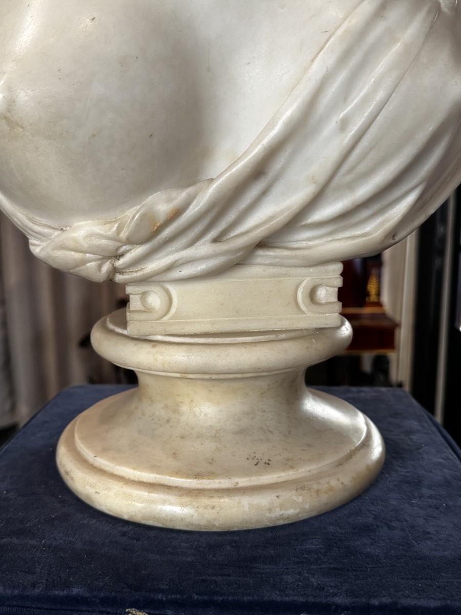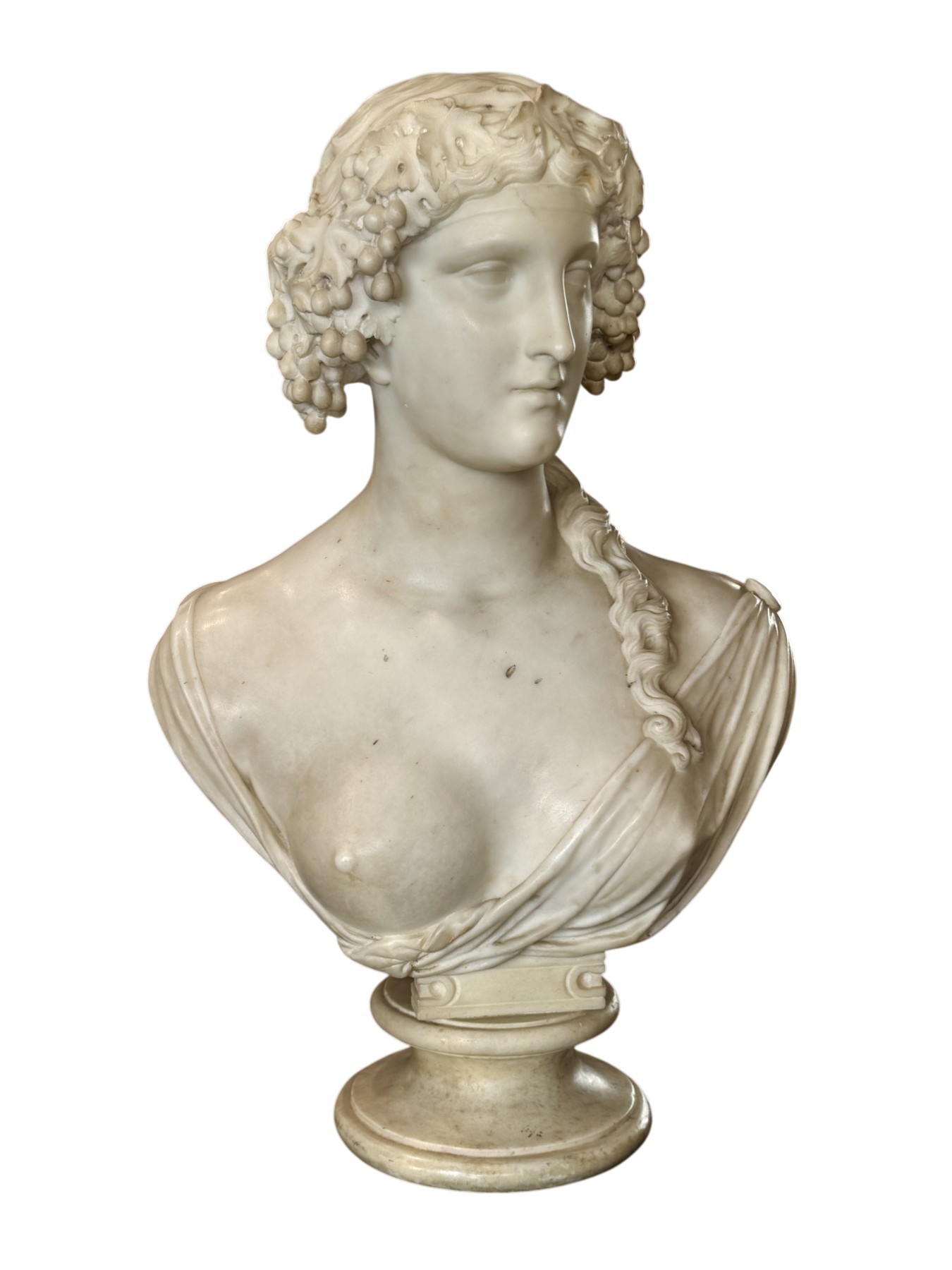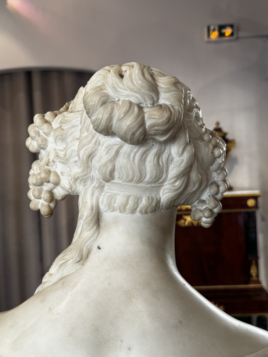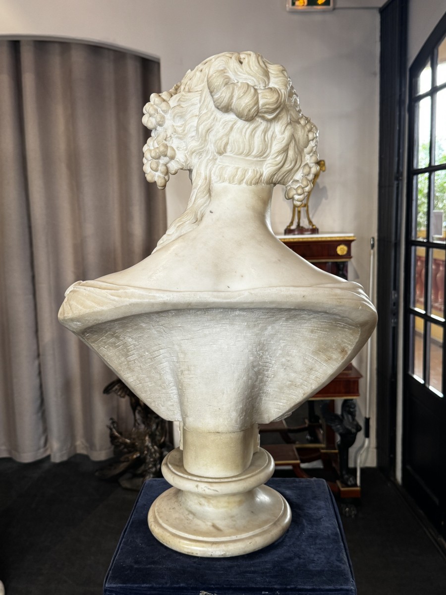 A large Carrara white marble bust from the Neoclassical period, depicting a female figure draped in the antique manner and adorned with clusters of grapes and vine leaves in her hair.