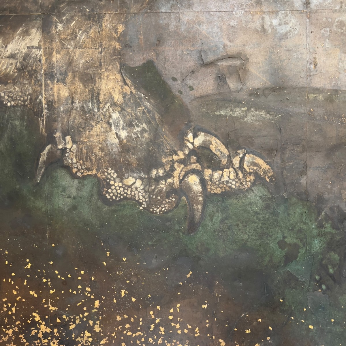 Technique: Chinese ink (sumi), mineral pigments (malachite, azurite, gofun), gold powder (sunago) on a brown ground