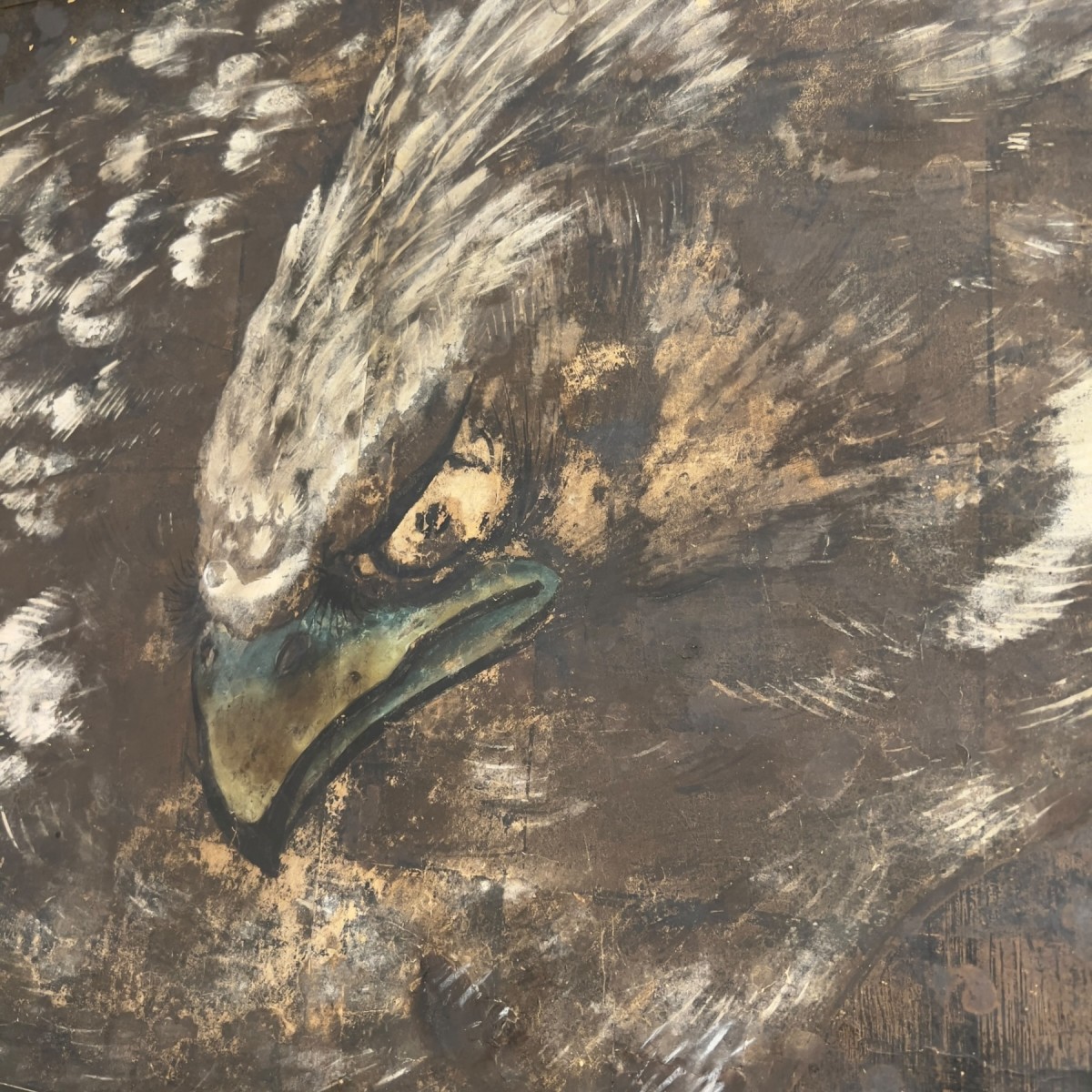 An exceptional panel depicting a monumental eagle captured in an attitude of meditative power. The bird of prey, rendered with remarkable technical virtuosity, stands out against a brown-gold ground animated by a subtle sprinkling of gold (sunago).
