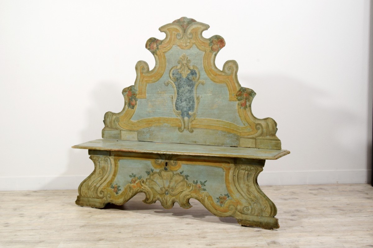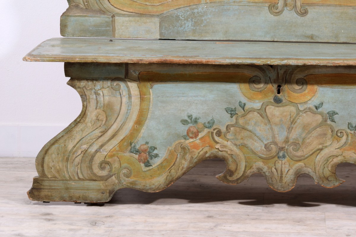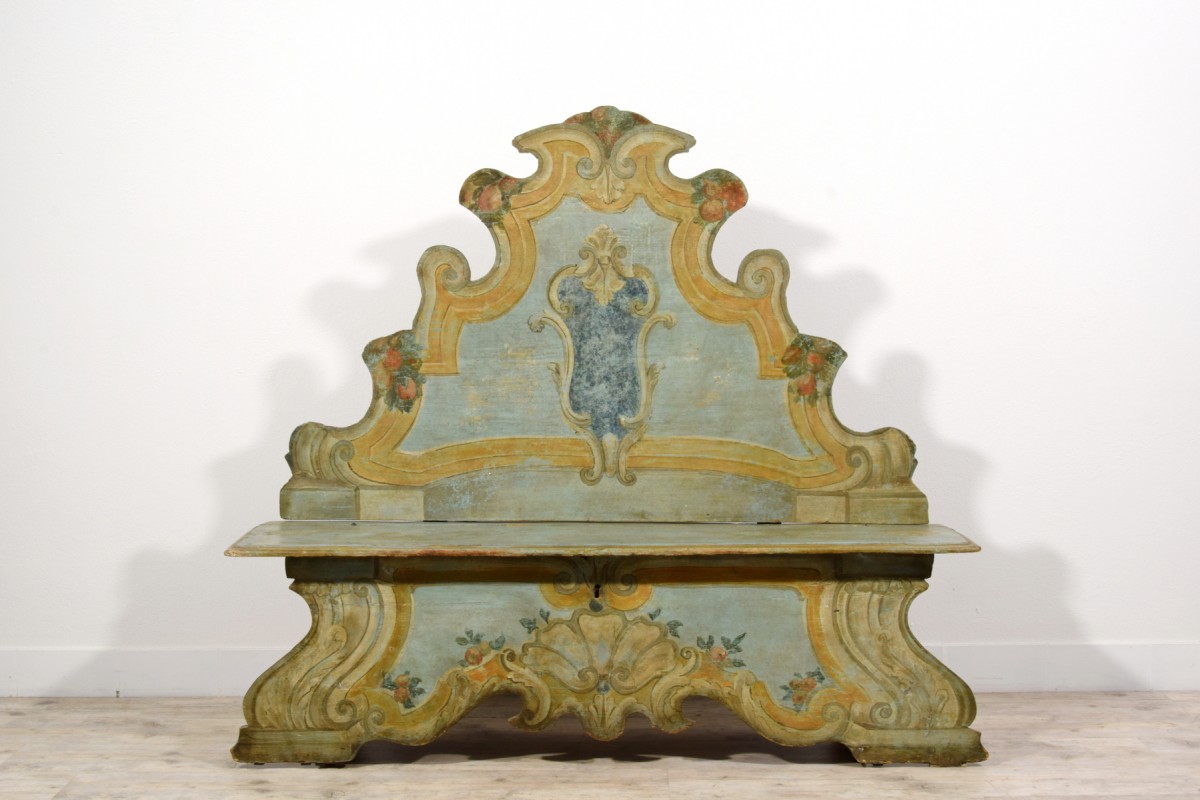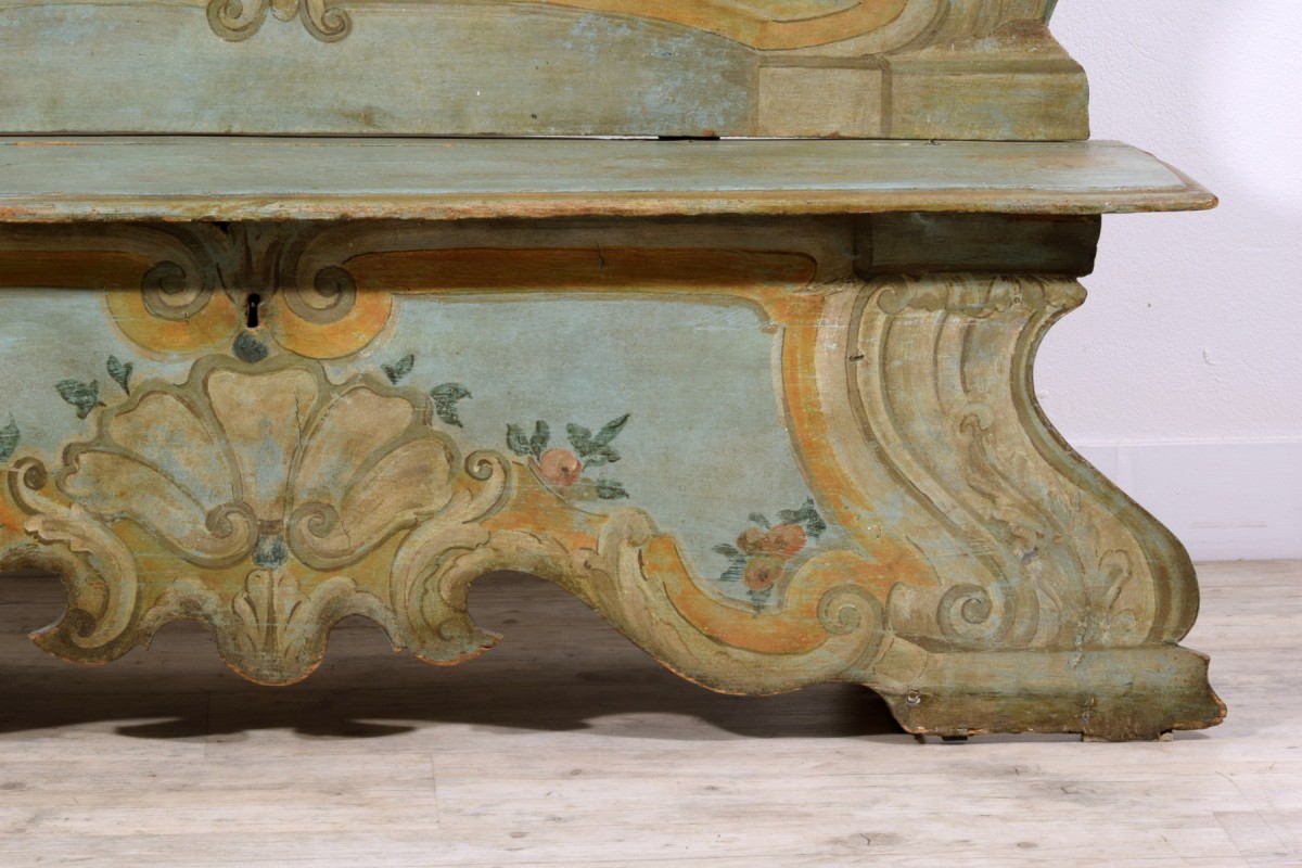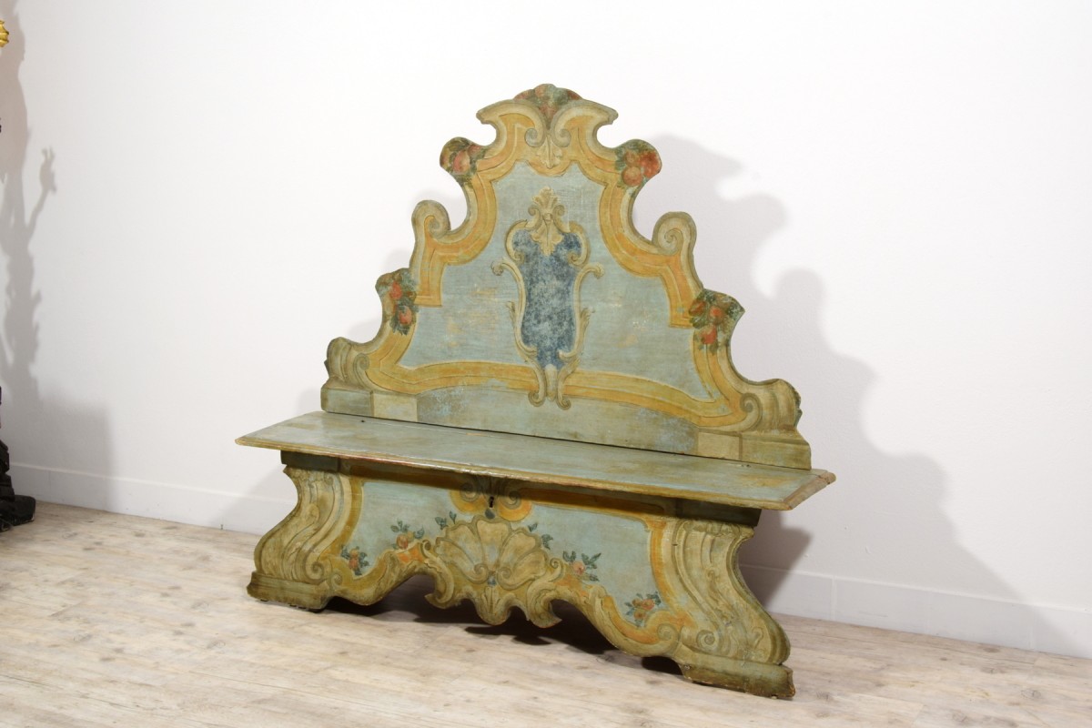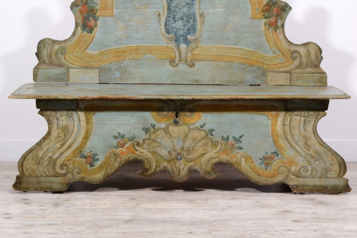 This elegant bench was made in the Veneto region (Italy), in lacquered wood, during the first half of the 18th century. The piece stands out for its brightness, achieved through a light and delicate color palette, enriched by a rich trompe-l’œil decoration of architectural taste, simulating marble panels, molded frames, and flowing baroque-style volutes. The surfaces are enlivened by polychrome floral motifs, skillfully integrated to lighten and enhance the overall effect.