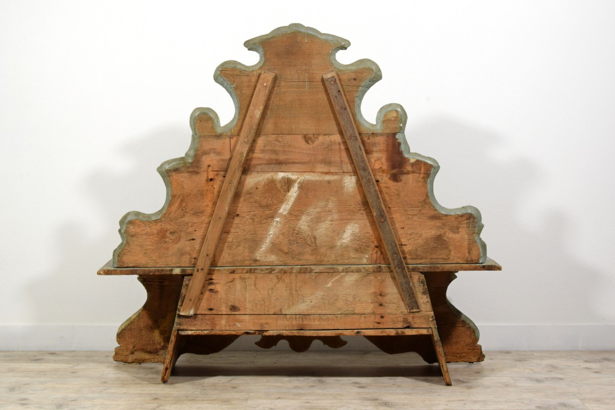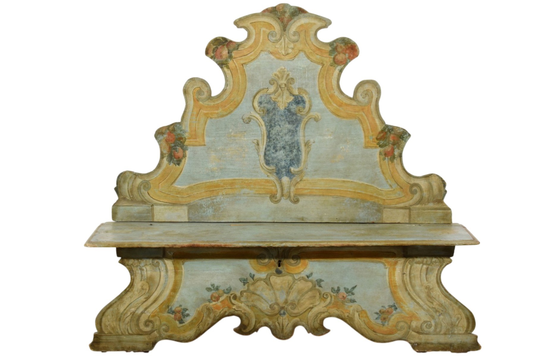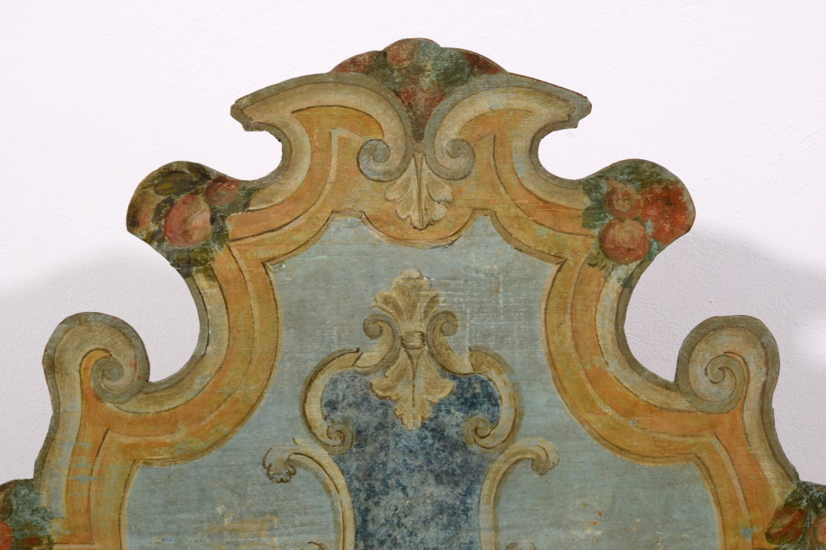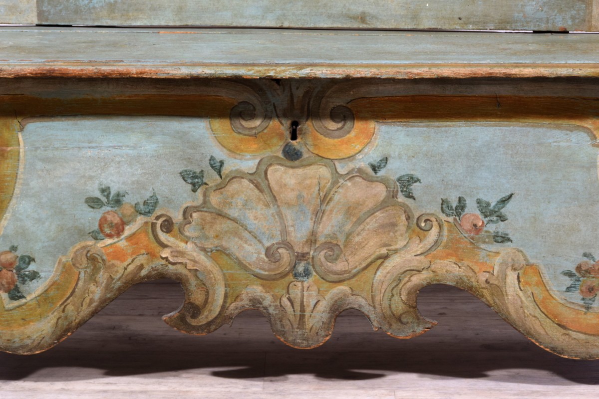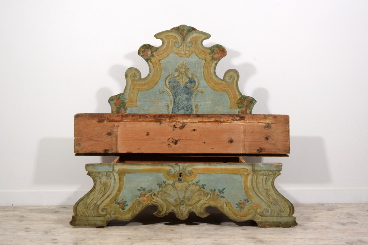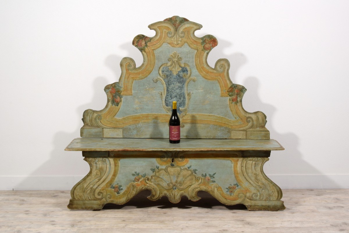 This elegant bench was made in the Veneto region (Italy), in lacquered wood, during the first half of the 18th century. The piece stands out for its brightness, achieved through a light and delicate color palette, enriched by a rich trompe-l’œil decoration of architectural taste, simulating marble panels, molded frames, and flowing baroque-style volutes. The surfaces are enlivened by polychrome floral motifs, skillfully integrated to lighten and enhance the overall effect.