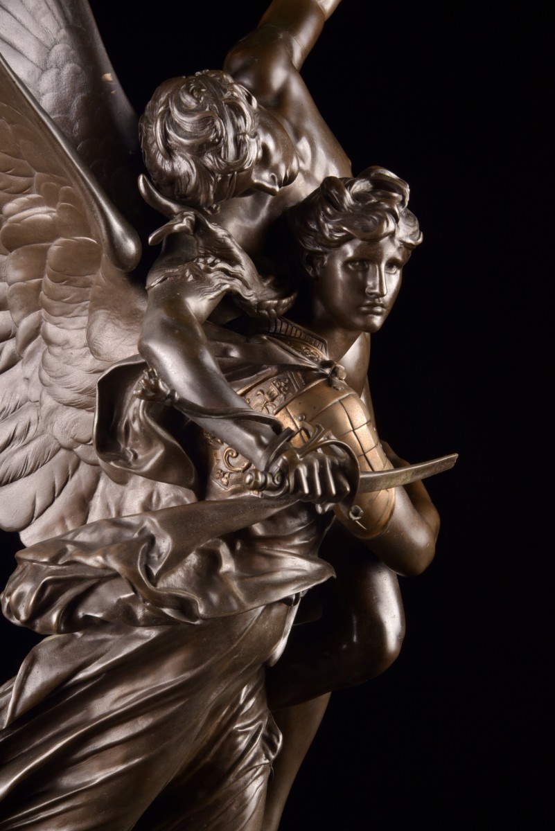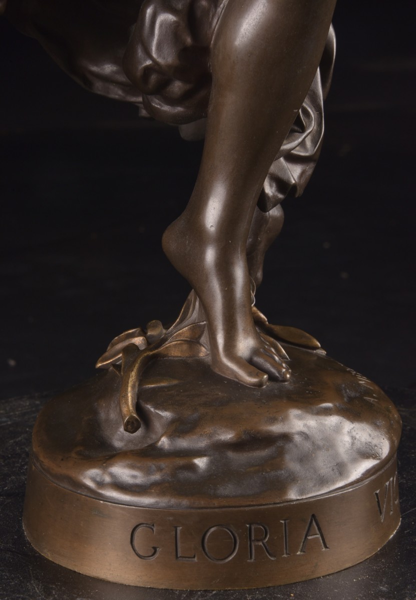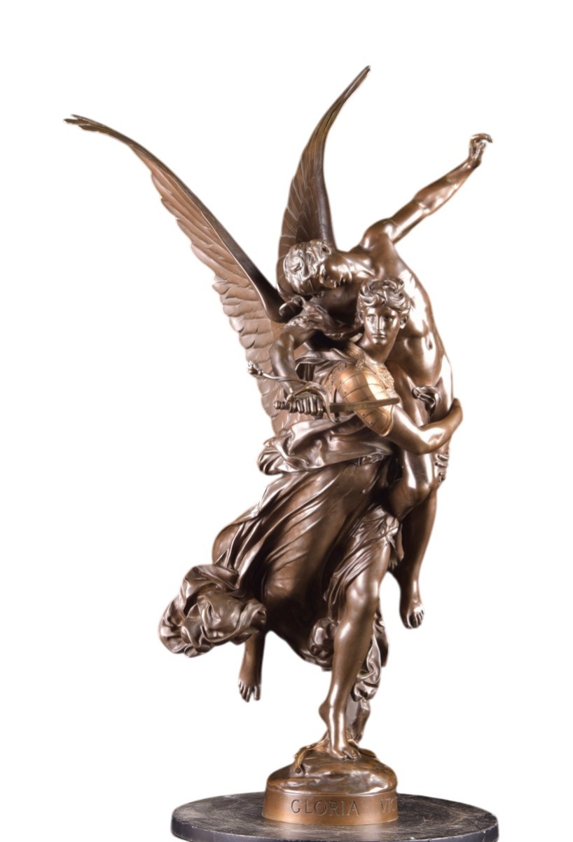 "Gloria Victis" is an iconic bronze sculpture by the French sculptor Marius Jean Antonin Mercié. The composition depicts a winged female figure—a symbol of Fame or Victory—supporting a wounded and dying soldier. Her broken sword evokes defeat, while the overall elegance expresses dignity and honor. This model, presented in a high-quality reduced version, corresponds to the editions produced at the end of the 19th century, often cast by renowned workshops such as Barbedienne. At approximately 71 cm high, it is a particularly sought-after size on the art market. Presented at the Paris Salon in 1874, "Gloria Victis" quickly became one of the most celebrated sculptures of its time. It embodies the artistic refinement and historical sensitivity of 19th-century French sculpture and remains a highly prized work among collectors today. Dimensions: 71 × 42 cm