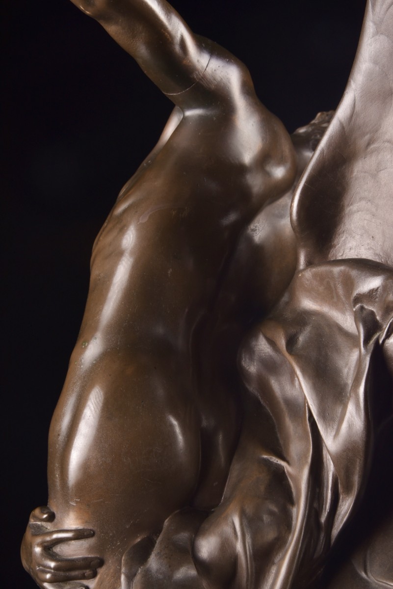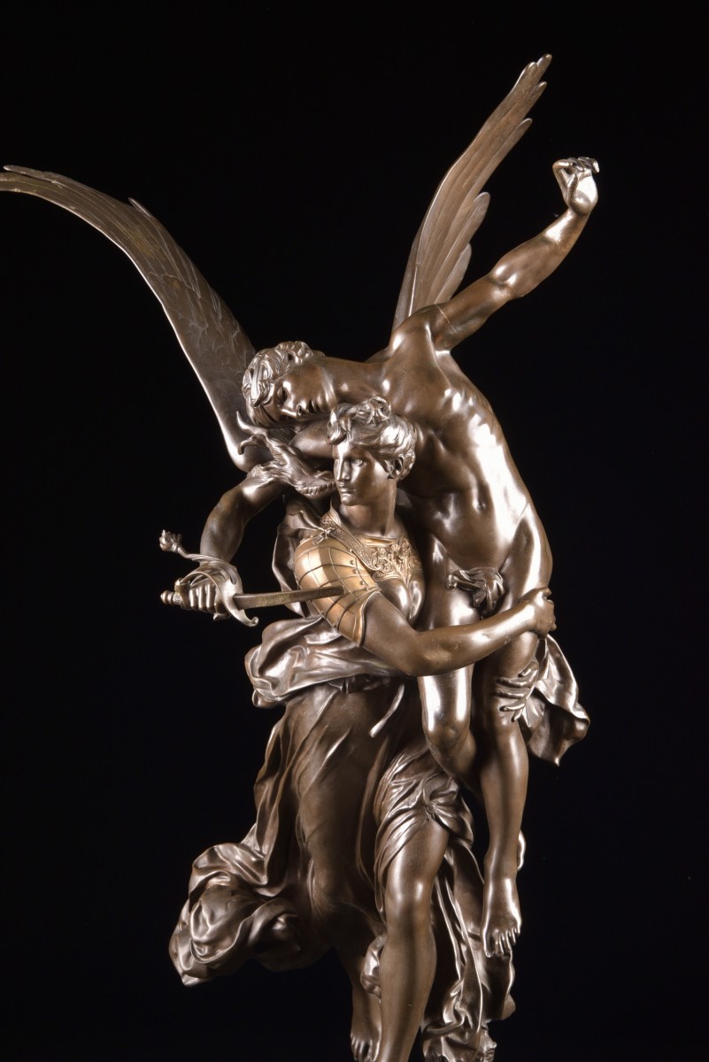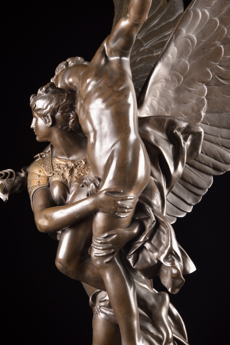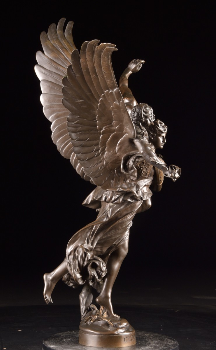 "Gloria Victis" is an iconic bronze sculpture by the French sculptor Marius Jean Antonin Mercié. The composition depicts a winged female figure—a symbol of Fame or Victory—supporting a wounded and dying soldier. Her broken sword evokes defeat, while the overall elegance expresses dignity and honor. This model, presented in a high-quality reduced version, corresponds to the editions produced at the end of the 19th century, often cast by renowned workshops such as Barbedienne. At approximately 71 cm high, it is a particularly sought-after size on the art market. Presented at the Paris Salon in 1874, "Gloria Victis" quickly became one of the most celebrated sculptures of its time. It embodies the artistic refinement and historical sensitivity of 19th-century French sculpture and remains a highly prized work among collectors today. Dimensions: 71 × 42 cm