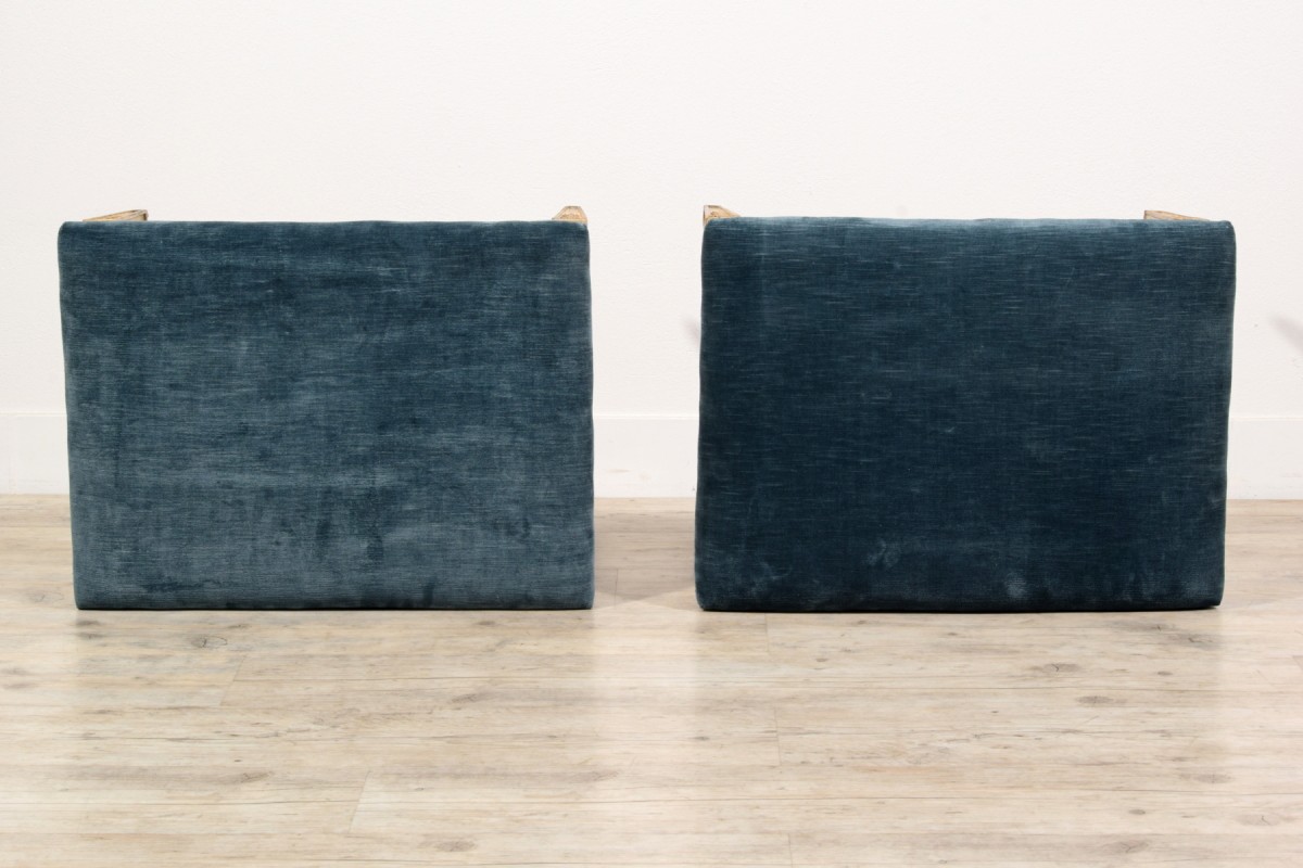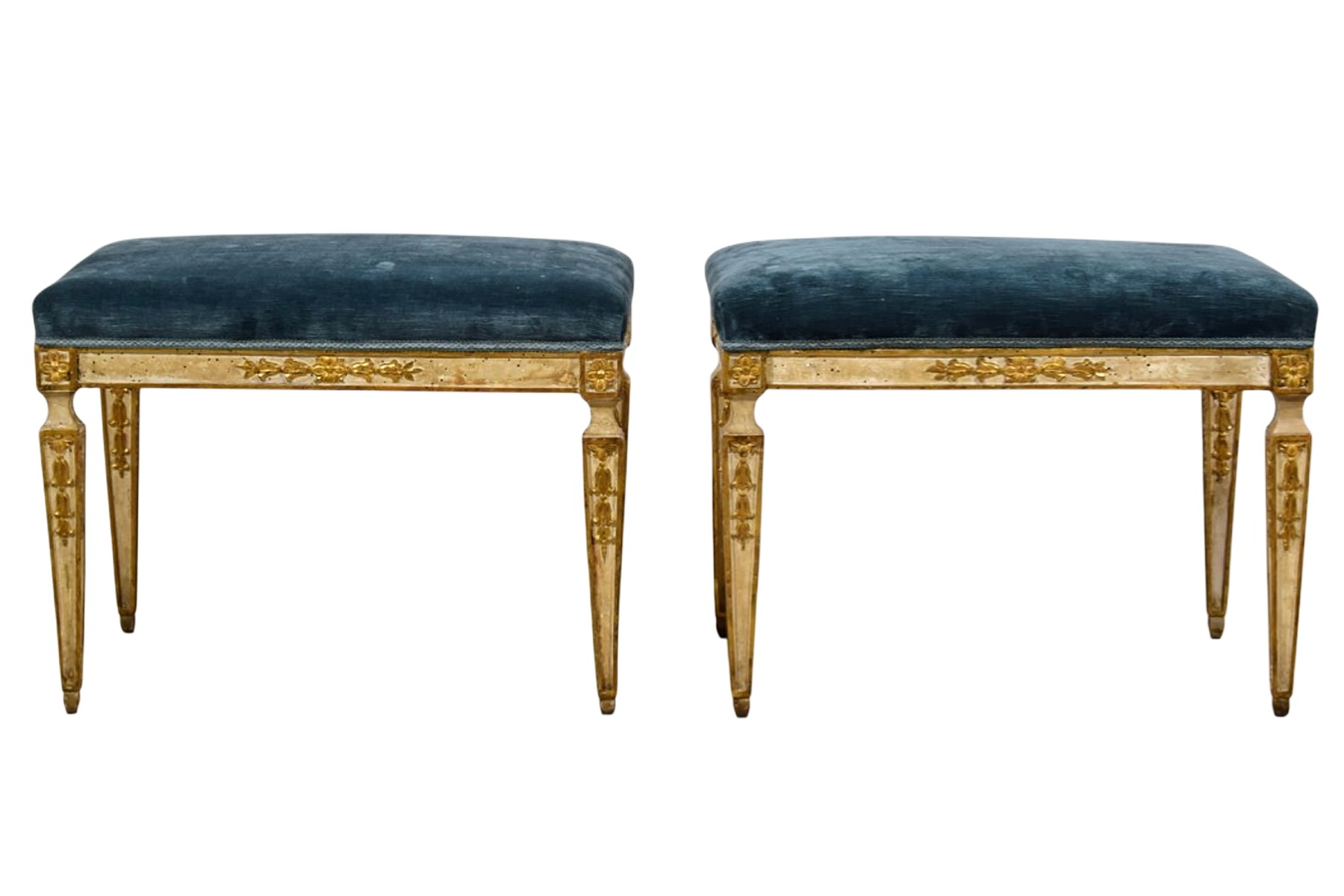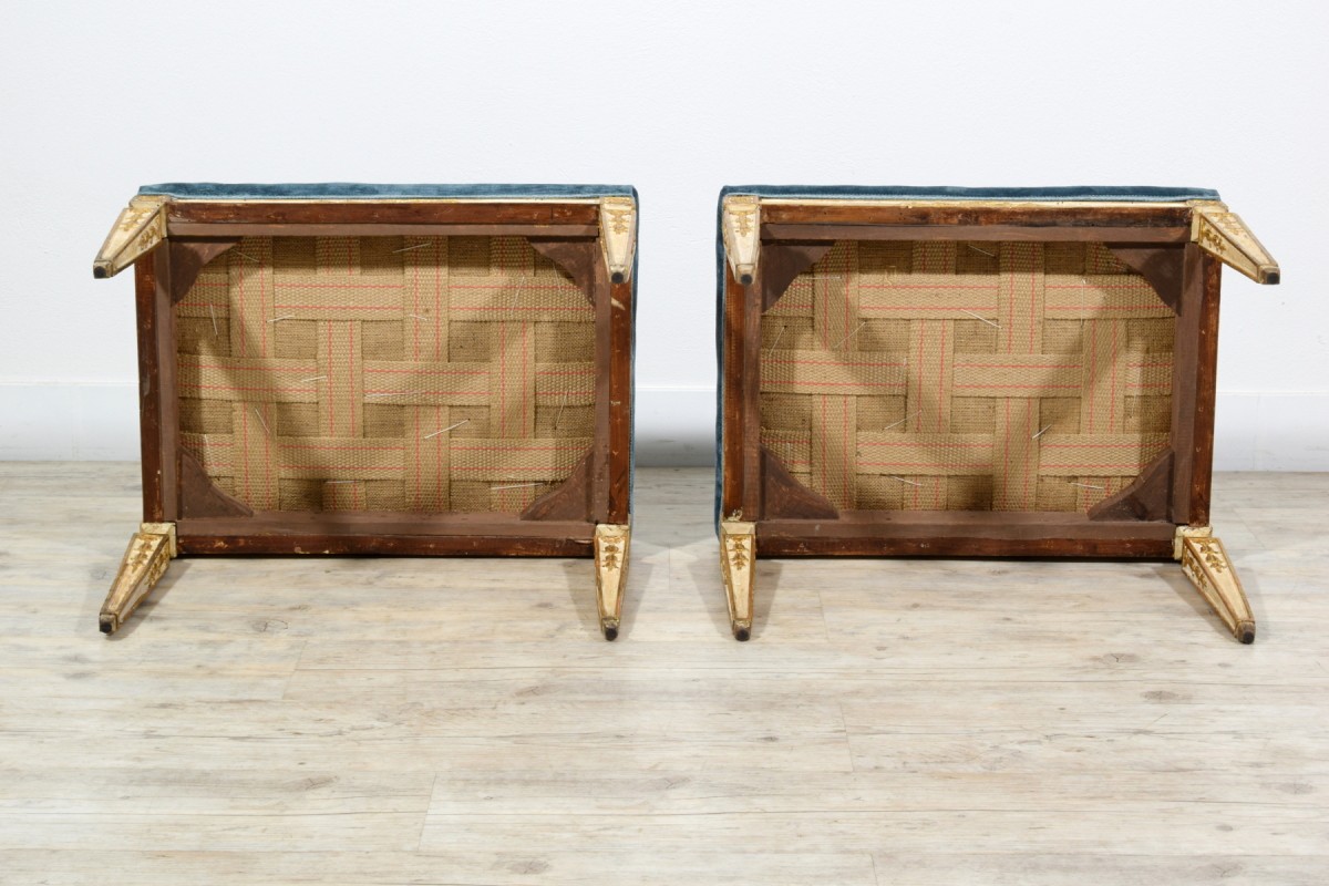 The rectangular seats are upholstered in blue velvet fabric, which is in good condition. The structure is made of carved wood, lacquered and gilded à la mecca, and decorated on all four sides. The lacquer retains an excellent authentic patina.