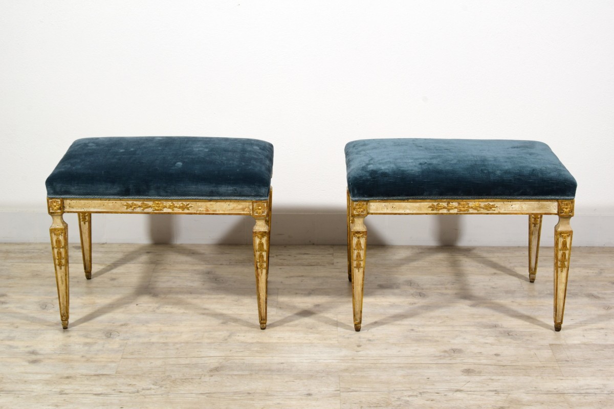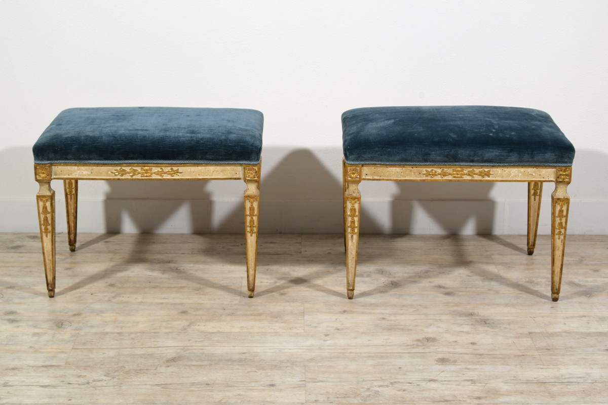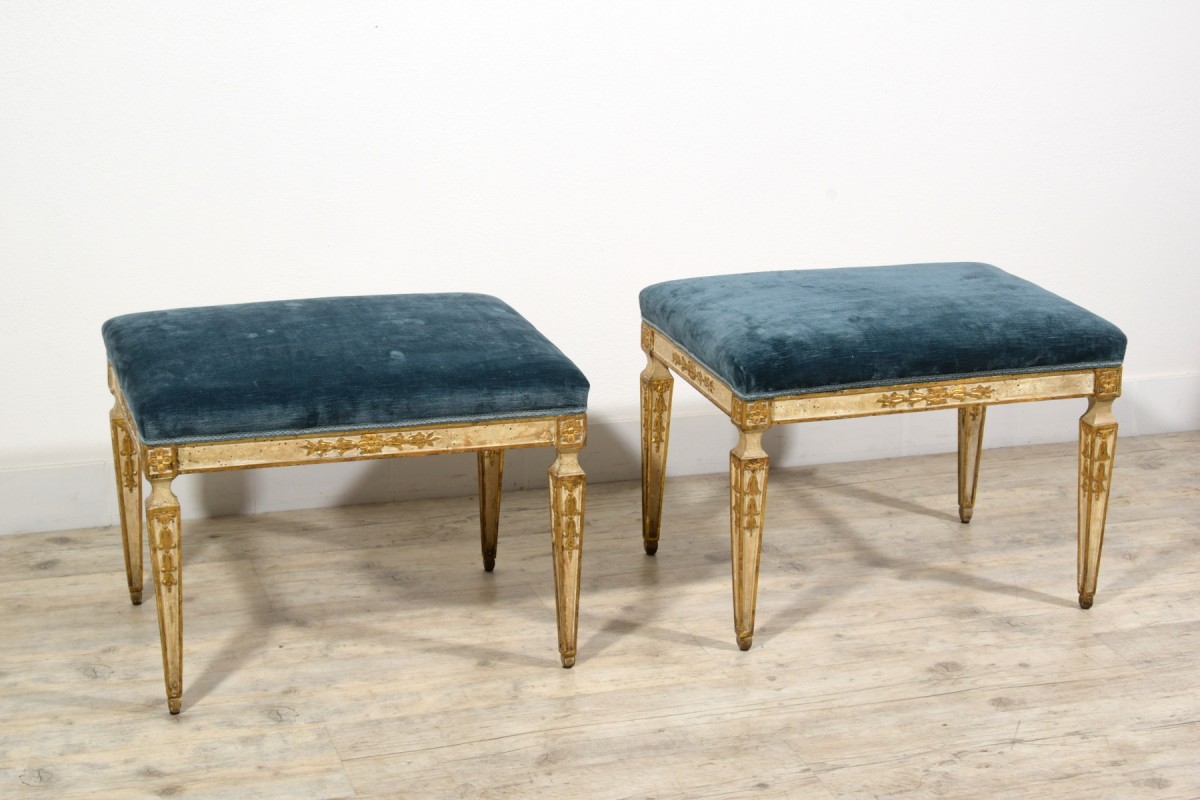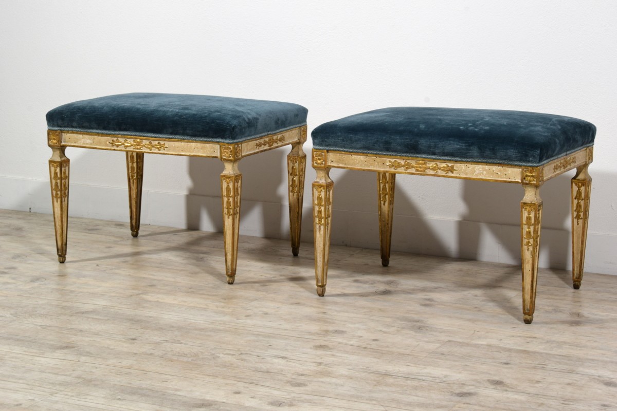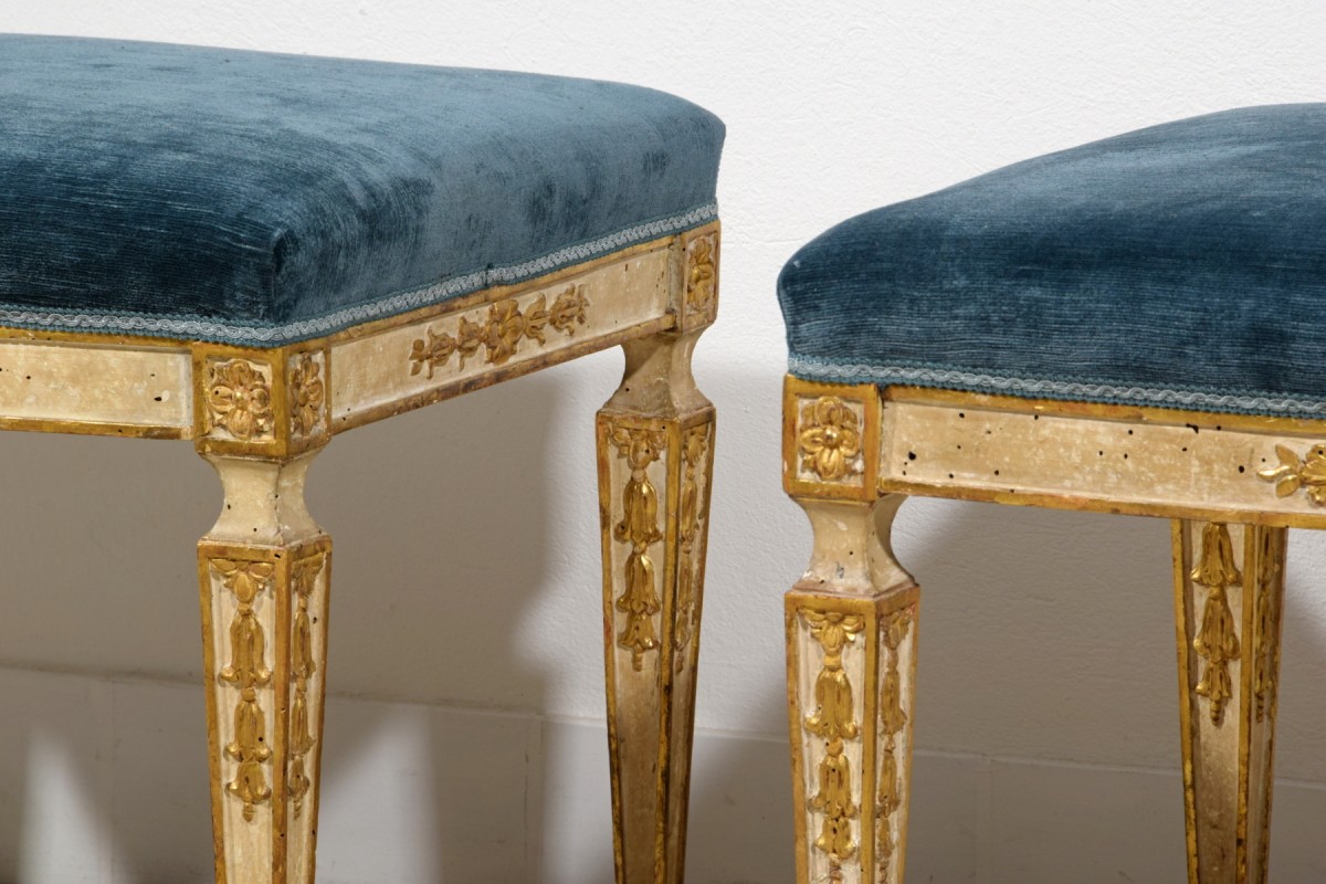 This pair of center stools was made in Naples towards the end of the 18th century, during the Neoclassical period.