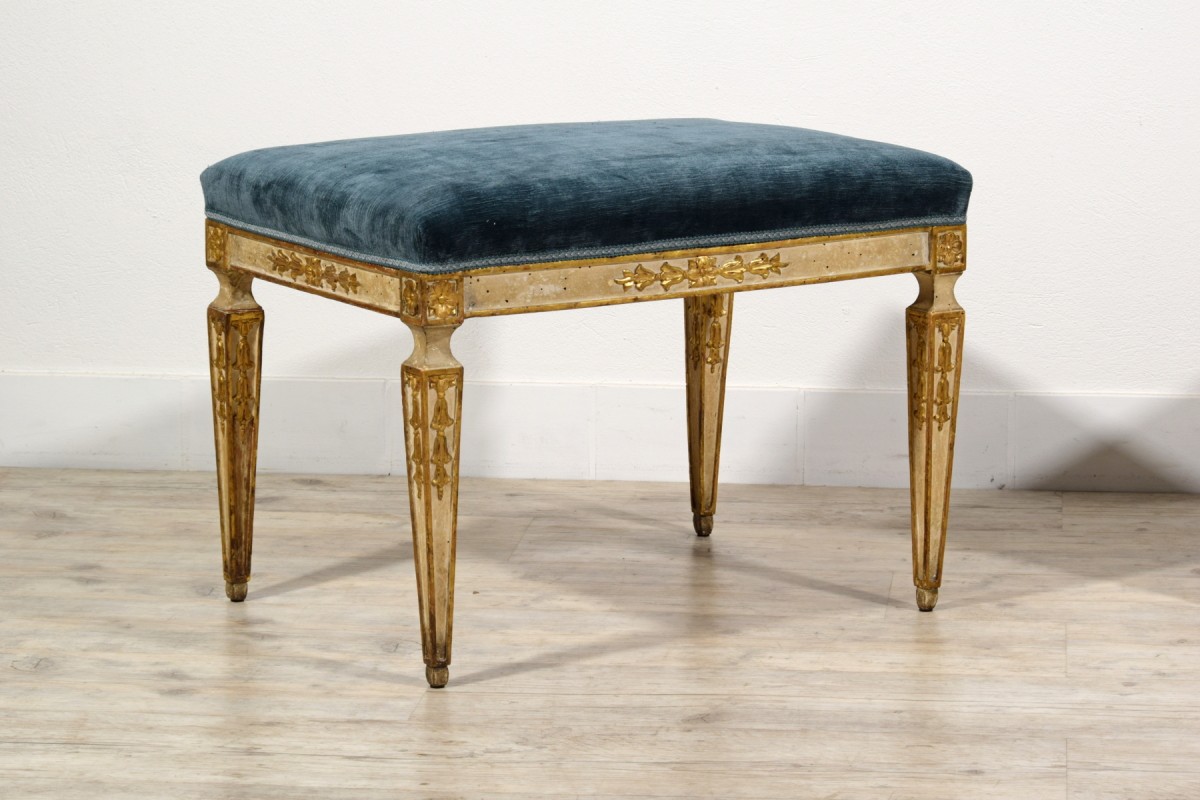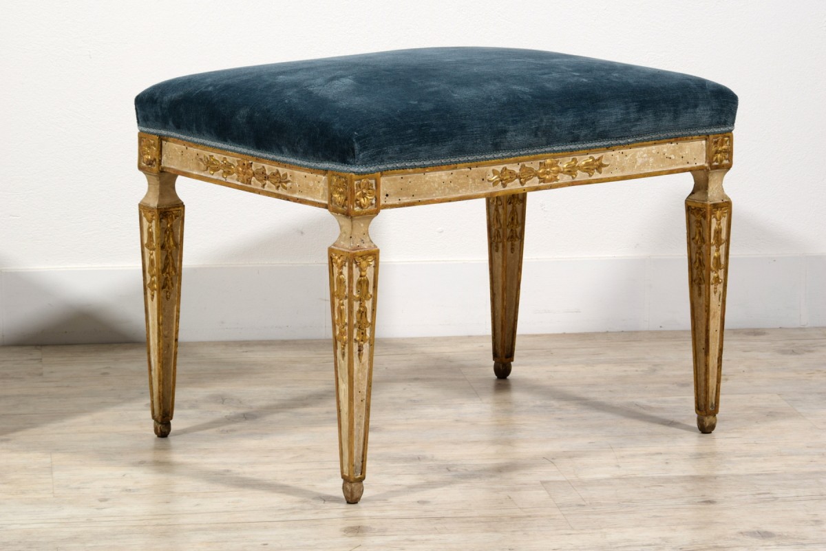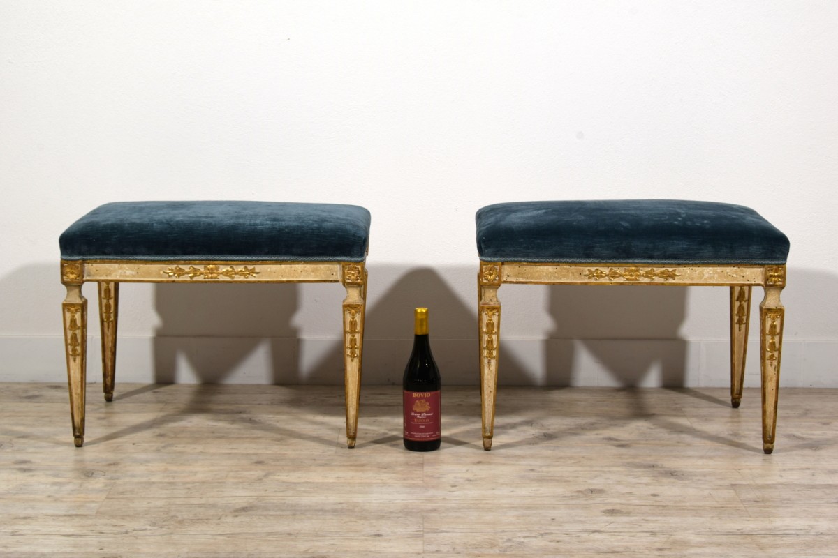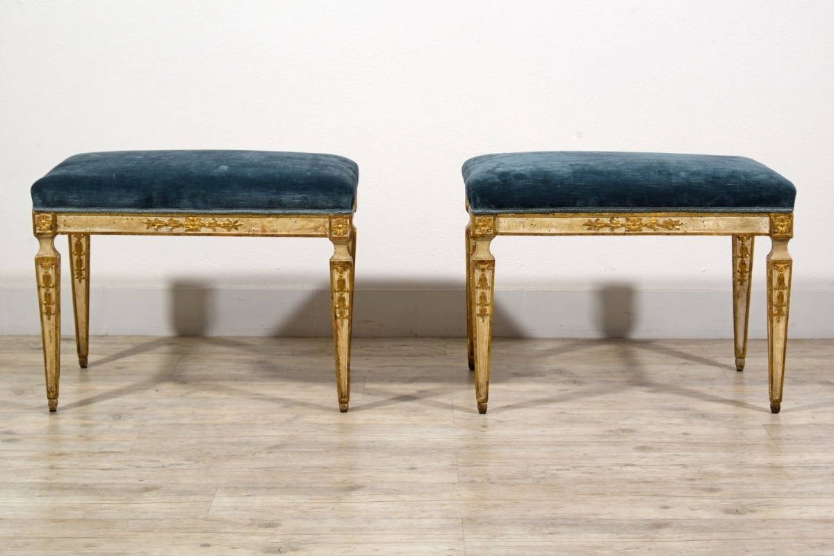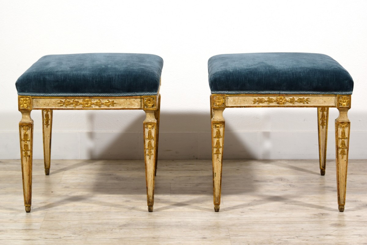 This pair of center stools was made in Naples towards the end of the 18th century, during the Neoclassical period.