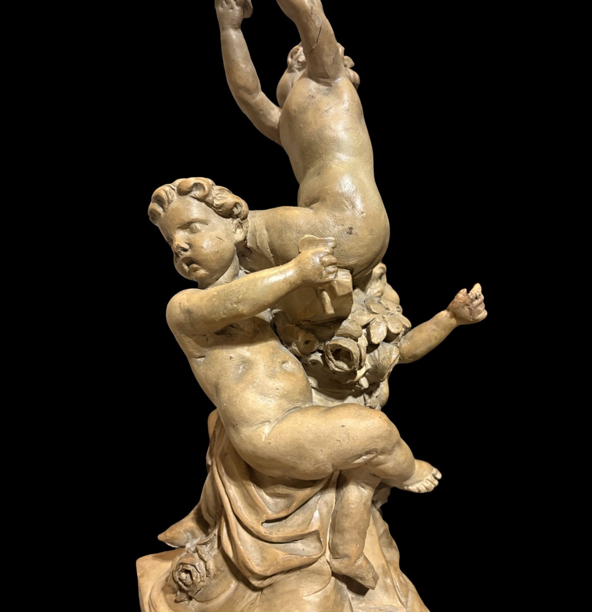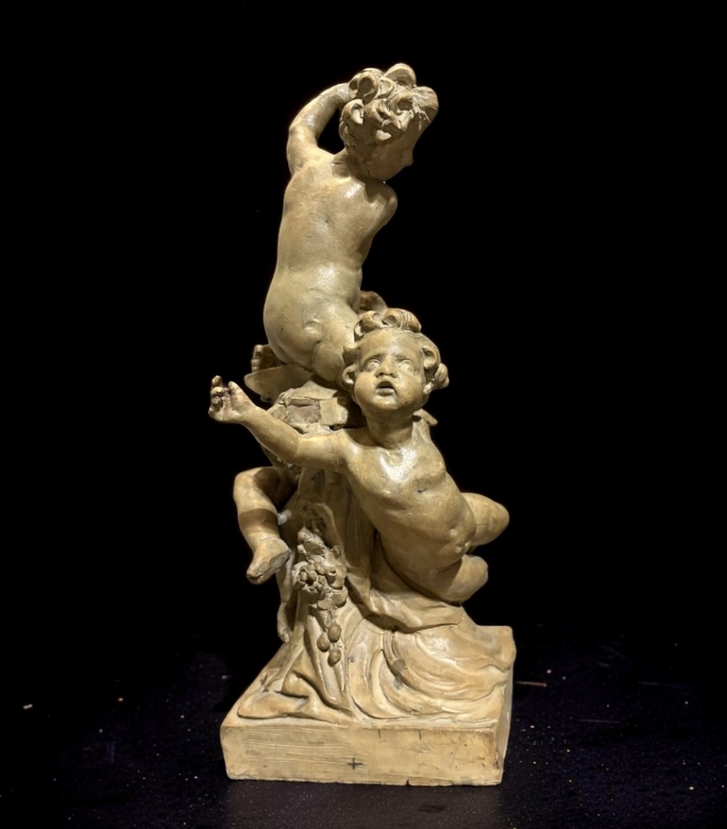 His work reflected the decorative language widespread in northern Italy in the 17th century, combined with a typically Venetian vivacity that appealed to popular taste and earned him a large following, especially among the decorators of monasteries in the Vienna area. Giuliani created numerous sculptures, working primarily in wood and terracotta, but also in stone, marble, and bronze. He used terracotta in particular to create numerous sketches, many of which are now housed at the Liechtenstein Museum in Vienna. Our sketch depicts an allegorical subject, presumably the allegory of Music: the group of three cherubs, modeled with exceptional mastery, features figures stacked one on top of the other in an ascending formation; the three, in dynamic poses, hold three key elements: an anvil, a hammer, and a bell. According to legend, Pythagoras discovered musical consonances while passing by a blacksmith's workshop and noticing that hammers of different weights produced harmonious sounds when striking the anvil. The bell, on the other hand, symbolizes the spreading sound.