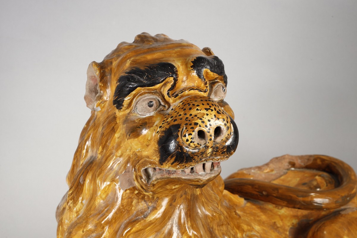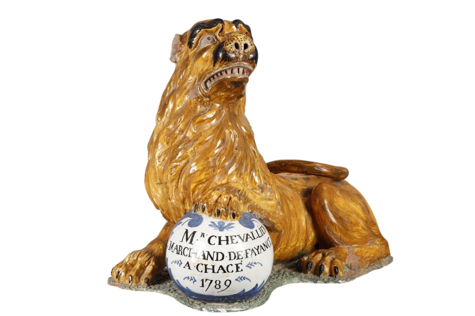Rare and large reclining lion in Nevers faience, resting its paw on a sphere inscribed: “Mr CHEVALLIER MARCHAND DE FAYENCE A CHACE, 1789.”