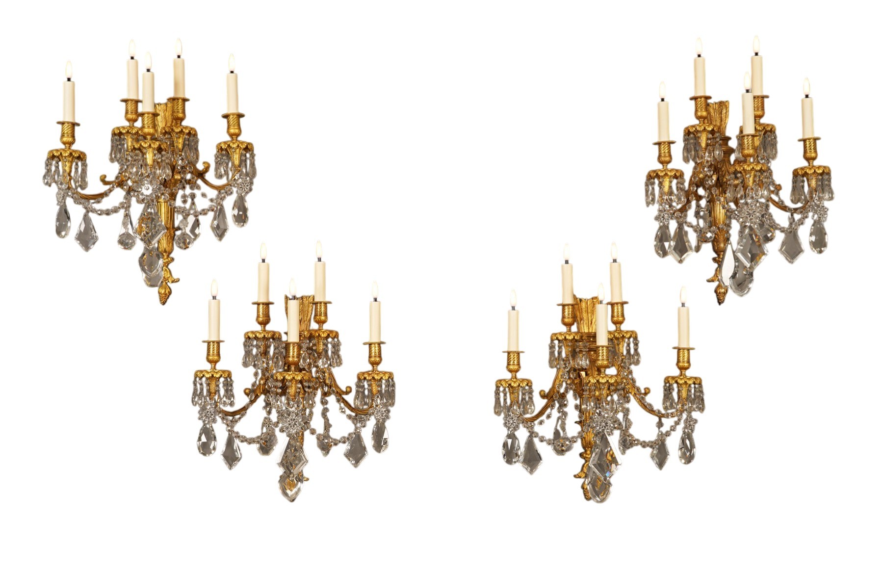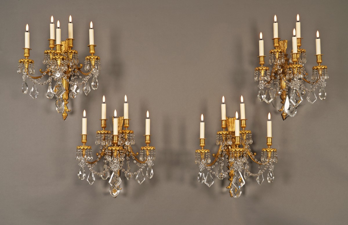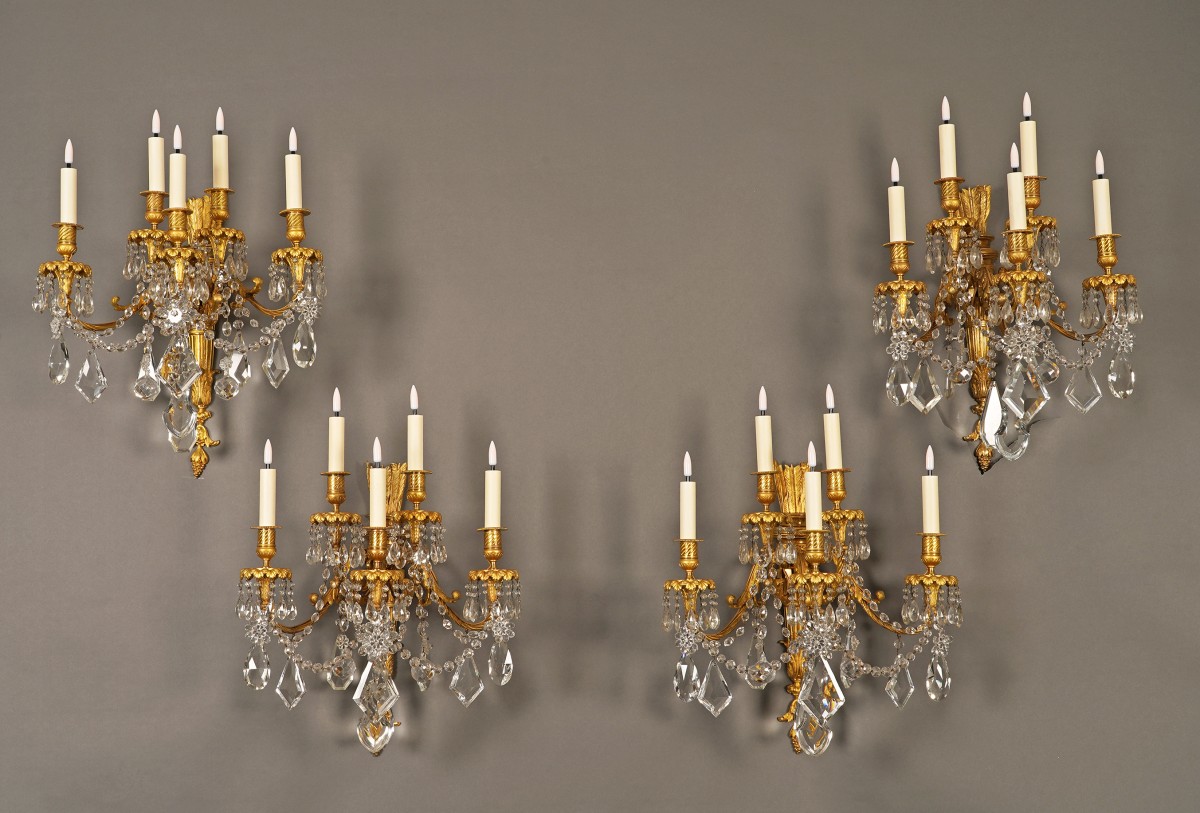 Beautiful set of four Louis XVI-inspired wall-lights, crafted in chased and gilded bronze with Baccarat crystal, each with five lights. They are symmetrically composed with five twisted arms highlighted by scrollwork and ending in acanthus leaves, arranged around a central quiver-shaped stem with fluted channels adorned with stylized acanthus leaves terminating in a seed motif. All these decorative elements reflect the neoclassical ornamentation fashionable during the reign of Louis XVI. The ensemble is further embellished with numerous drops, prisms, bead garlands, and small flowers in cut and faceted Baccarat crystal.
