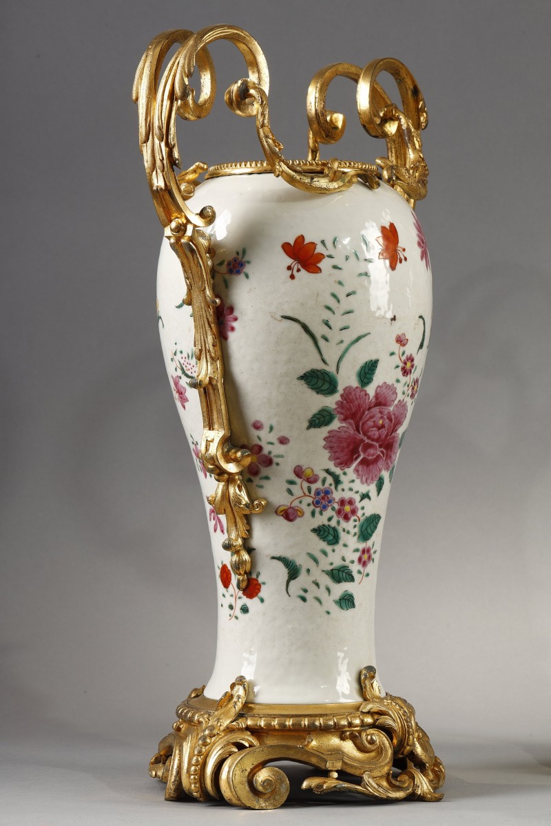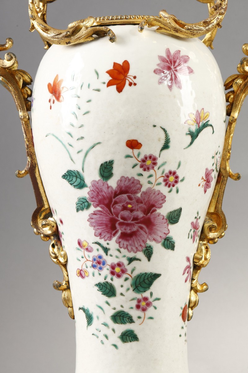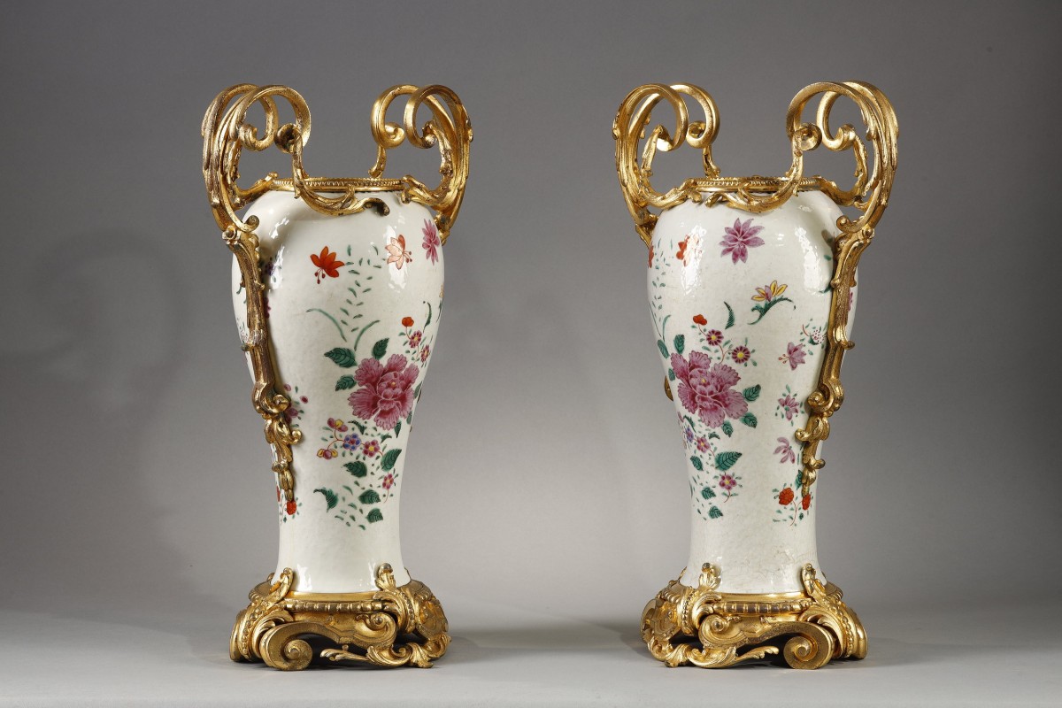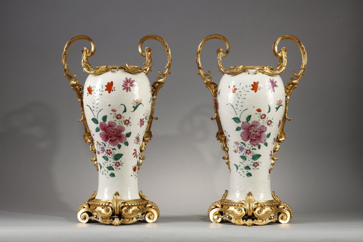 Each piece has been richly adorned with a sumptuous gilt-bronze mount. The neck is lavishly encircled by a pearl necklace. The double-scroll handles, with their finely chiseled rocaille motifs, They delicately follow the baluster shape.