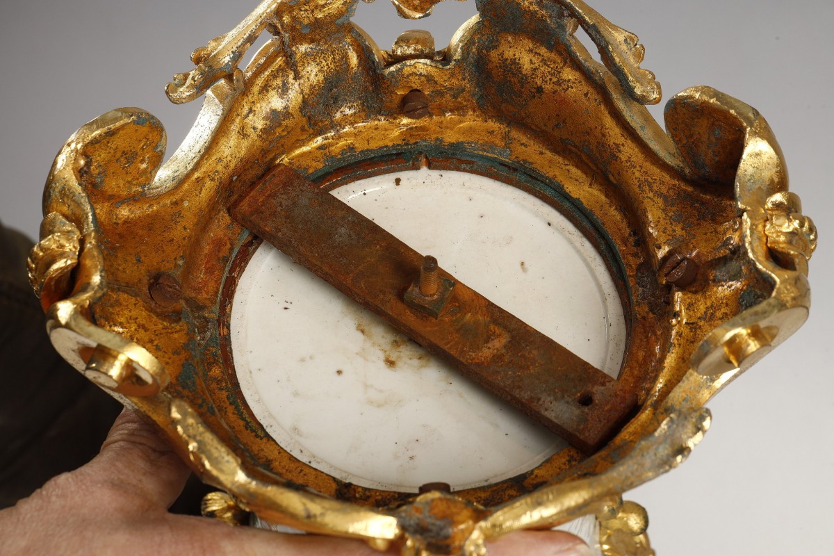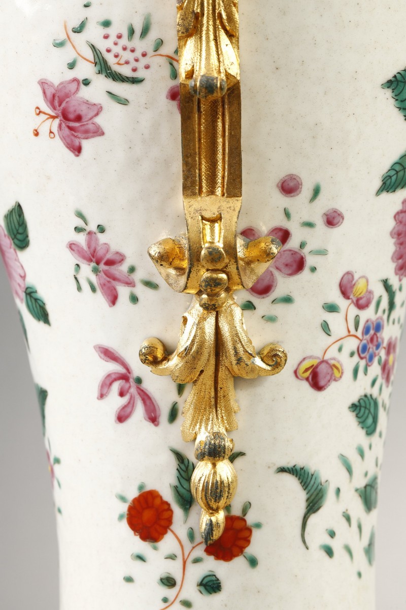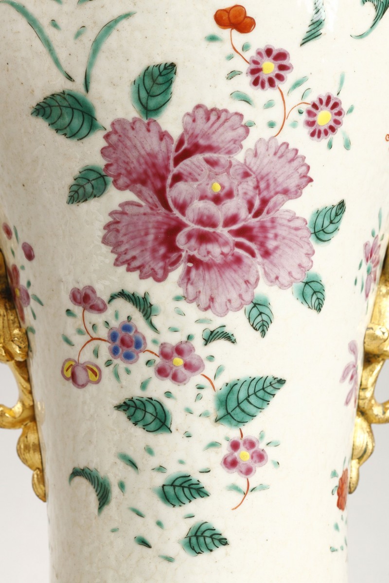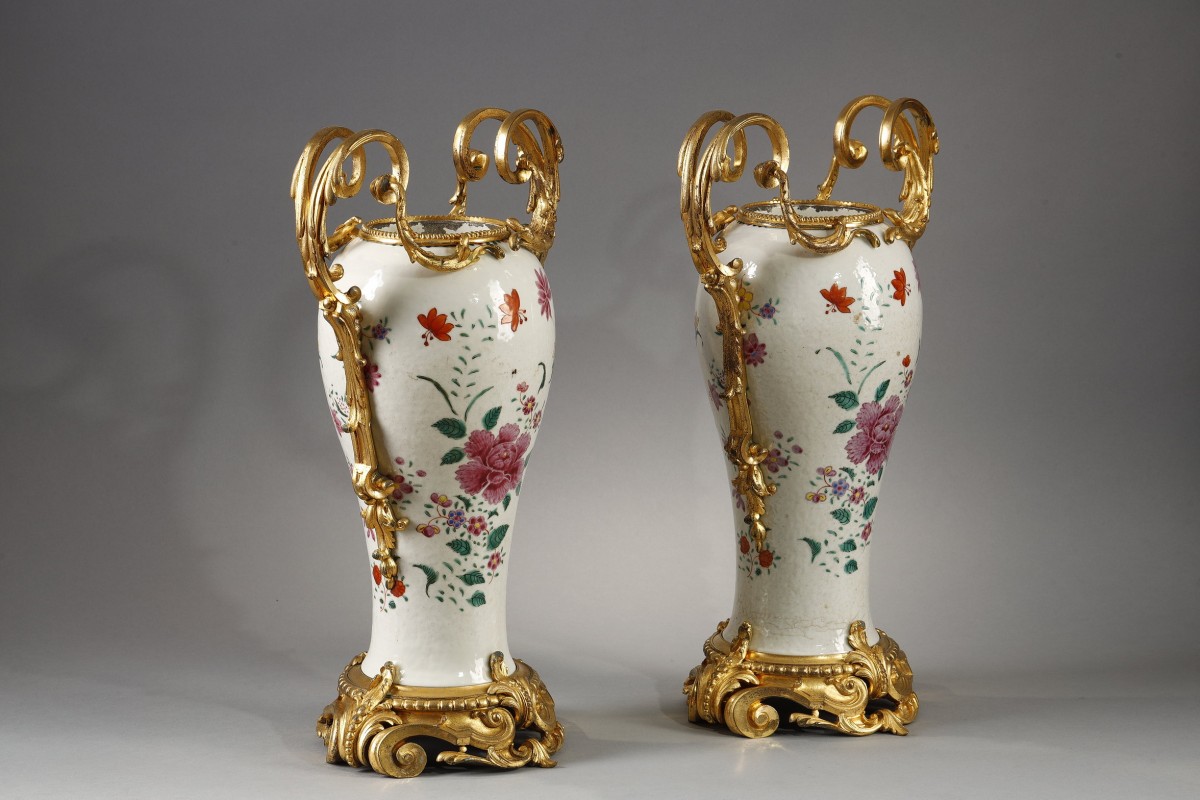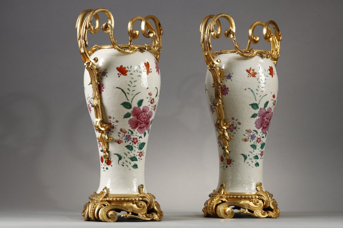 Each piece has been richly adorned with a sumptuous gilt-bronze mount. The neck is lavishly encircled by a pearl necklace. The double-scroll handles, with their finely chiseled rocaille motifs, They delicately follow the baluster shape.
