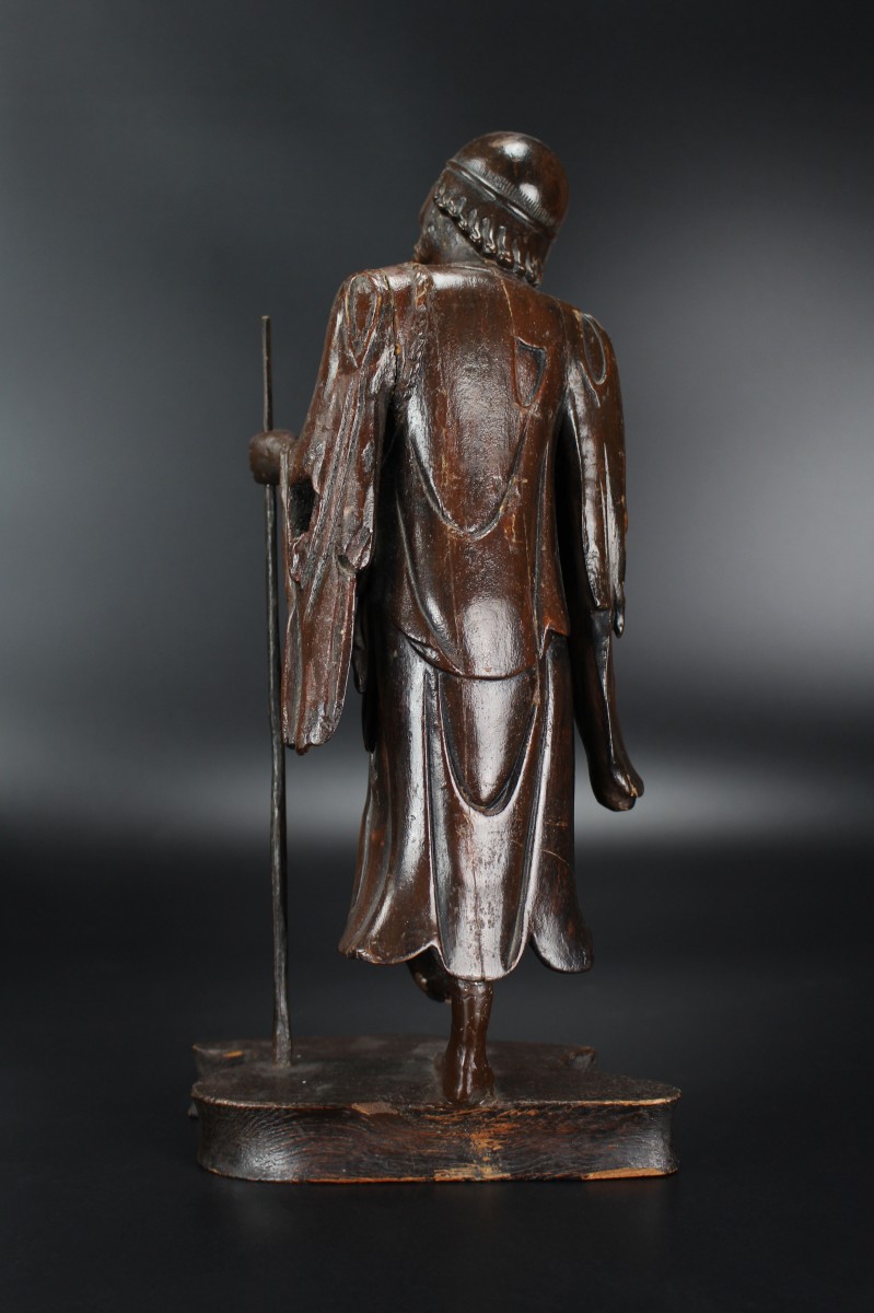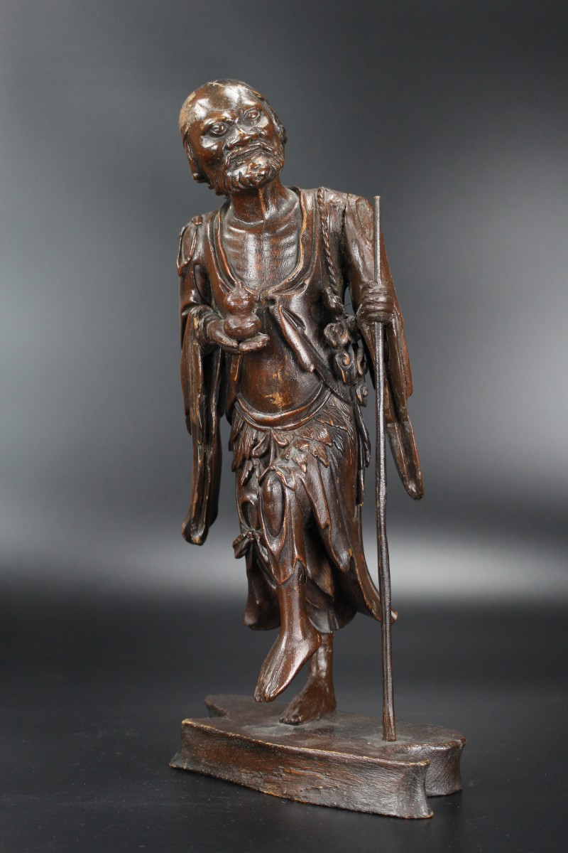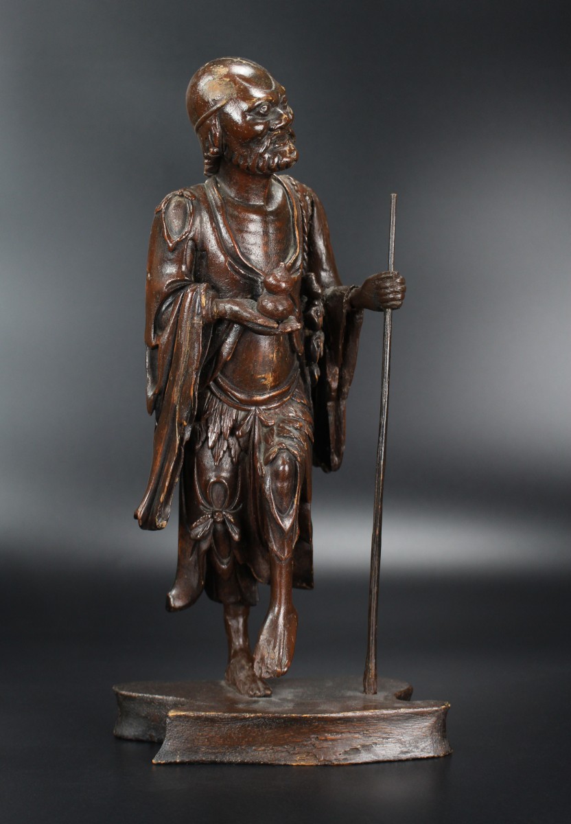 The style of carving is reminiscent of Chinese Ming bronzes and Blanc de Chine figures from the late Ming, for instance compare with a Ming bronze figure of Li Tieguai in The Cleveland Museum of Art, museum number 1973.158.