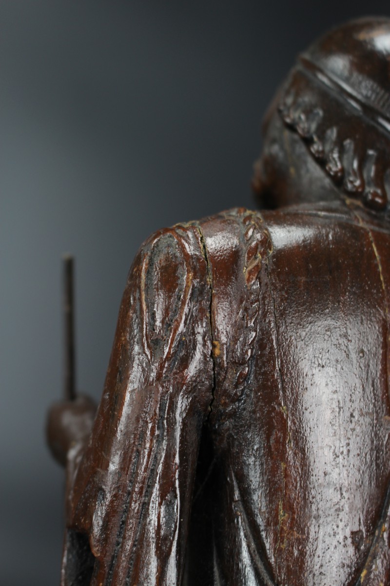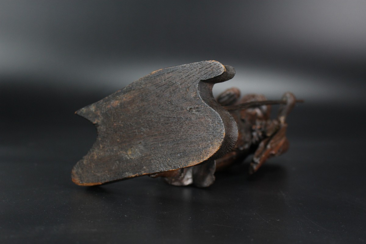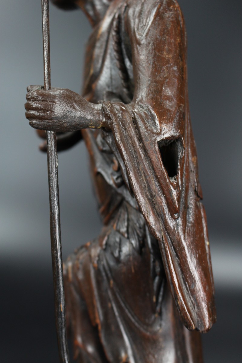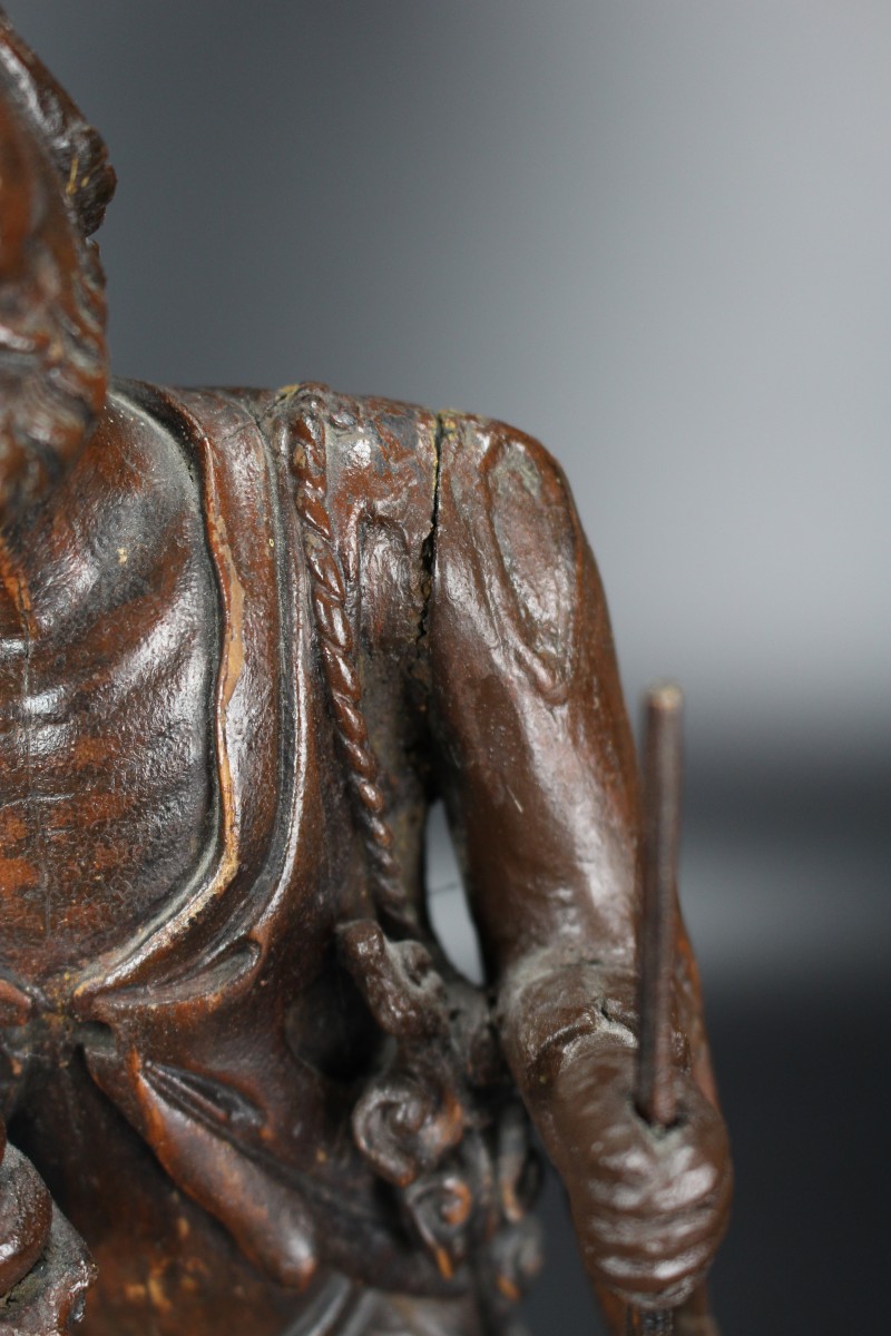 The style of carving is reminiscent of Chinese Ming bronzes and Blanc de Chine figures from the late Ming, for instance compare with a Ming bronze figure of Li Tieguai in The Cleveland Museum of Art, museum number 1973.158.