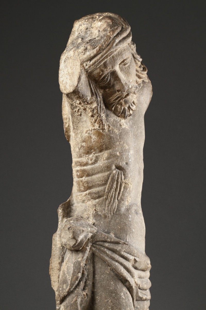 cf: The head of Christ, characterised by a serene facial expression and almond-shaped eyes fixed downwards. The delicately and sensitively carved torso reveals his ribs beneath Christ’s skin. Undoubtedly, this sculpture originated from a church, likely part of a larger crucifixion group.
