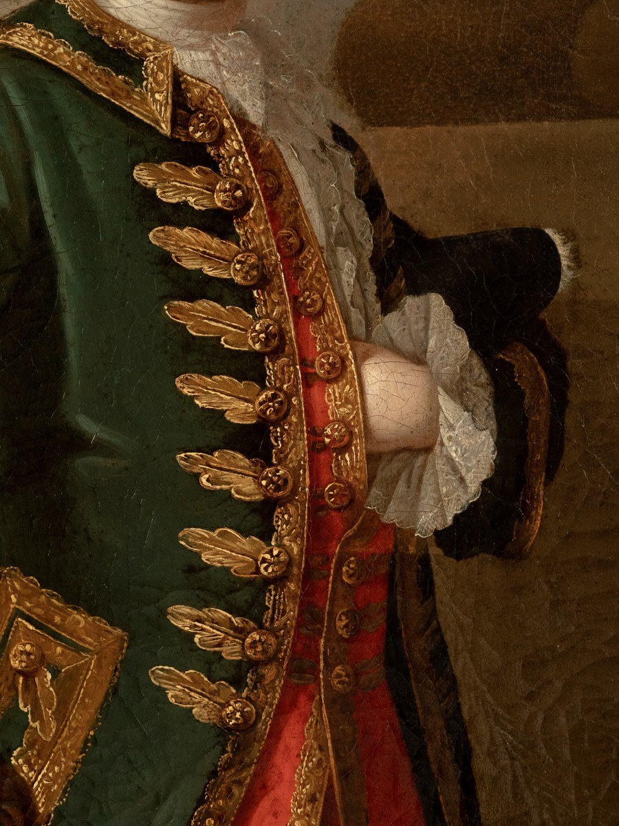 Recent medical studies have shown that Bébé's dwarfism was merely a symptom of a deeper condition. He was almost certainly afflicted with progeria or Hutchinson-Gilford syndrome: very rare genetic diseases that cause striking physical changes (notably dwarfism) as well as very rapid aging. Indeed, from the age of 18 and standing at 89 cm tall, Bébé resembled an old man: he had difficulty moving and breathing, caught colds easily, and seemed tired of everything. In 1764, he fell ill with influenza and died in his mother's arms at the age of 23. Deeply affected by Bébé's death, Stanislas had him given full funeral honors before ordering an autopsy and bequeathing his body to the King's cabinet. It was the Count of Buffon (a great naturalist of his time, whose Natural History is often compared to Diderot and D'Alembert's Encyclopedia) who received the skeleton and had it mounted. It is still preserved and studied today in the collections of the National Museum of Natural History in Paris. The Faculty of Medicine in Montpellier, for its part, holds a wax statue of Bébé wearing his own hair and clothes. This piece is believed to have been molded during Nicolas Ferry's lifetime. At the Musée Lorrain in Nancy, there is his wooden house and cutlery made to his size. Finally, the Château de Lunéville, where he spent most of his life, housed a life-size statue in Lunéville faience as well as a portrait identical to the one we are presenting today, attributed to Jean Girardet, a talented local painter who was "Painter in Ordinary to the King of Poland" in 1758. However, both of these works were destroyed in a fire at the château in 2003. By comparing the two paintings, we can surmise that our canvas is another contemporary version of the lost one from Lunéville. Perhaps commissioned at the same time by Stanislas to adorn another of his castles, as a gift for a loved one, or intended for wider distribution. Indeed, court dwarfs were still very fashionable "accessories" among the aristocracy in the 18th century. A testament to the humanism, nobility, and wealth of their patrons, it was not uncommon for their portraits and stories to be circulated to extol the virtues of those to whom they owed everything.