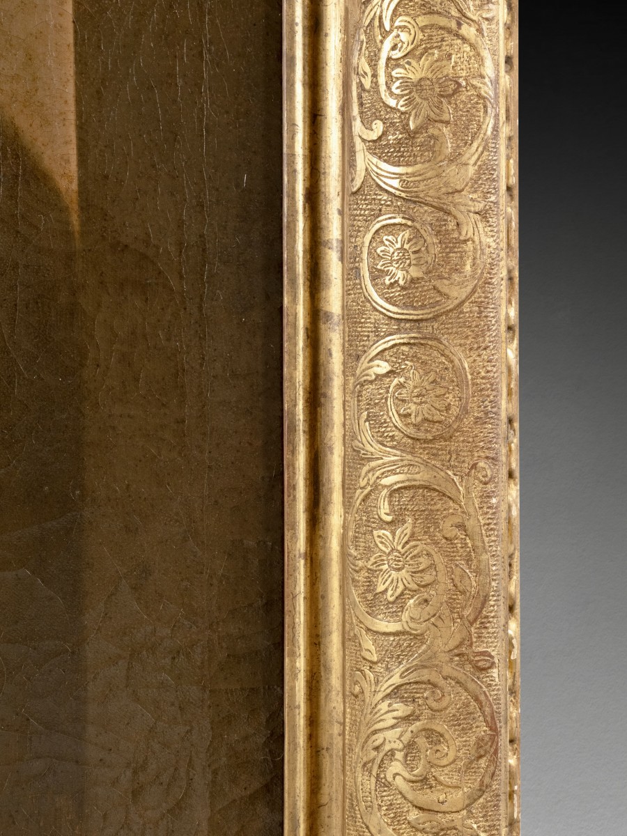 Beautifully crafted in a finely carved, engraved, and gilded Regency period oak frame.