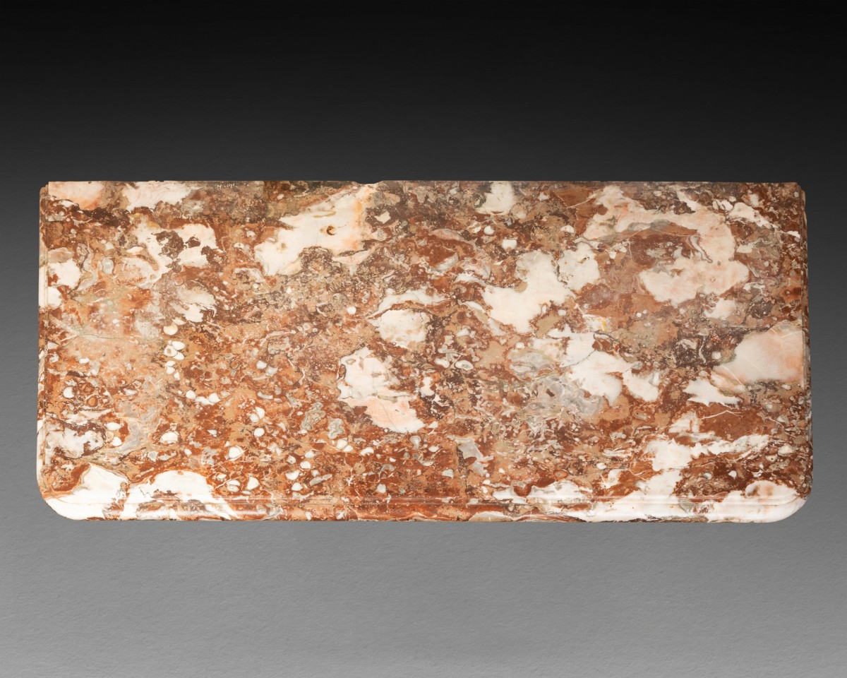 This is a wide console table with four curved legs, supported by four crossbars, three of which are carved, openwork, and gilded. The front crossbar features, in its central section, an openwork shell framed by two checkered panels decorated with foliage and flowers. The four legs, decorated with inverted shells at the top, all feature large, leaf-shaped feet supported by spindles. The piece is topped with a wide marble top known as “Rouge de Rance.”