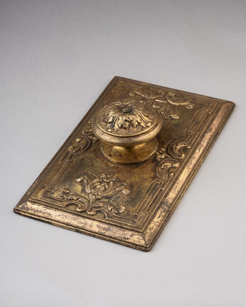 The partial chasing of this paperweight creates a contrast between broad burnished surfaces and cartouche grounds matted with a pointed tool, combined throughout with elegant symmetrical rinceaux. It thus relates to the rare documented gilt bronzes and so-called serrurerie works of the late Louis XIV period, notably the highly wrought lock plates executed around 1710 by Ducoudray and Desjardin for the royal tribune of the Chapel at Versailles.