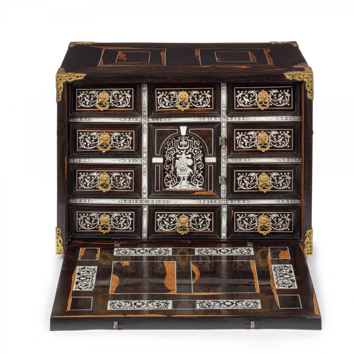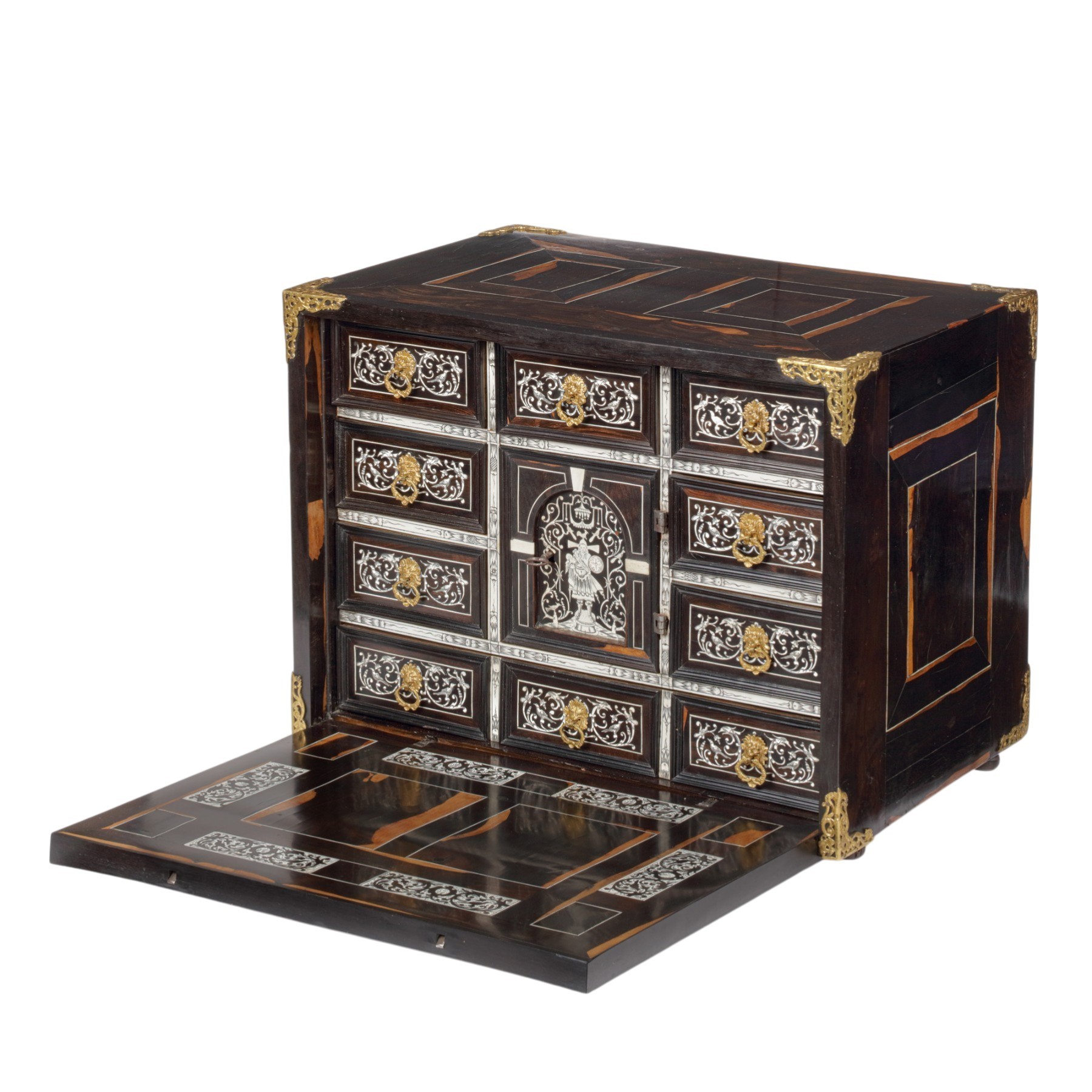 Softwood, ebony, rosewood, drawers made of walnut, with engraved ivory scenes.