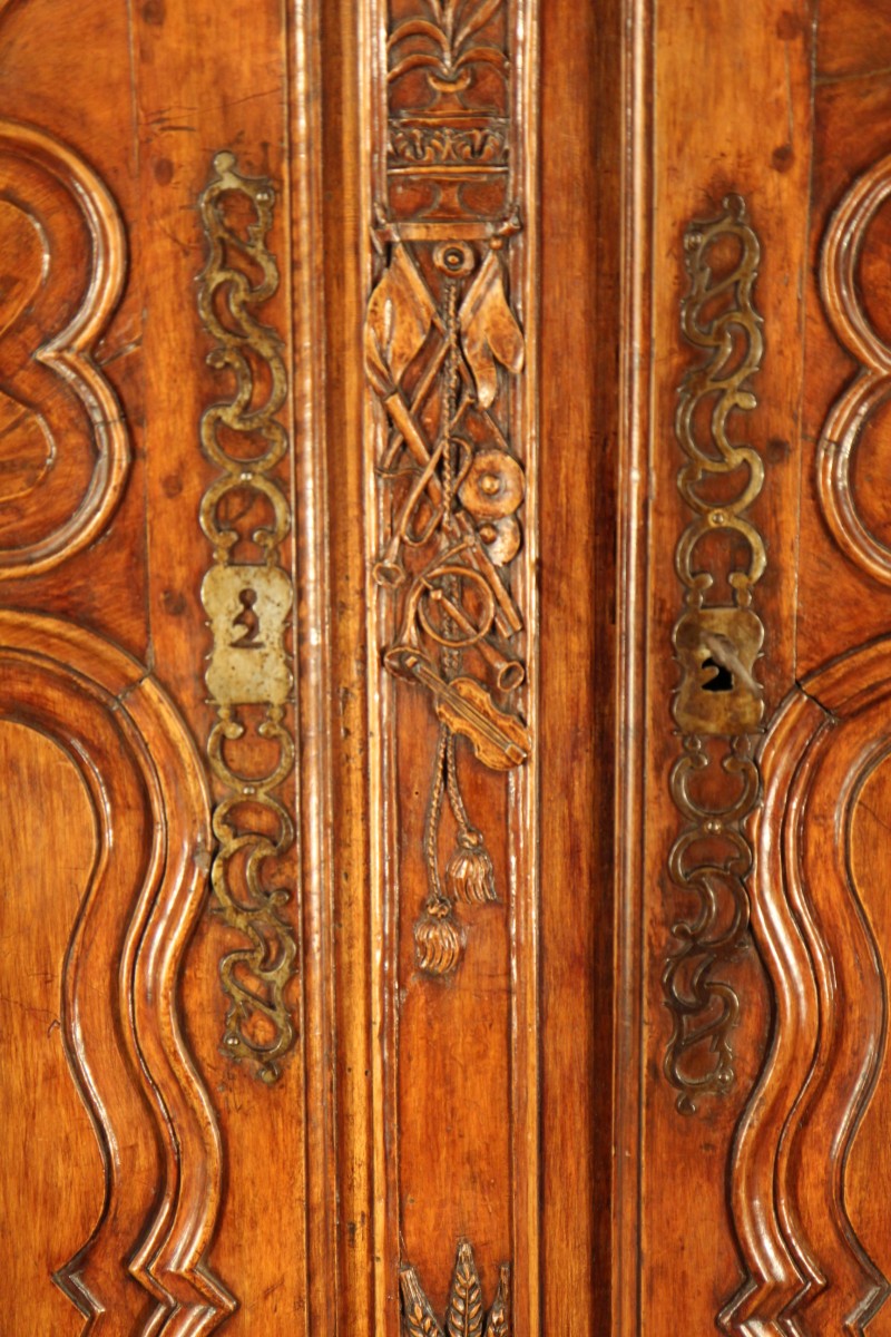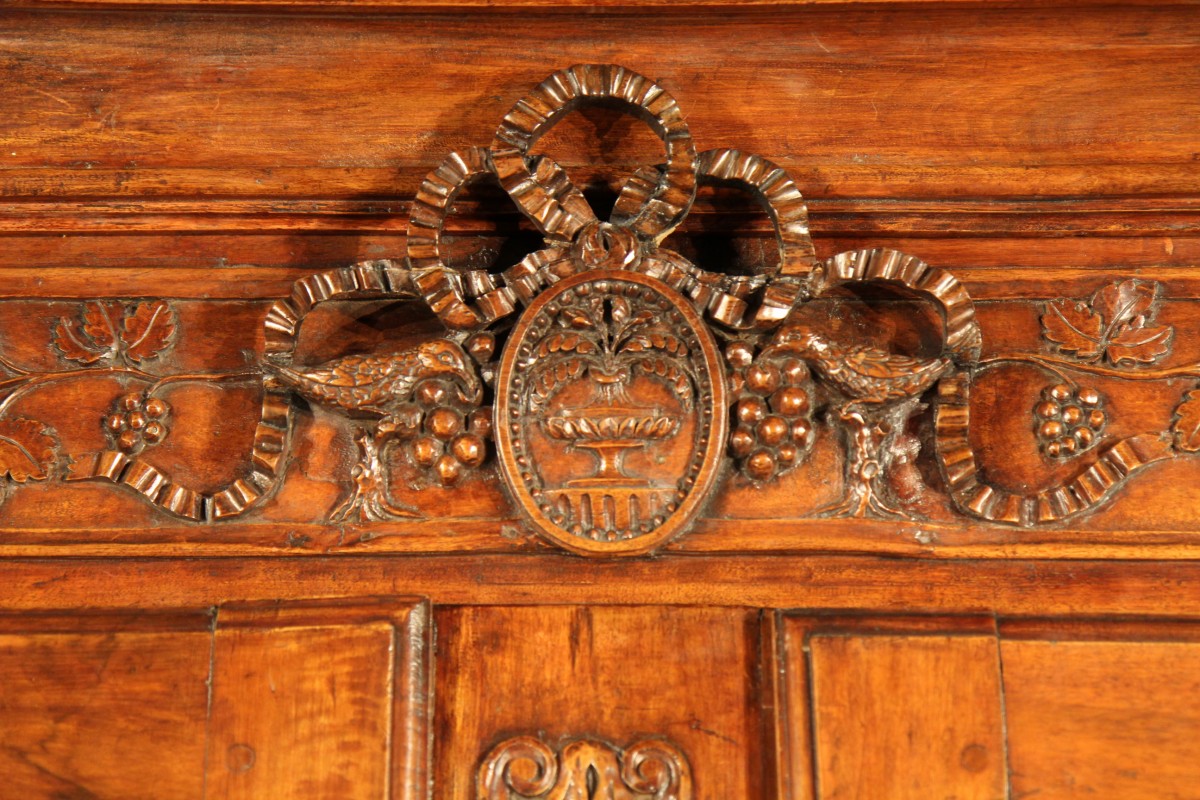 18th C Provencal wedding armoire (wardrobe). According to tradition, the front is richly carved with vine branches, wedding ribbons, and a pair of doves on the pediment; musical instruments and ears of wheat on the piece between the doors; and finally, a basket of fruit and oak branches garnished with acorns on the low crossbar.