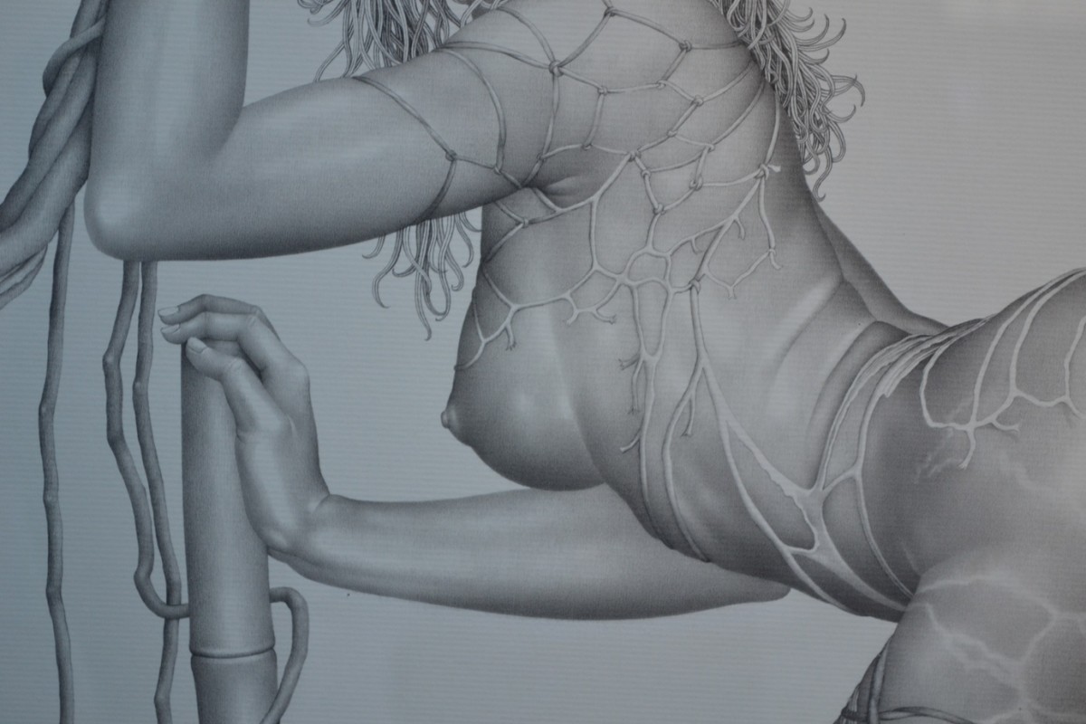 Graphic drawing on paper depicting a young Asian woman in a tropical setting, surrounded by vines and bamboo. The work is rendered with subtle modeling and beautiful gradations, and was executed during the artist's mature period. Signed lower right: R. Bertrand for Raymond Bertrand (born in 1945).