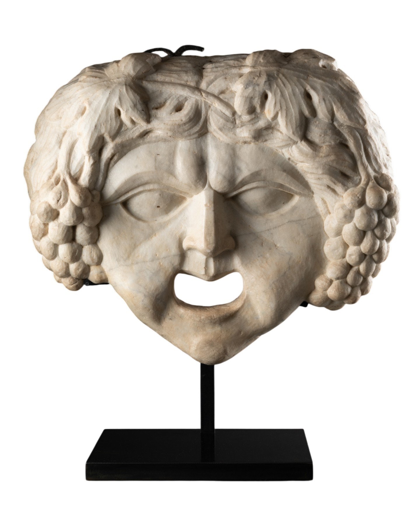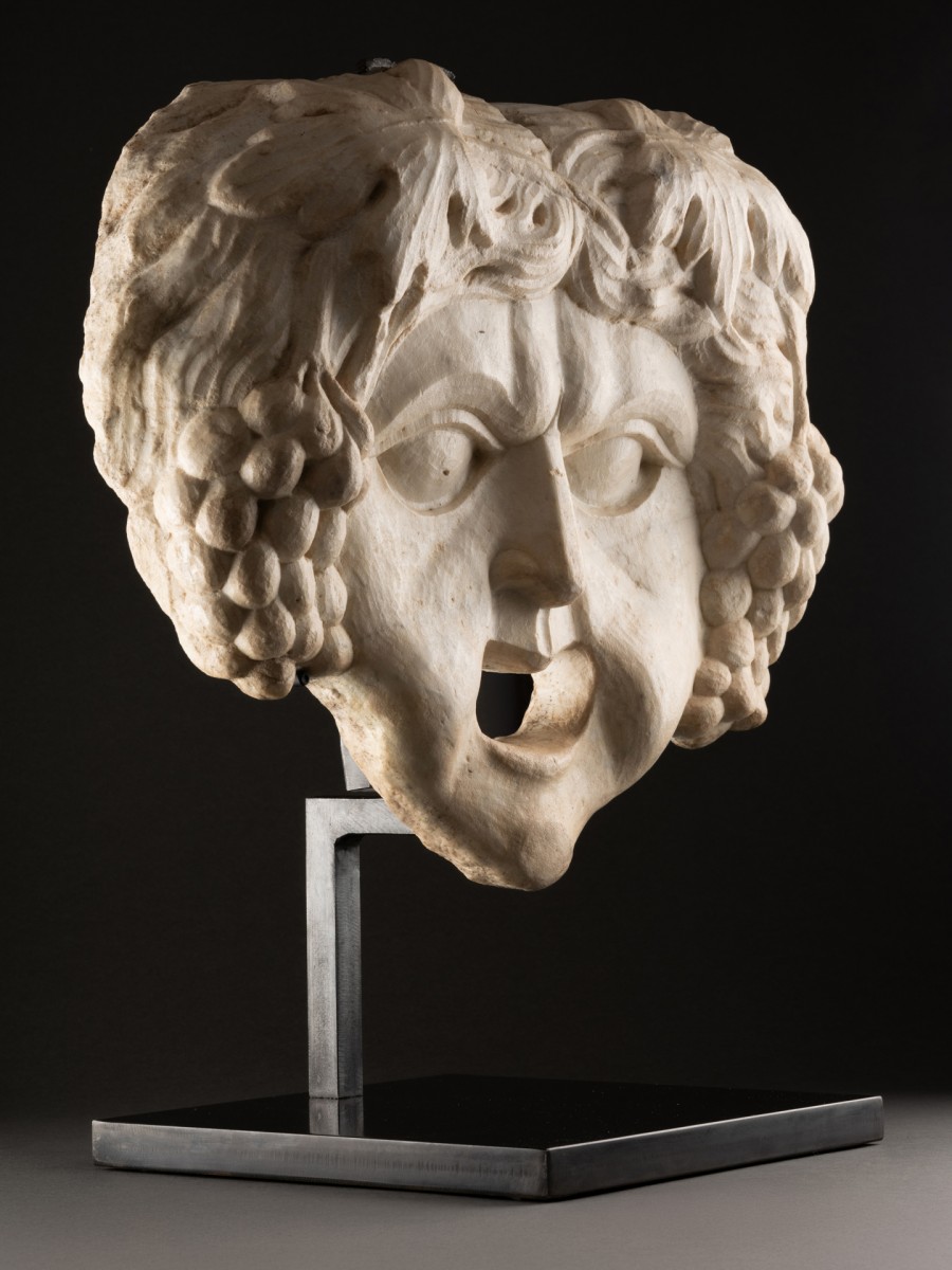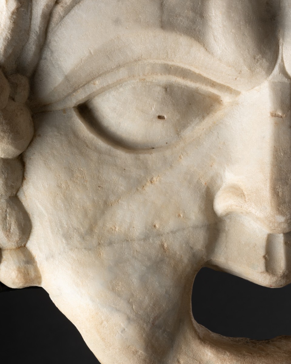 This white marble mascaron represents Bacchus, the god of wine and theater in Greco-Roman mythology. Large in size, it features a very playful expression, with a wide open mouth and large eyes whose pupils are not sculpted. This mask is faithful to the traditional iconography of the festive god and inspiration for the dramatic arts, notably in the thick hair ending in bunches of grapes, symbolizing wine and drunkenness.