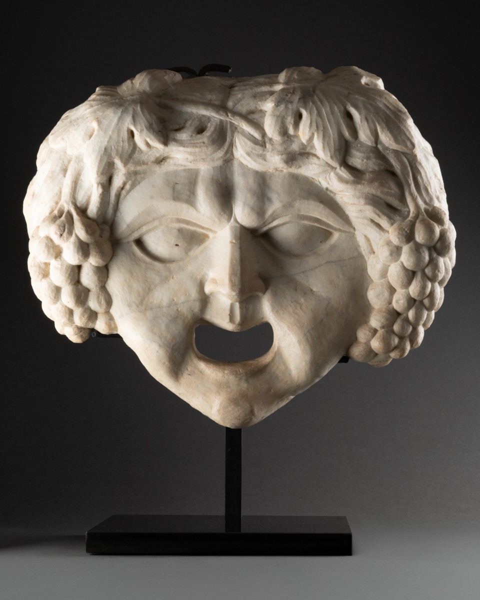 This Bacchus mask is reminiscent of the theater masks from the Roman villa of Chiragan, preserved at the Musée Saint-Raymond in Toulouse, dating mainly from the late 3rd and early 4th centuries AD.