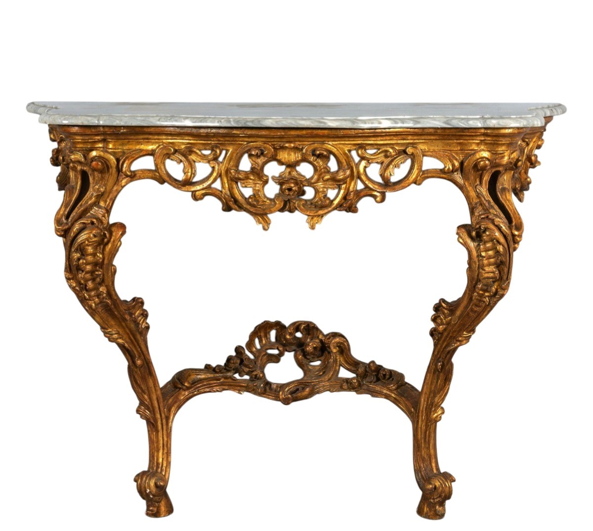 The top is in Bardiglio grey marble with a shaped and moulded edge. The apron beneath the top is particularly distinctive, made of finely carved and gilded wood, pierced at the front, on the legs, and at the sides. The rich and flowing decorations feature rocaille motifs and symmetrical phytomorphic elements, which converge in the center to form a sort of frame around a rose.