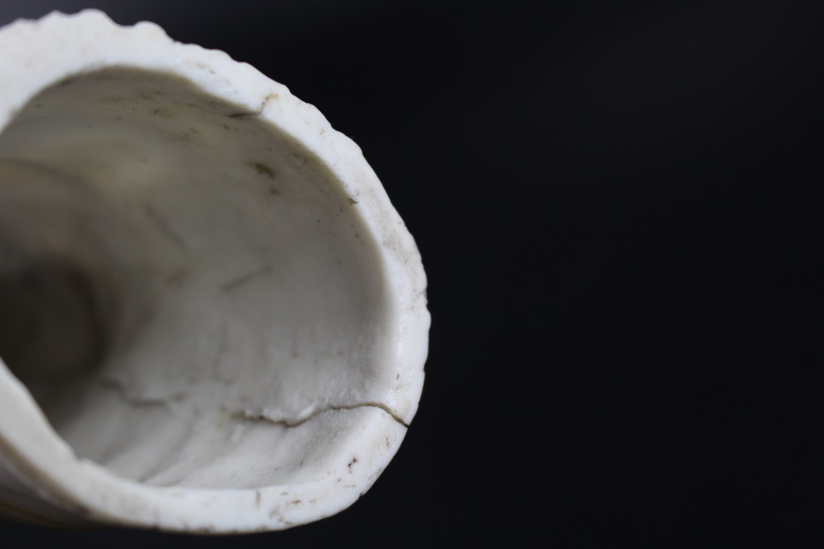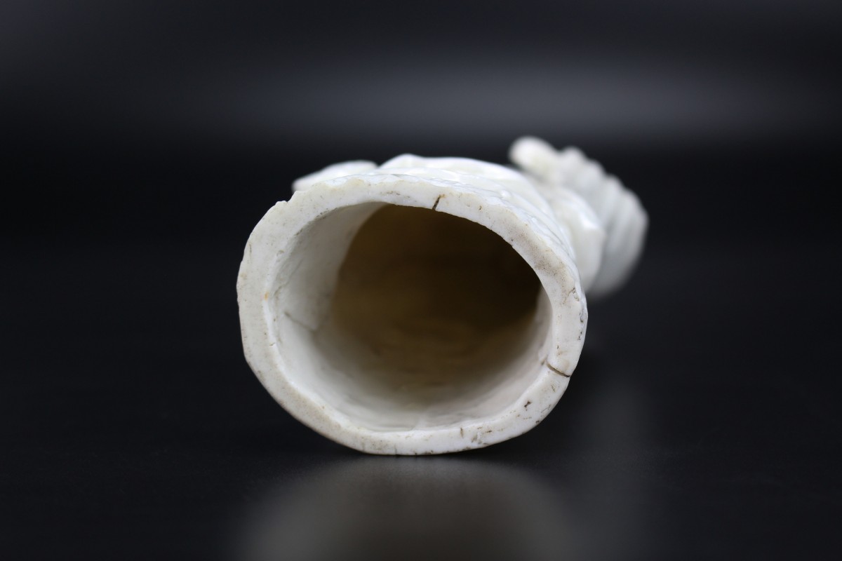 Good visual condition, with a chip to the back of the lady’s hair and some kiln flaws in the form of two pieces of kiln grit adhering to the back with glaze pulling which is also present at the middle of the right side. No additional damage found under UV light.