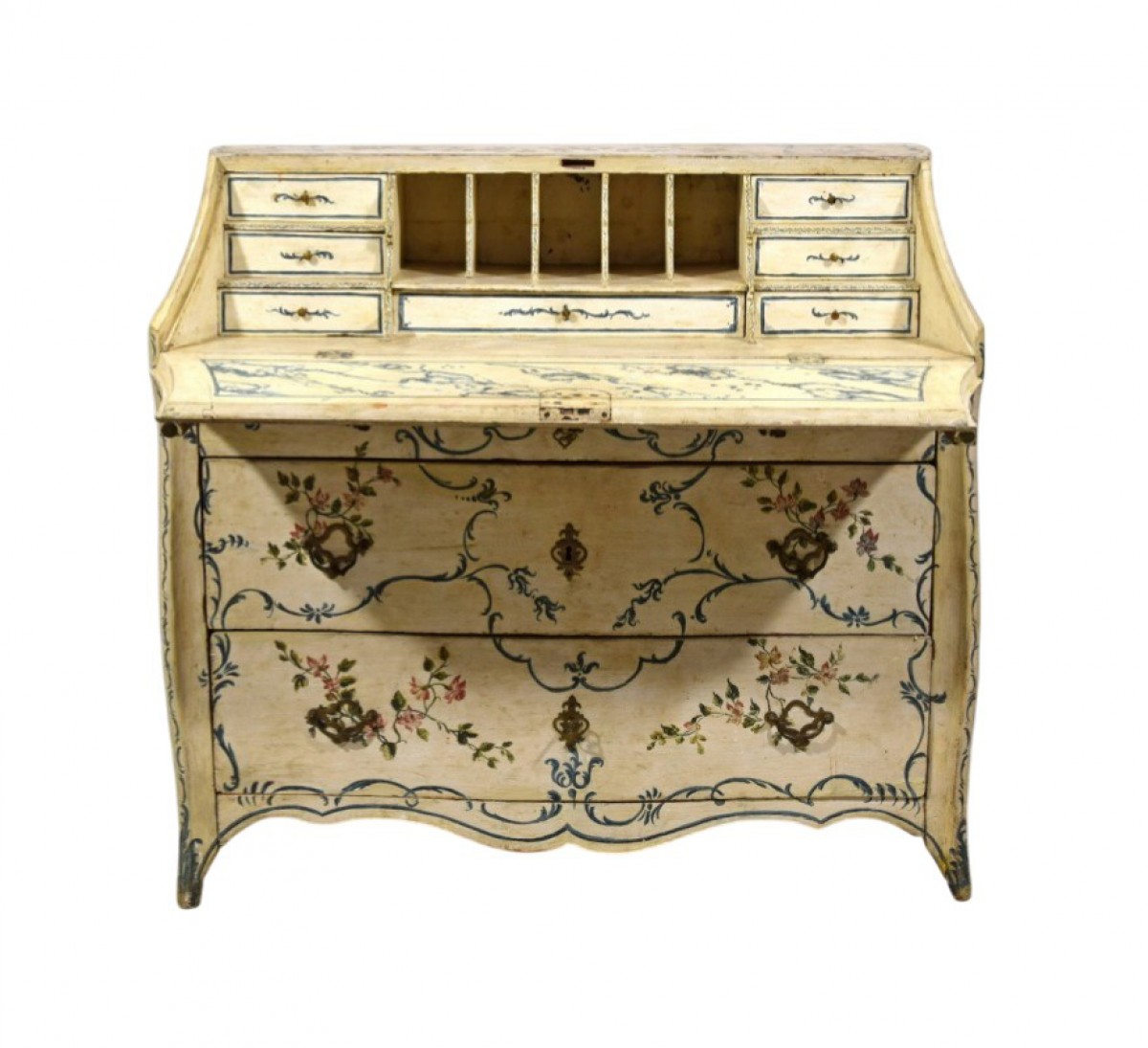 The entire surface of the chest and drop-front is lacquered in an ivory-white tone. The painted decoration is a triumph of flowering ramages and scrolls executed in shades of blue and green, enlivened by small polychrome red flower bouquets. These vegetal motifs seem to climb naturally along the profiles of the piece, framing its architecture as well as the original chased bronze handles, pulls, and escutcheons.