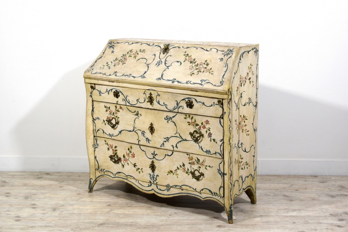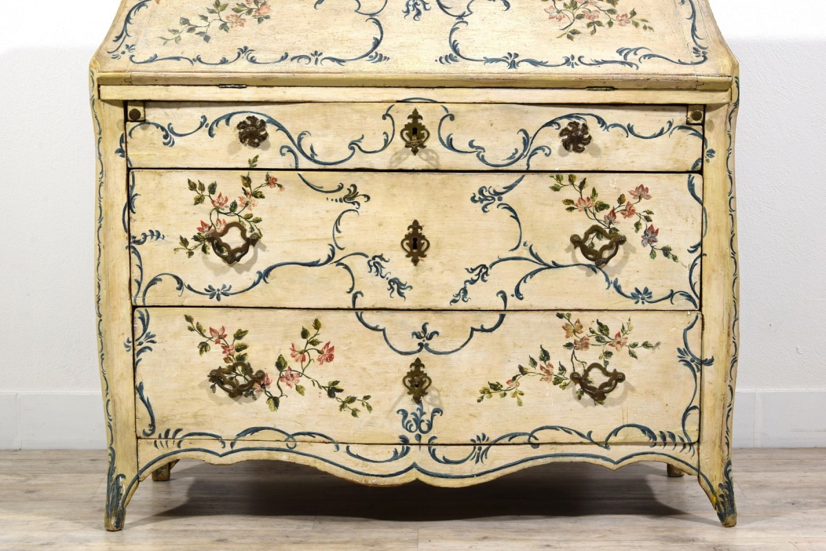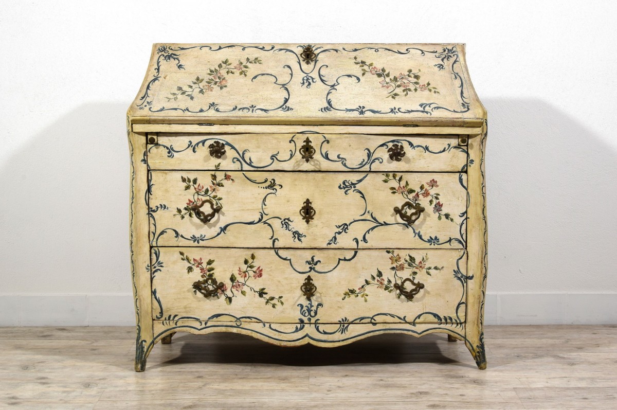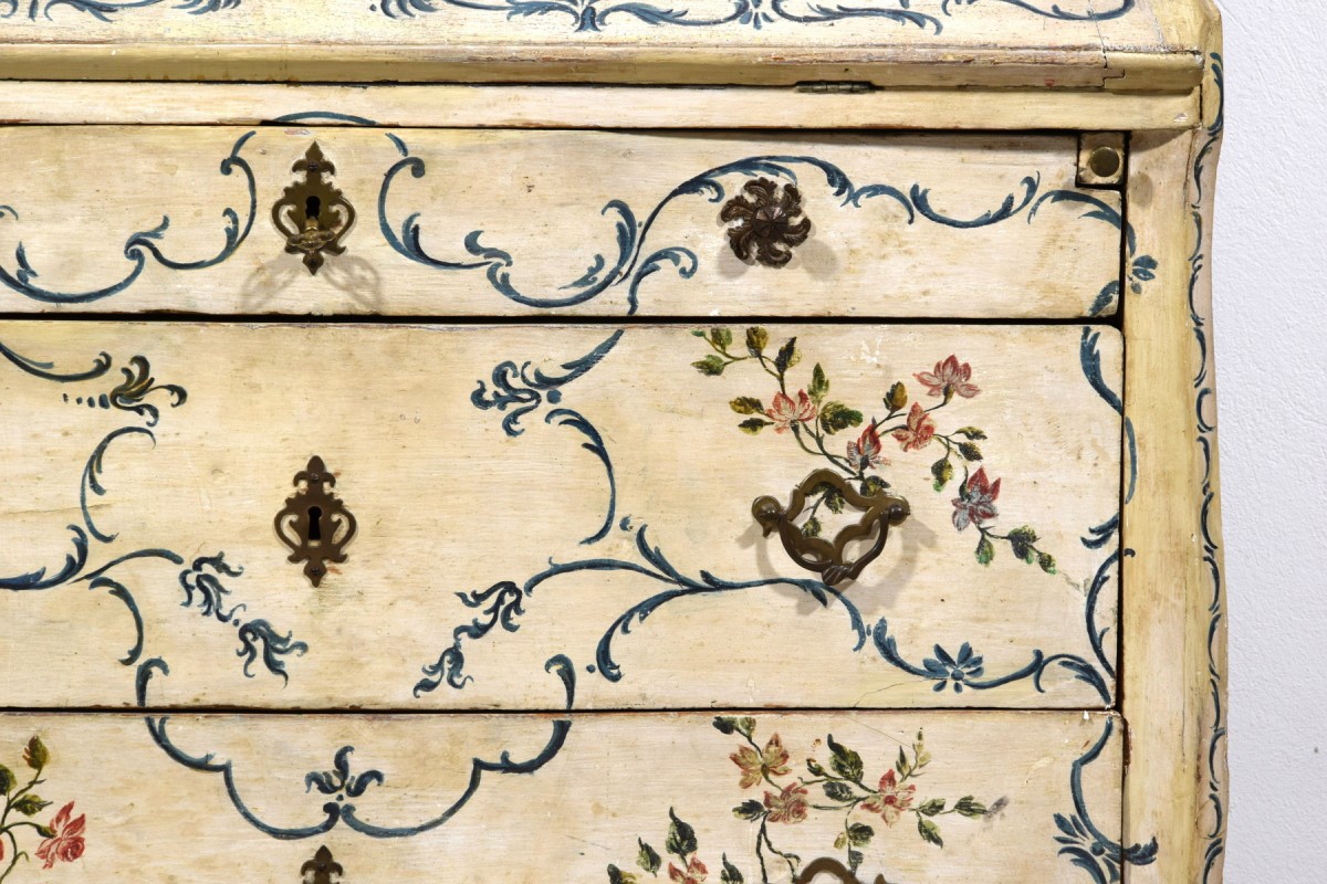 This unusual drop-front chest of drawers represents a fine example of mid-18th-century Genoese lacquered cabinetmaking. Characterized by a sinuous and harmonious profile, the piece features a three-drawer front, with the upper drawer slightly smaller in height. The uprights project beyond the drawer front and terminate in shaped feet.
