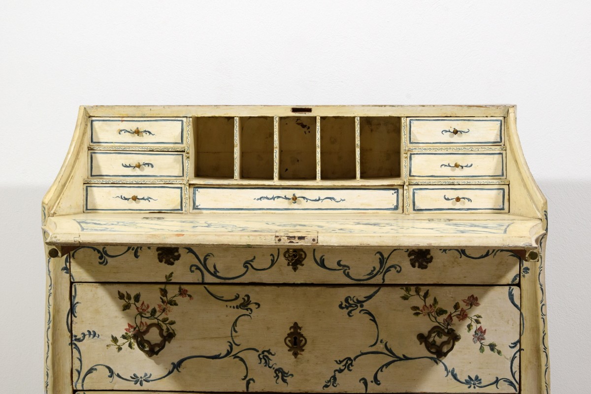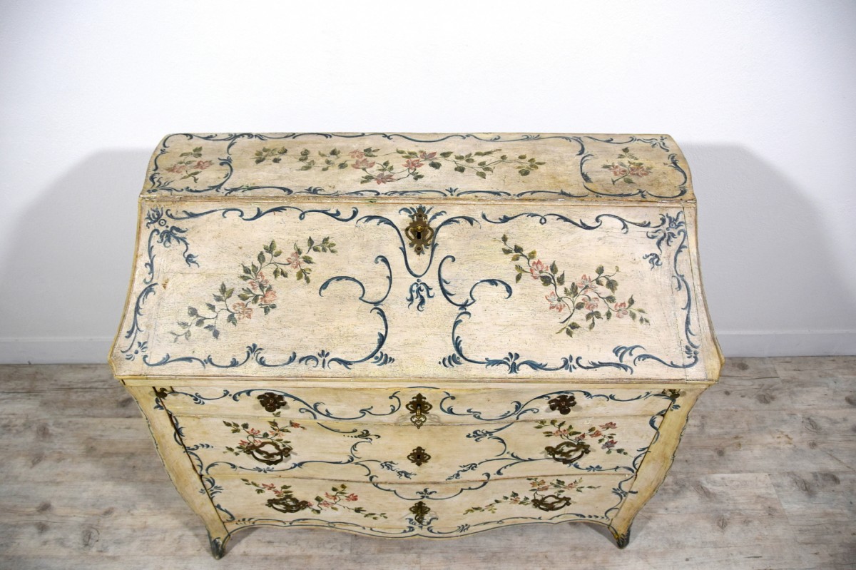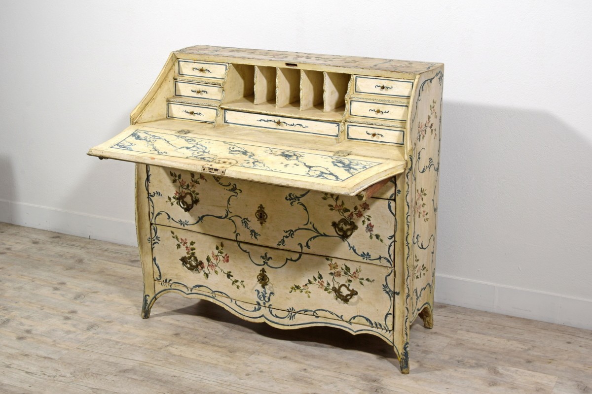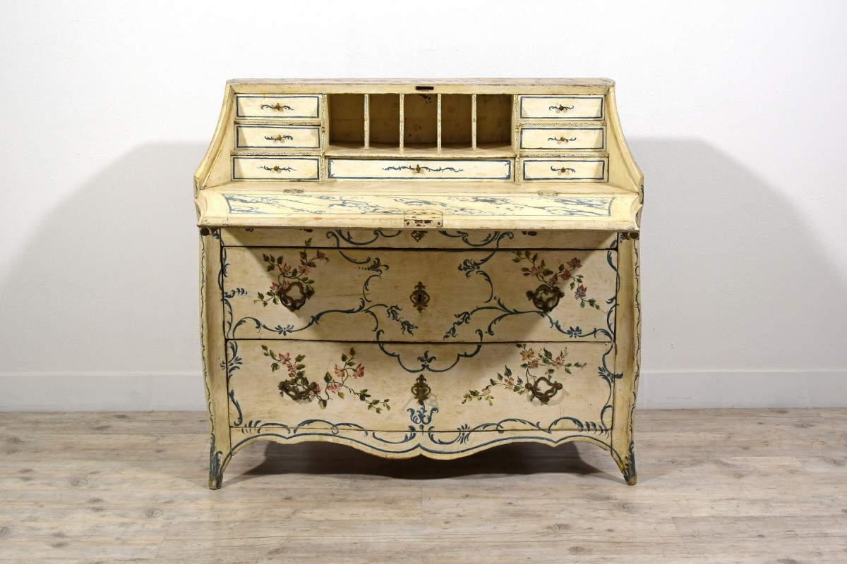 This unusual drop-front chest of drawers represents a fine example of mid-18th-century Genoese lacquered cabinetmaking. Characterized by a sinuous and harmonious profile, the piece features a three-drawer front, with the upper drawer slightly smaller in height. The uprights project beyond the drawer front and terminate in shaped feet.