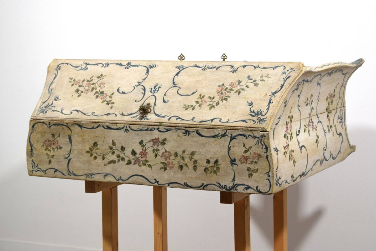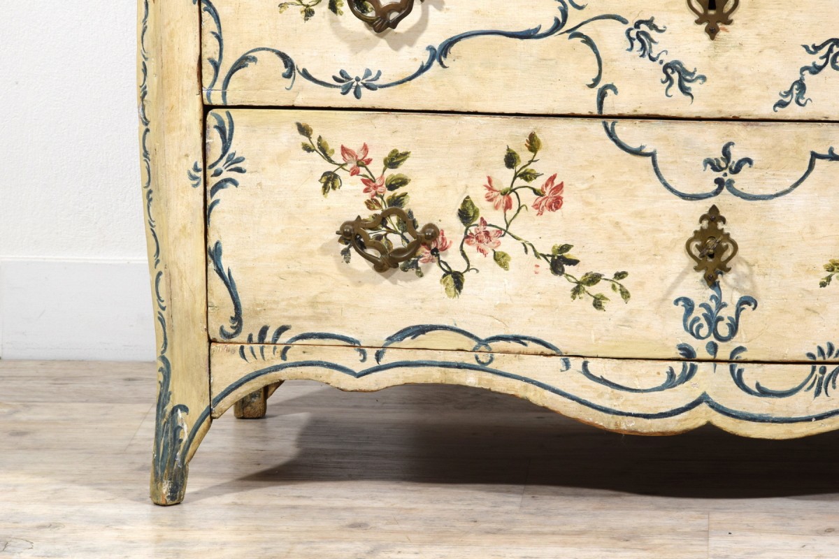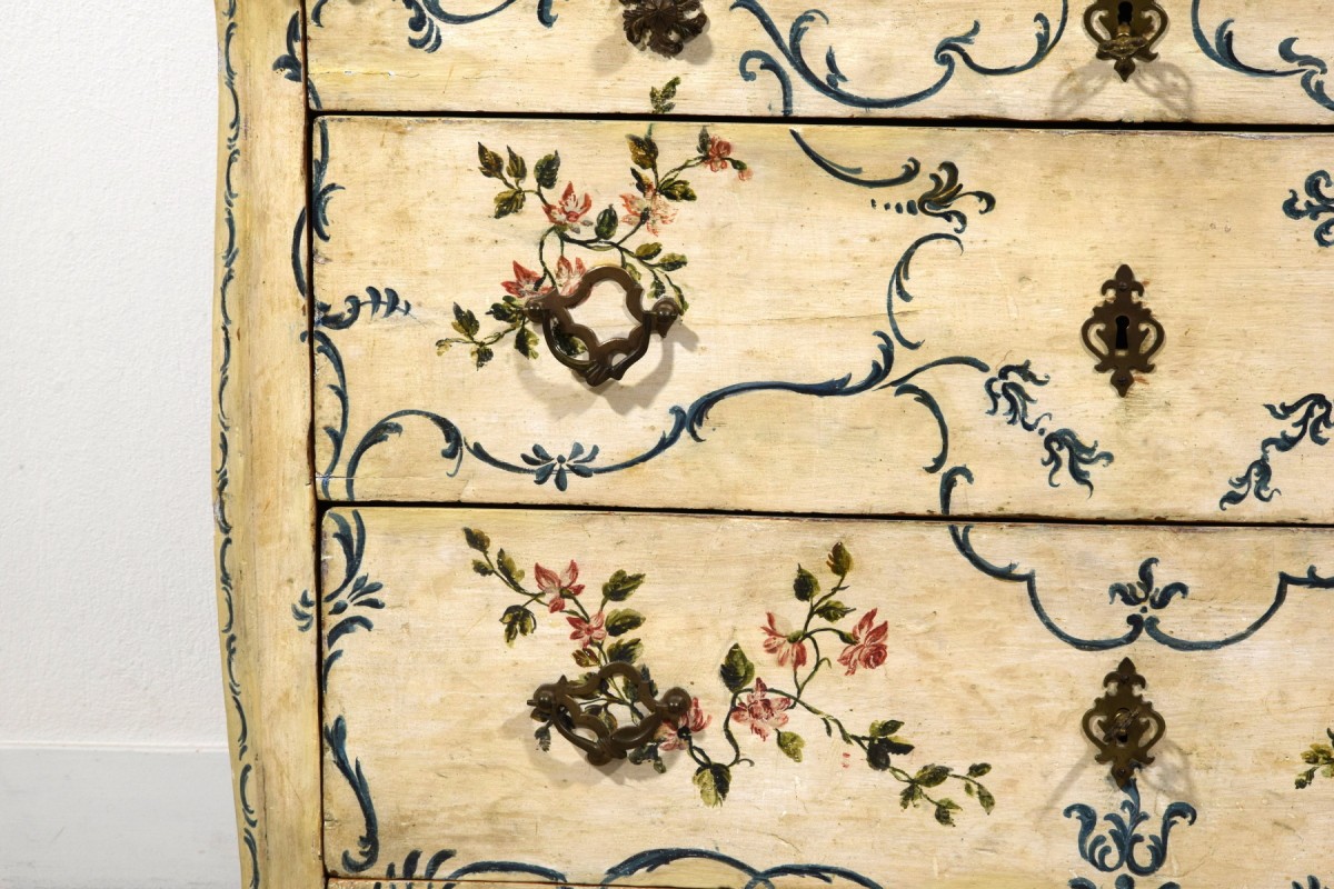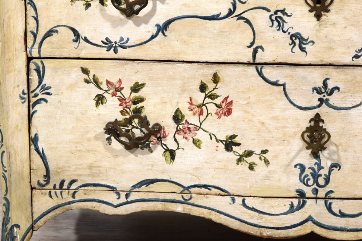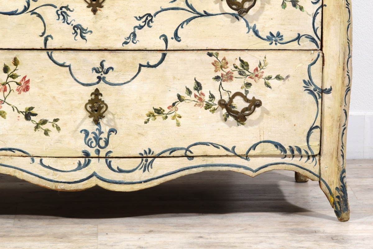 This piece successfully combines functionality with strong decorative appeal, capable of drawing attention in any interior. Its compact dimensions—particularly its shallow depth—make it a rare find on the antiques market. The freshness of the light lacquer and the delicacy of the floral motifs make it extraordinarily versatile: ideal for a historic residence, yet equally able to harmonize with a contemporary design setting. Suitable for a bedroom, it can just as easily be placed in a living room, study, bathroom, or entrance hall. A piece of Genoese costume history, distinguished by its timeless charm.