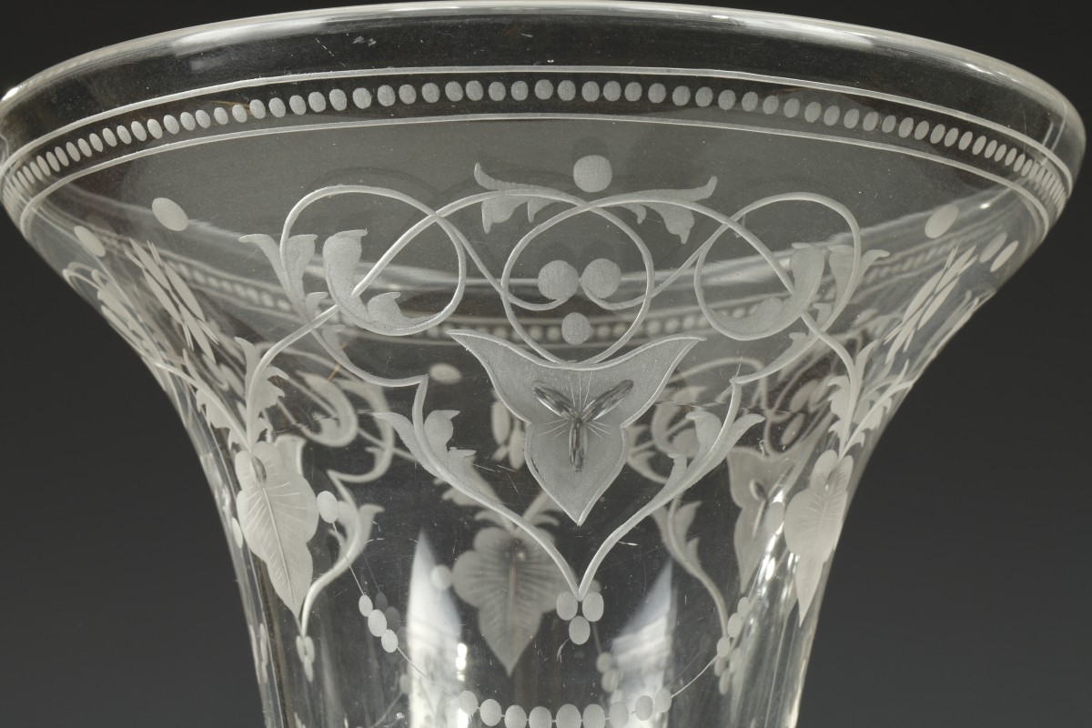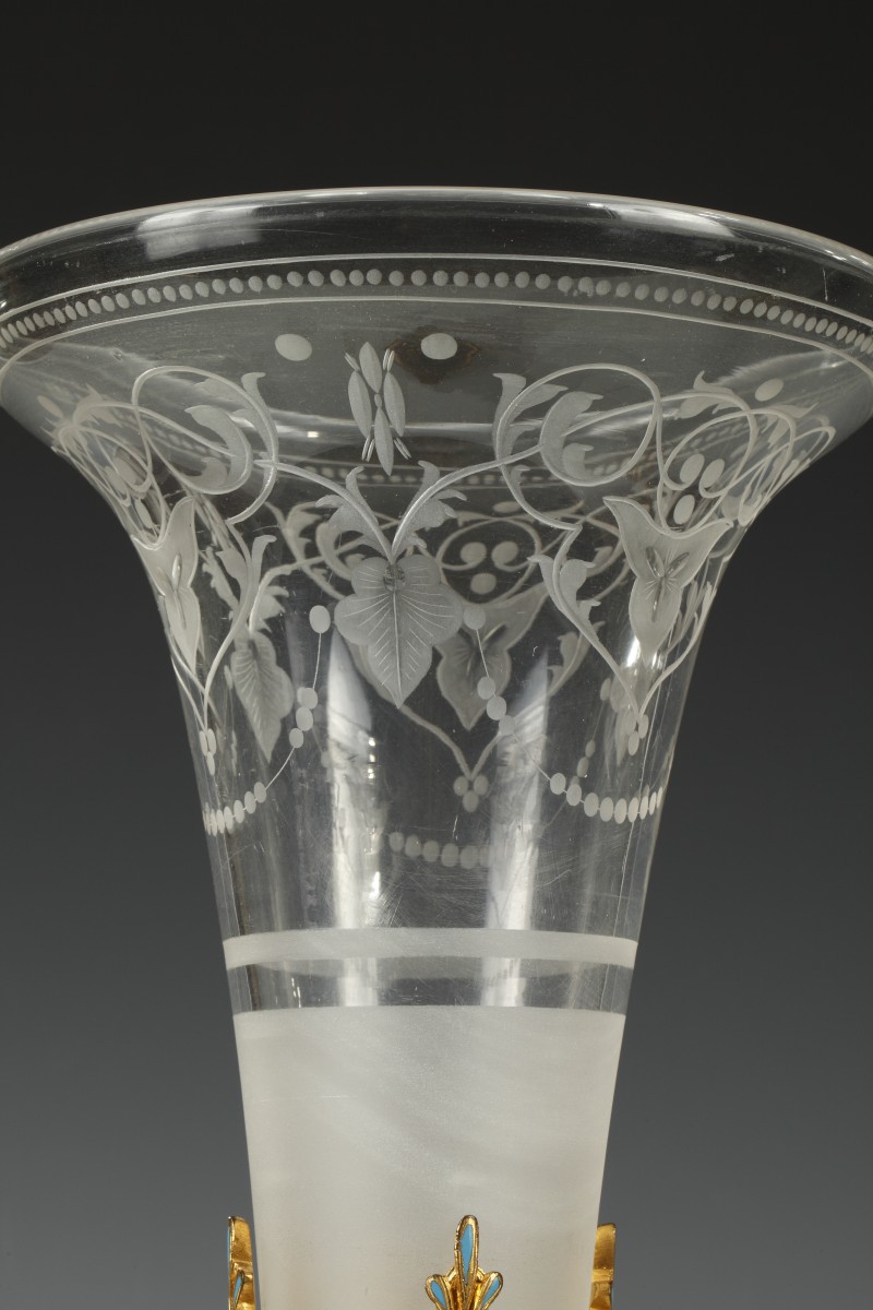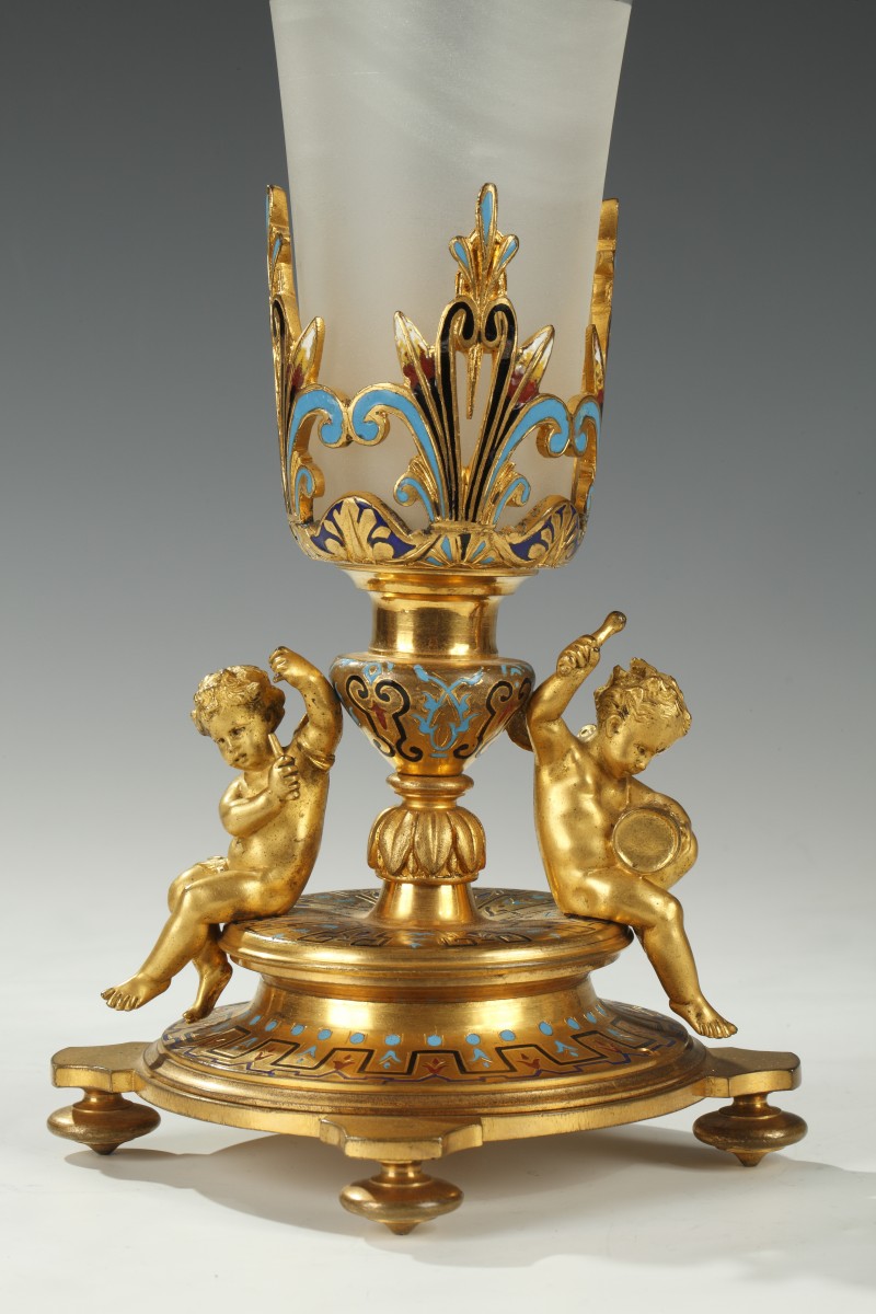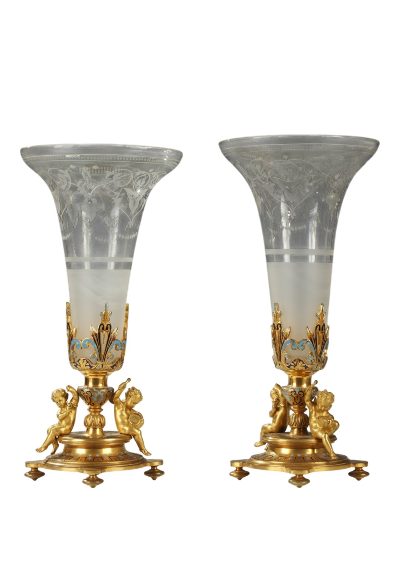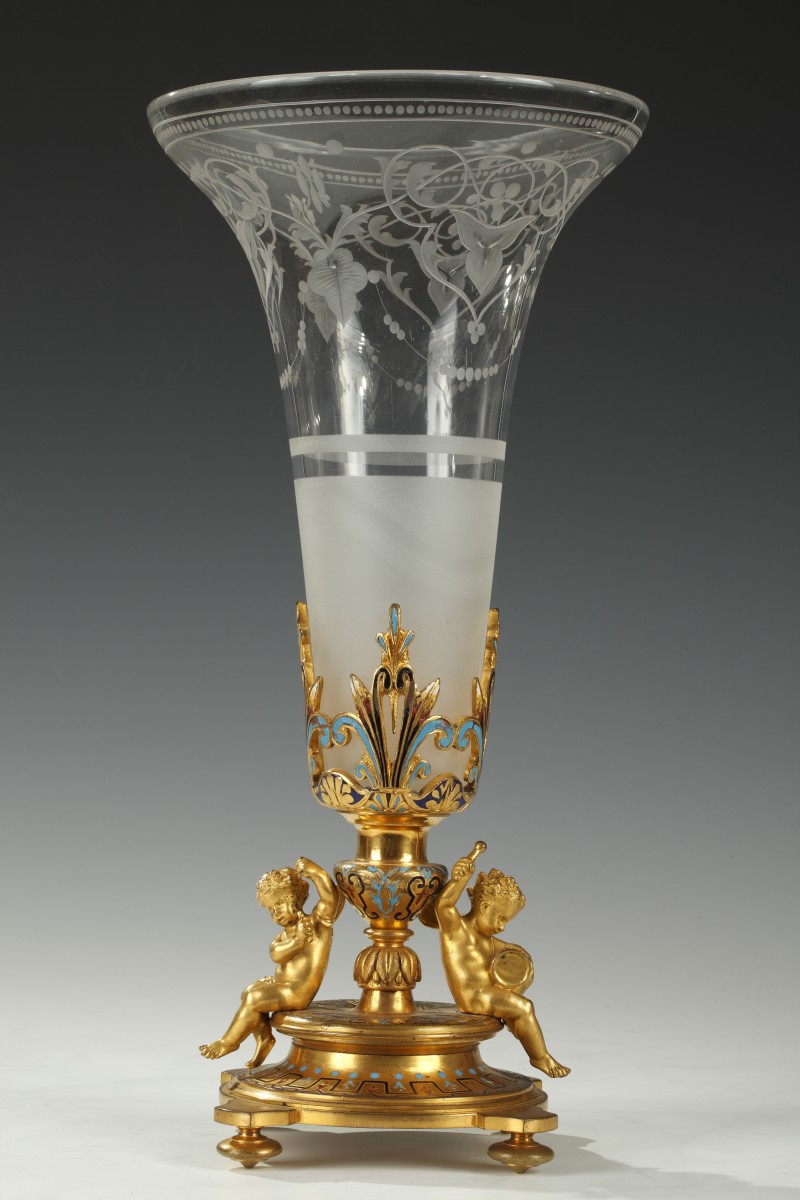 Elegant pair of trumpet-shaped vases with flare neck in engraved crystal decorated with leafy interlacing and beads friezes. Removable, they are enclosed in circular pedestals in gilded bronze adorned with enameled geometric patterns, on which are seated two musicians putti. They rest on four toupie feet.