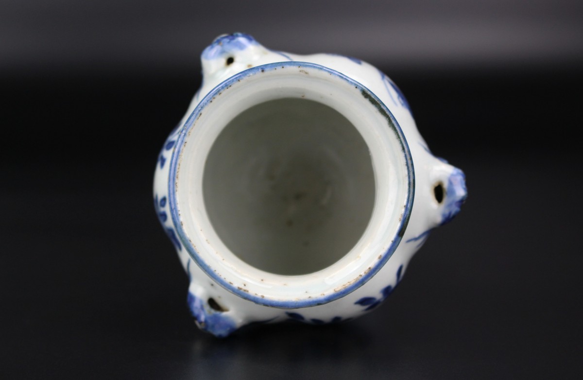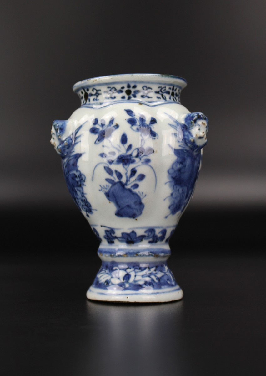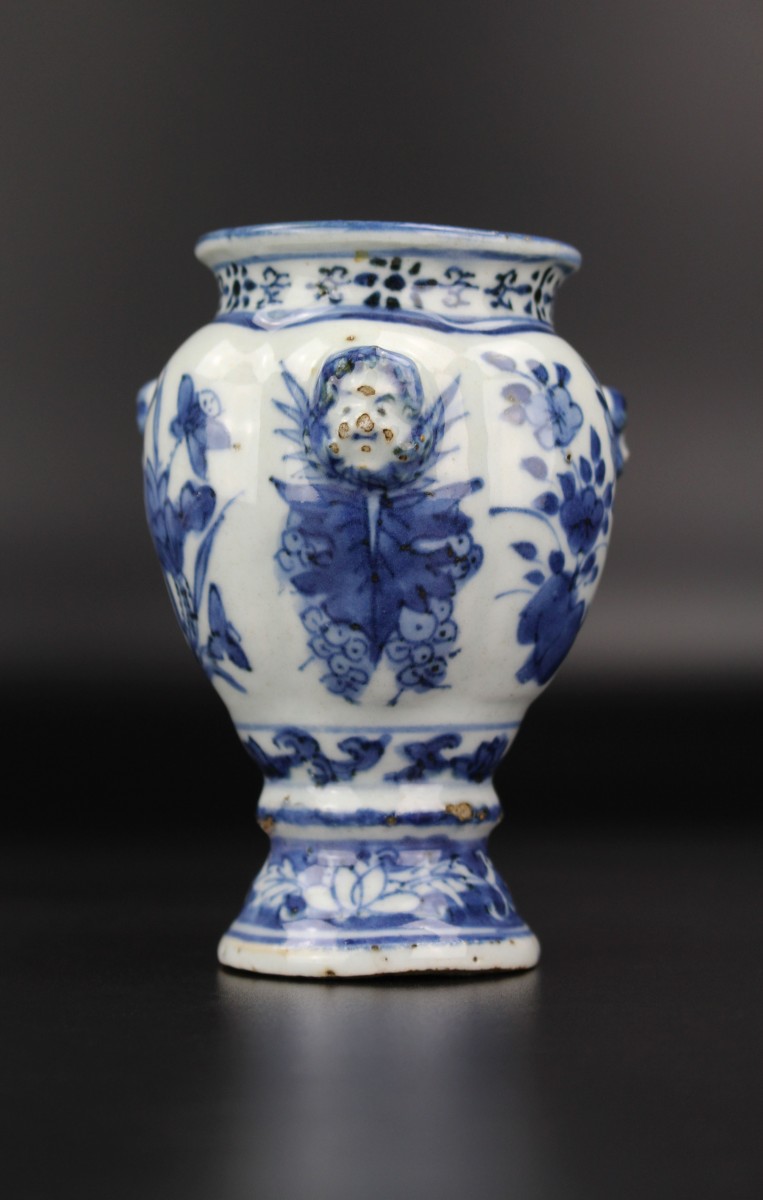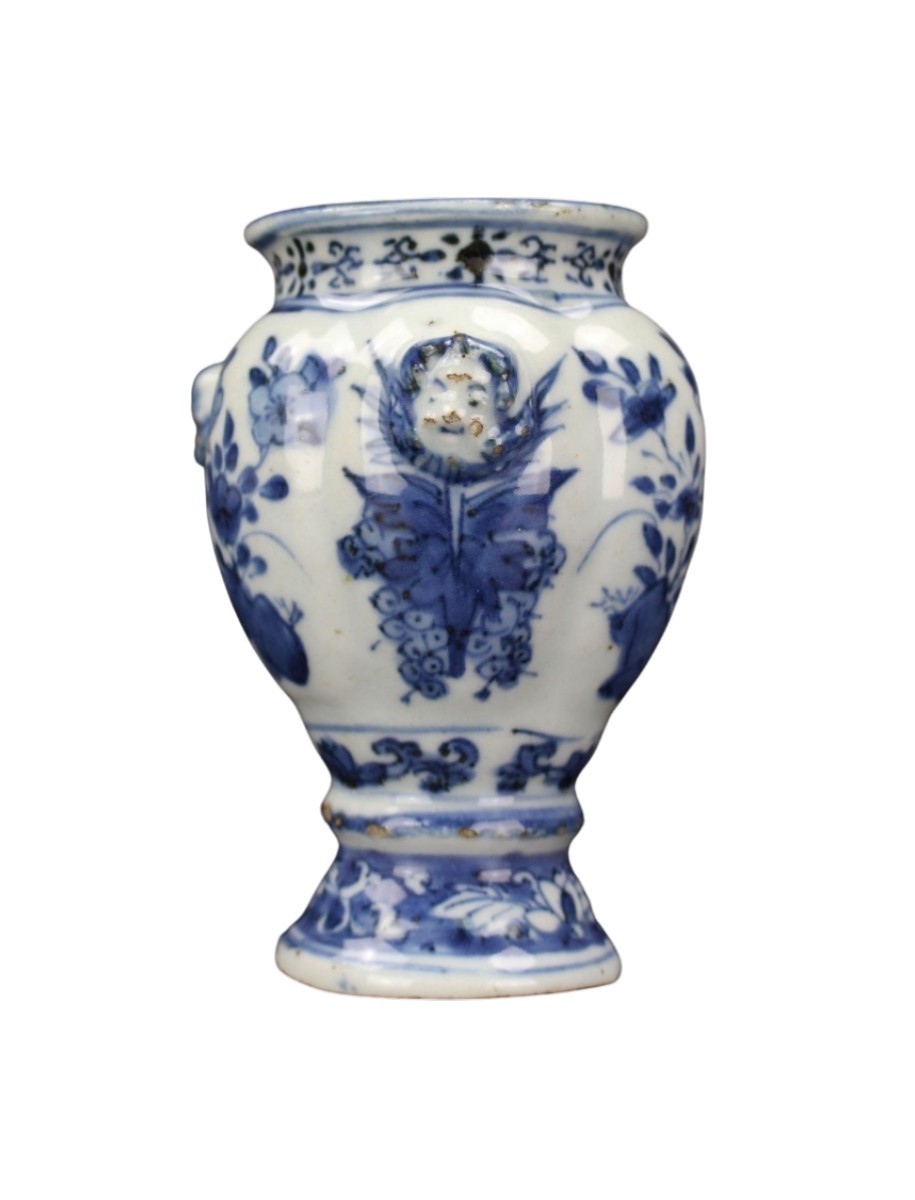 At first, the combination of angelic figures with Chinese-inspired floral patterns might seem purely decorative and influenced by Western aesthetics. However, when compared to related jars, where the flower sprays are replaced by emblems of Christ’s Betrayal, Crucifixion, Passion and Descent from the Cross, a deeper Christian symbolism becomes apparent, even in this seemingly ornamental context. The pairing of angels with grape motifs further suggests a Eucharistic theme—though the usual symbol of wheat is missing, its presence may be subtly alluded to through the floral designs. These small vases, likely inspired by European metalwork or goldsmith objects, were possibly intended for use within church interiors, perhaps serving a decorative function.