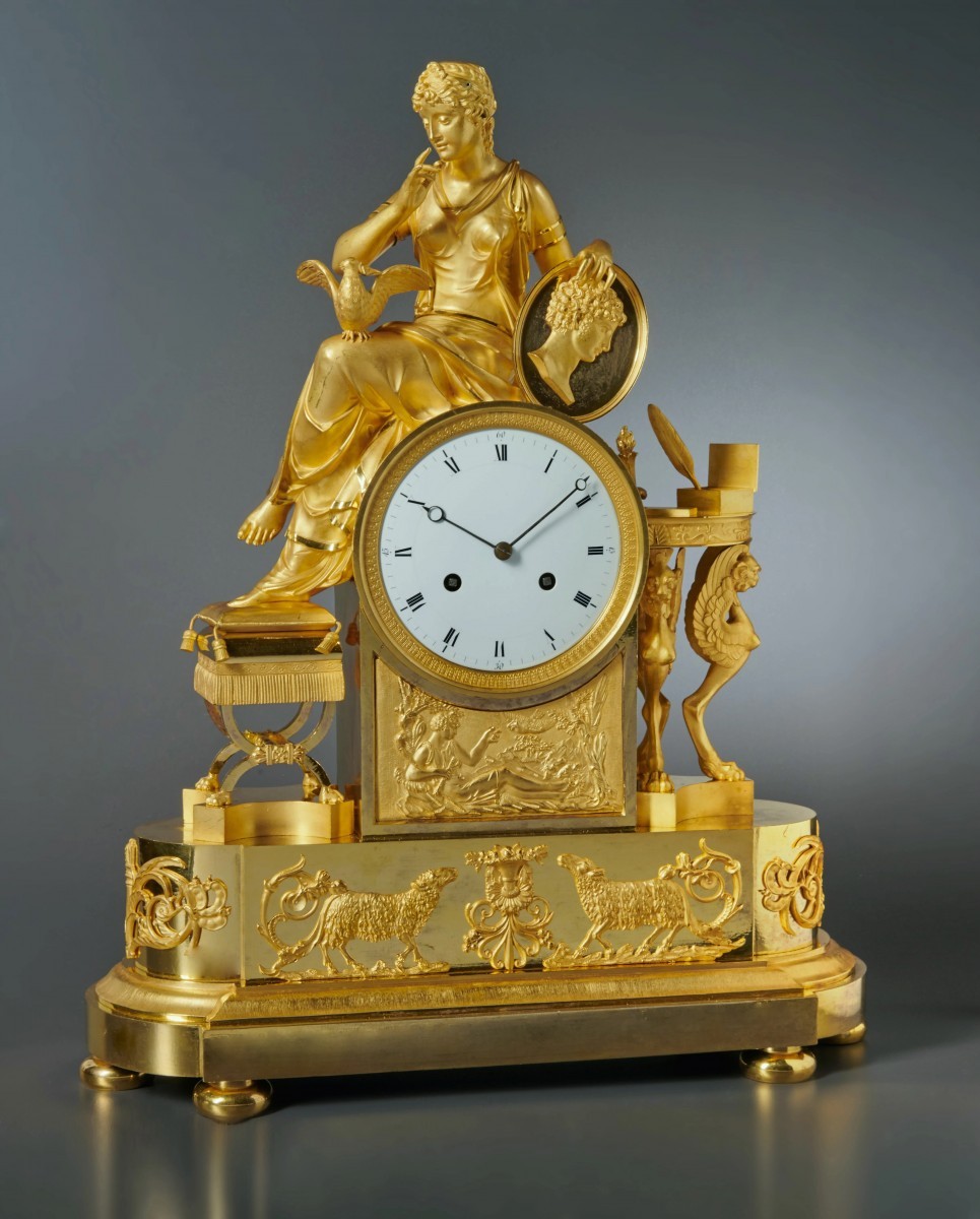 A very fine Empire gilt and part patinated bronze mantel clock of eight day duration housed in a case attributed to François-Louis Savart after a model by the same bronzier. The white enamel dial with Roman and Arabic numerals and blued steel moon-style hands for the hours and minutes. The movement with silk thread suspension, anchor escapement, striking on the hour and half hour on a single bell, with outside count wheel. The beautiful case showing a young woman in classical dress seated upon the dial drum who holds in her left hand a portrait medallion of her lover while looking down toward a carrier pigeon who sits upon her knee and holds a note she has just written to her love. She rests her feet on an ancient Greco Roman style x-shaped stool or tabouret which stands to the left of the dial plinth while to the right is a tripod table with three winged monopodia supports, each with a female bust and head and feet of a lion, on top of the table rests a writing box with quill pen and a flaming candle in a candlestick. Below the dial, within the pedestal frieze is a young shepherd holding a panpipe, reclining beneath trees, who receives a message from the young woman held in the beak of the same carrier pigeon. The rectangular base with rounded ends cast at centre with a vase of flowers issuing from an anthemion flanked either side by a pair of sheep, with further mounts to either end. The whole on bun feet