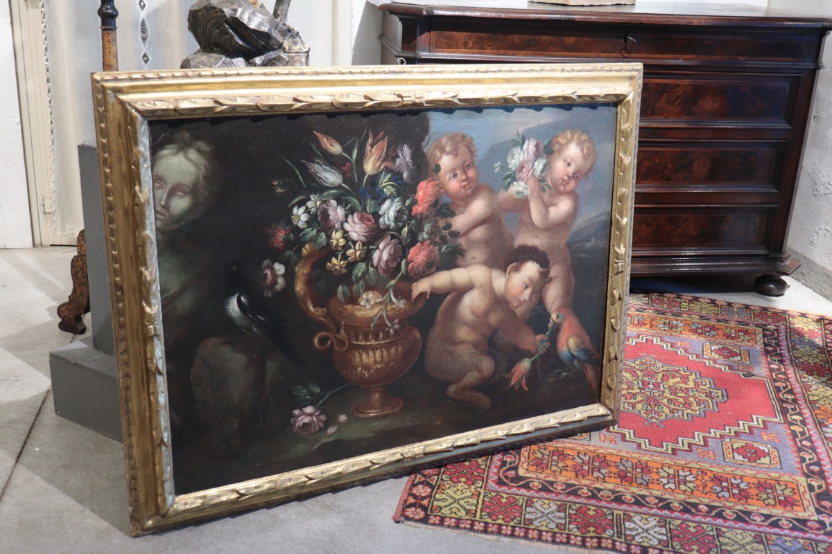 Oil painting on canvas depicting Putti, Faun, and flowers.