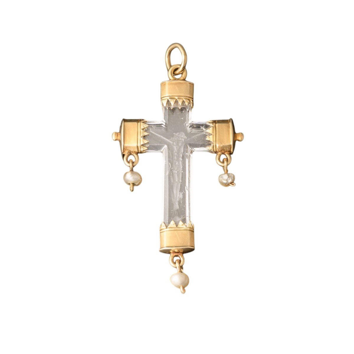 A rock crystal devotional pendant, consisting of a crucifix with gold mounts and small natural