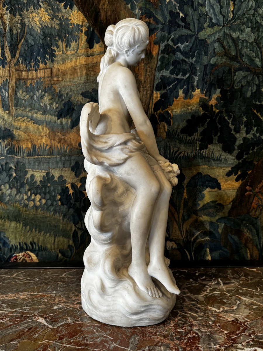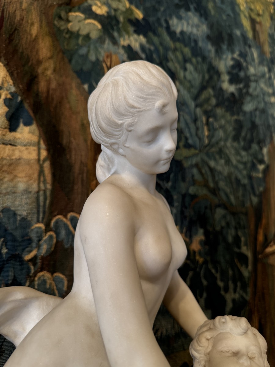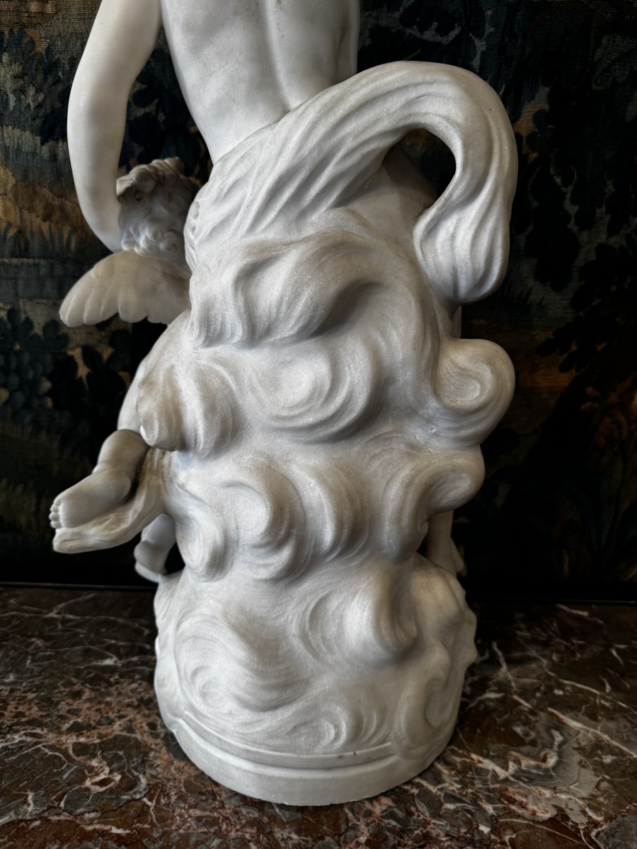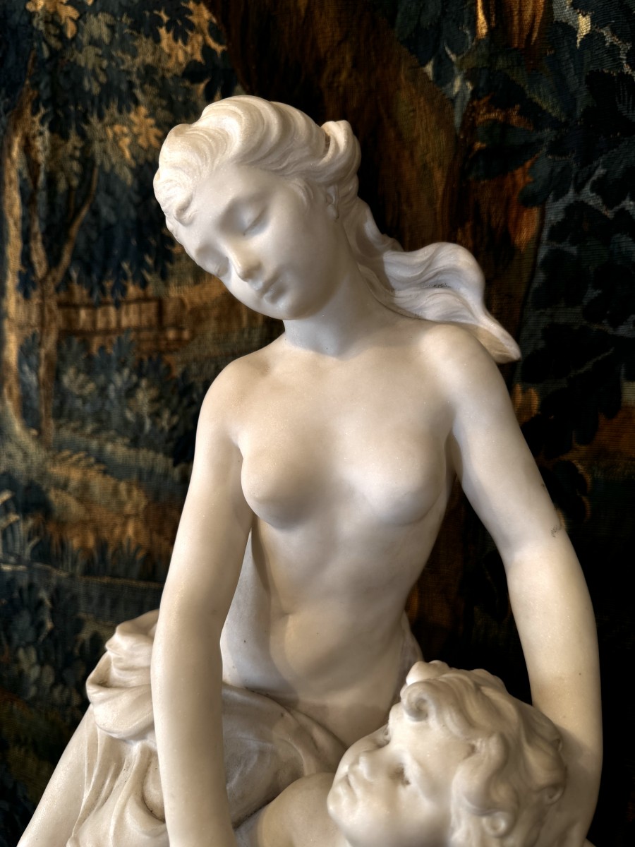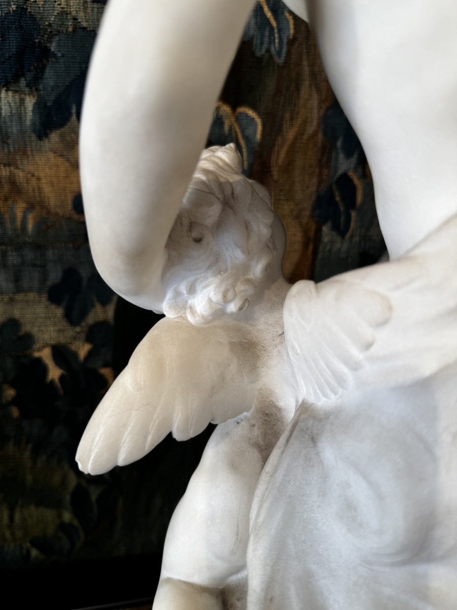 Carrara marble sculpture depicting a seated Venus and Cupid holding a bouquet of flowers and an arrow.