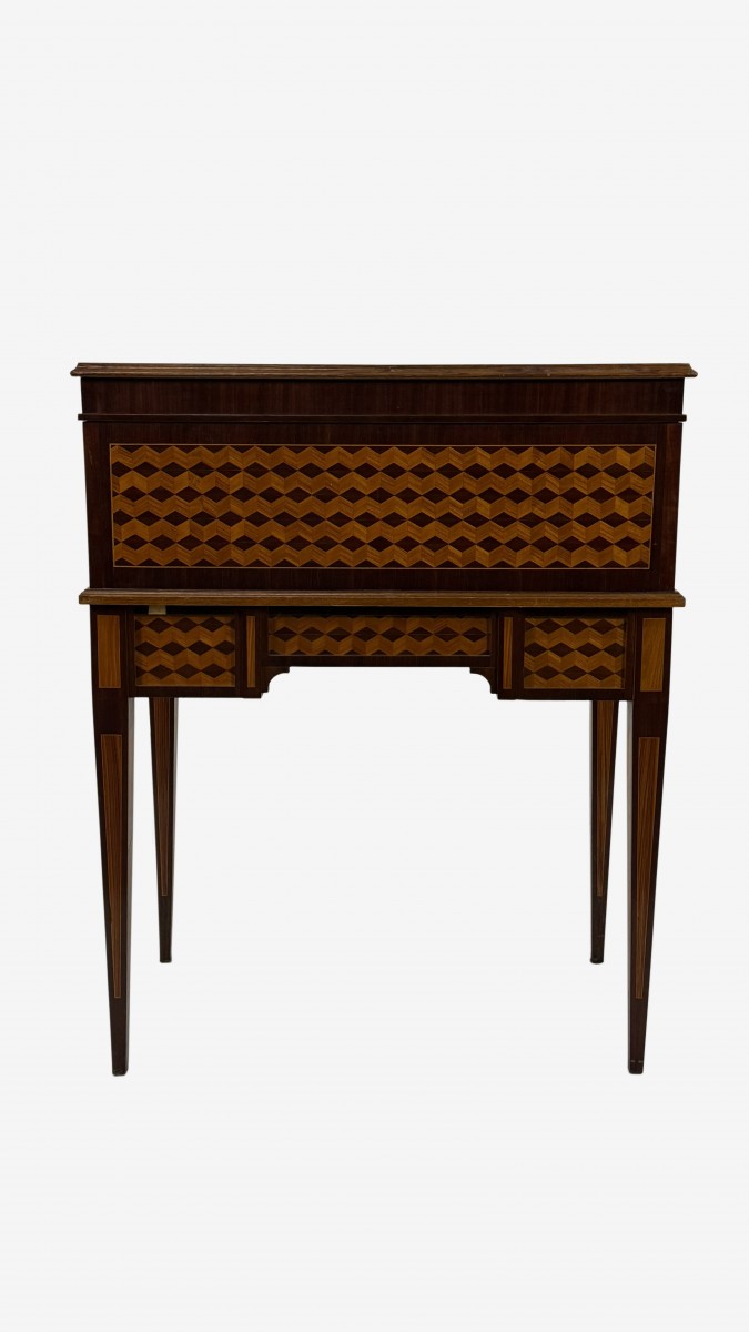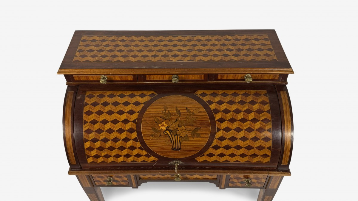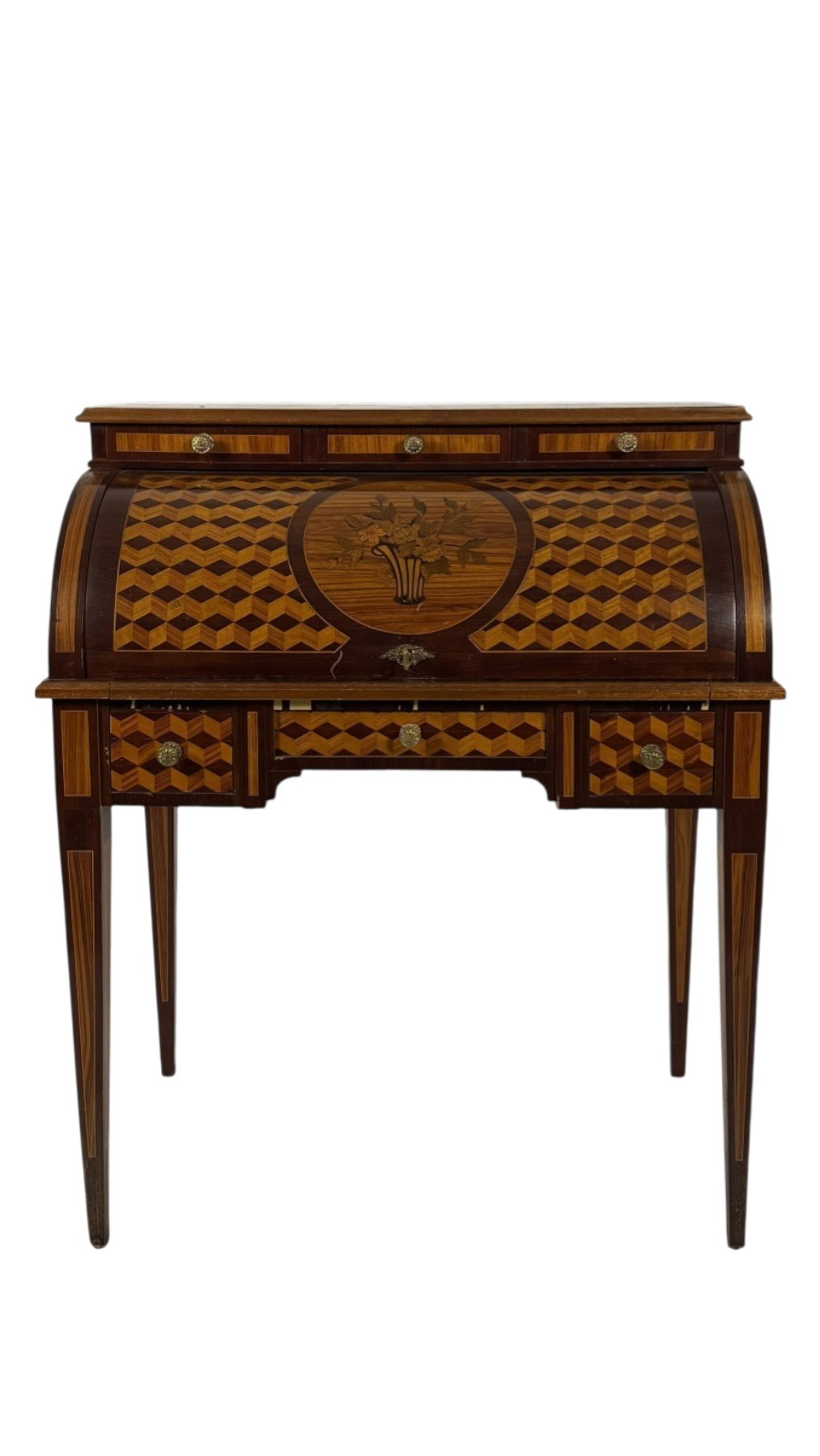 A central roller desk veneered in various woods, France, 20th century, in Louis XVI style, body decorated with marquetry, three drawers in the belt, on the drop-leaf a medallion depicting a vase of flowers and inside four compartments and three drawers, sliding top covered in burgundy leather, the small shelf presses three drawers in line, 99x81x48 cm