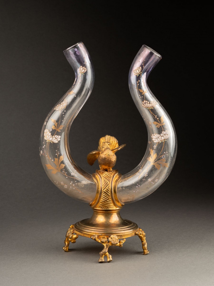 Vase composed of two tubular arms in Baccarat crystal, elegantly curved and rising symmetrically from a central gilt-bronze element reminiscent of Asian folding screens, woven in a chevron pattern. The center is surmounted by a dove with outstretched wings in gilt bronze. Japonist in style, this vase features decoration typical of the Land of the Rising Sun, with feet shaped like blossoming cherry branches. The crystal walls are finely decorated with painted floral motifs (stylized chrysanthemums, emblem of the imperial family) and gilded foliage.