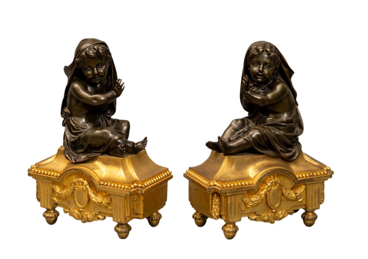 A very fine pair of French figural chenets (fireplace andirons) in patinated and gilt bronze. Each chenet is surmounted by a seated putto playfully hiding beneath a large, draped veil. A charming cache-cache (peek-a-boo) motif characteristic of French decorative arts in the late Ancien Régime period.