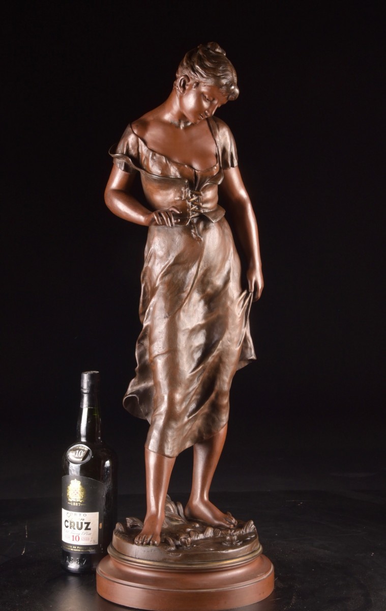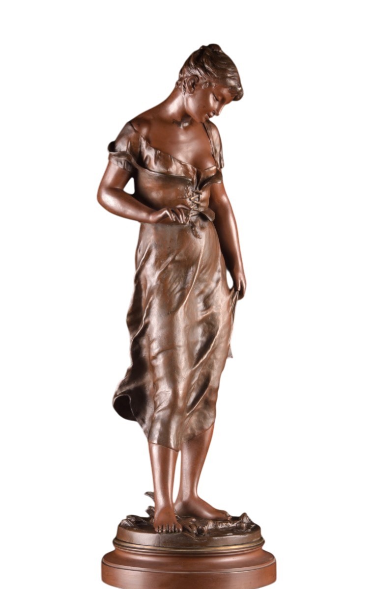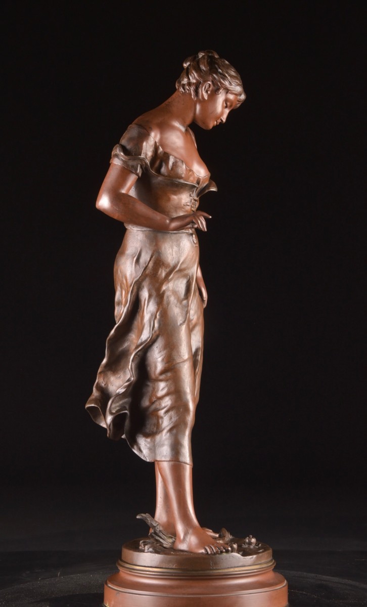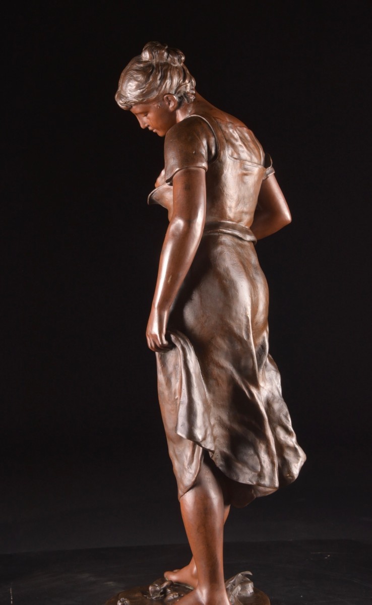 An elegant, finely modeled sculpture in patinated bronze by Émile François Carlier, entitled Candeur, aptly illustrating the refined aesthetic of the late 19th century and the tradition of French academic sculpture. The standing female figure is depicted in an intimate, contemplative moment, leaning slightly forward, observing the water at her feet. This introspective attitude, combined with gentle expression and subtle gestures, lends the piece a poetic, almost dreamlike quality. The natural treatment of the drapery and the finesse of the modelling testify to Carlier's remarkable mastery. The warm, nuanced patina enhances the play of light and underlines the plastic quality of the work. The sculpture rests on a circular base, signed, and bears an applied label "Candeur / par E. Carlier (sculpteur)", confirming the title and attribution. This work is fully in keeping with the spirit of the Belle Époque and the Paris Salon des Beaux-Arts, where elegance, emotion and naturalism take center stage. Dimensions: