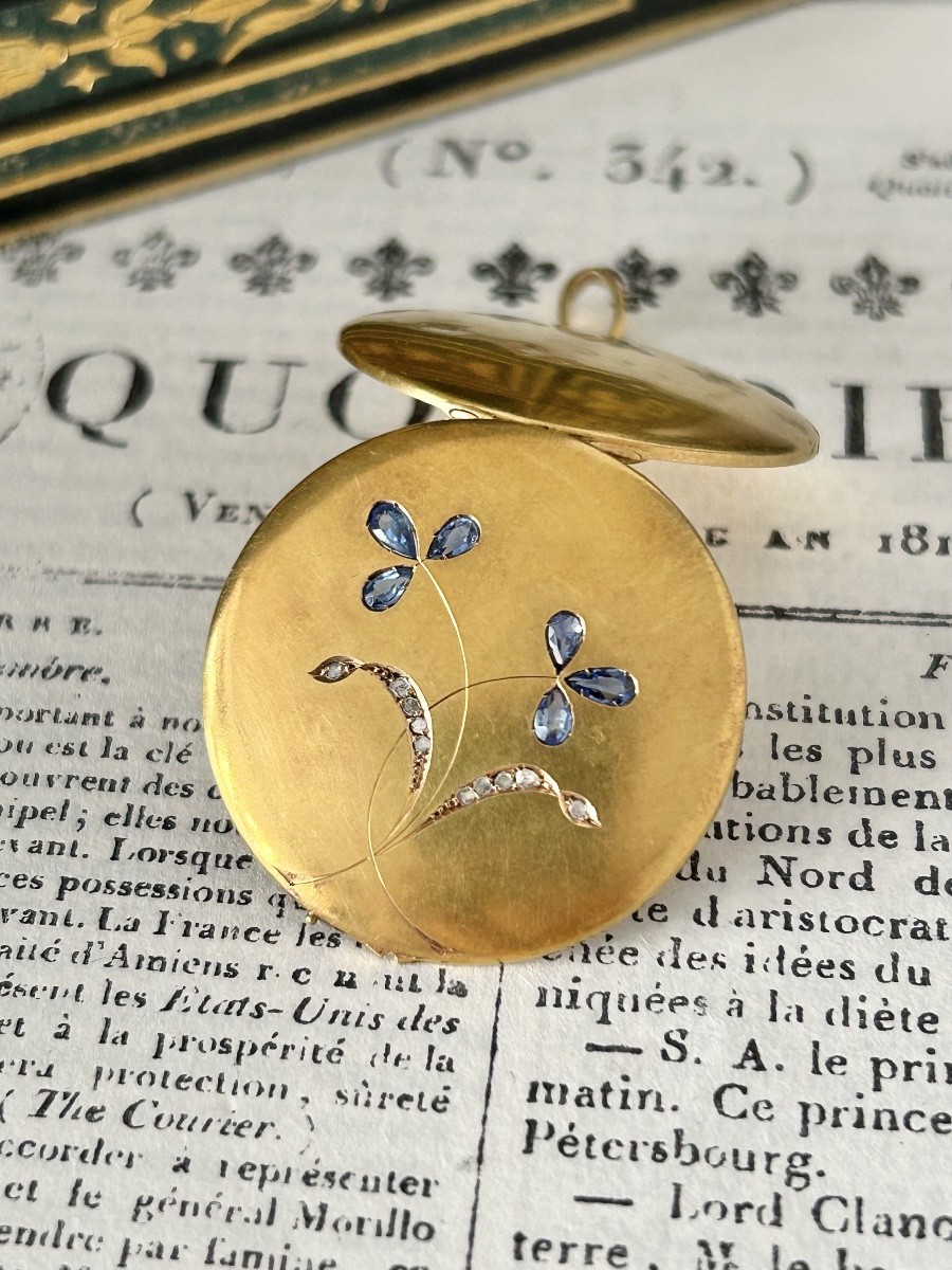 Art Nouveau photo holder pendant in 18K yellow gold with floral motif, consisting of 6 natural pear-cut sapphires that make up the petals and 10 rose-cut diamonds for the leaves.