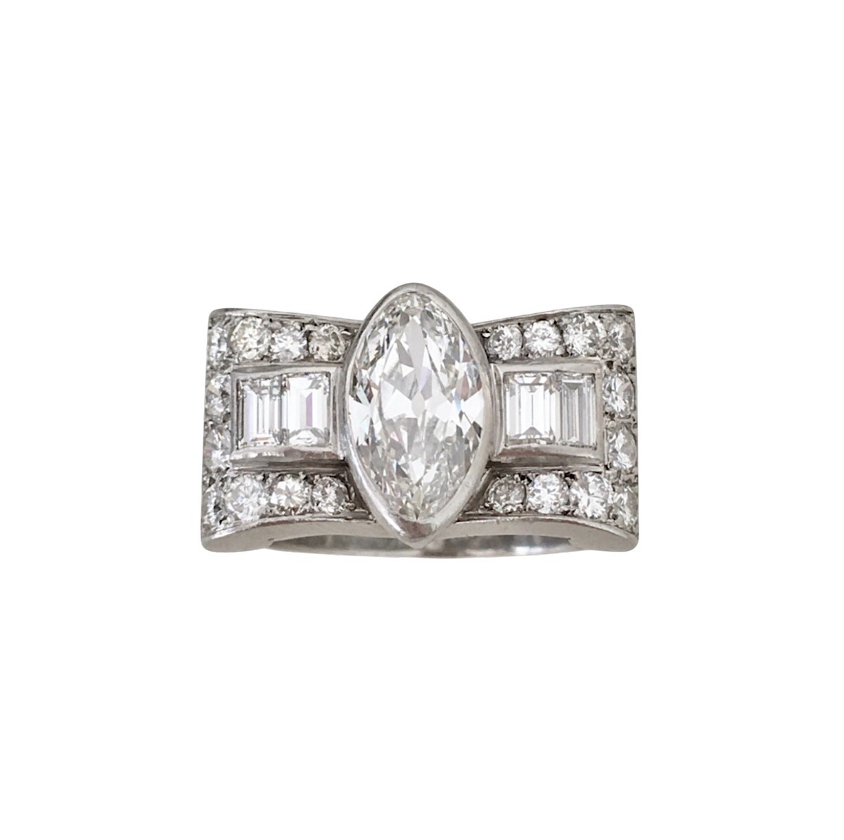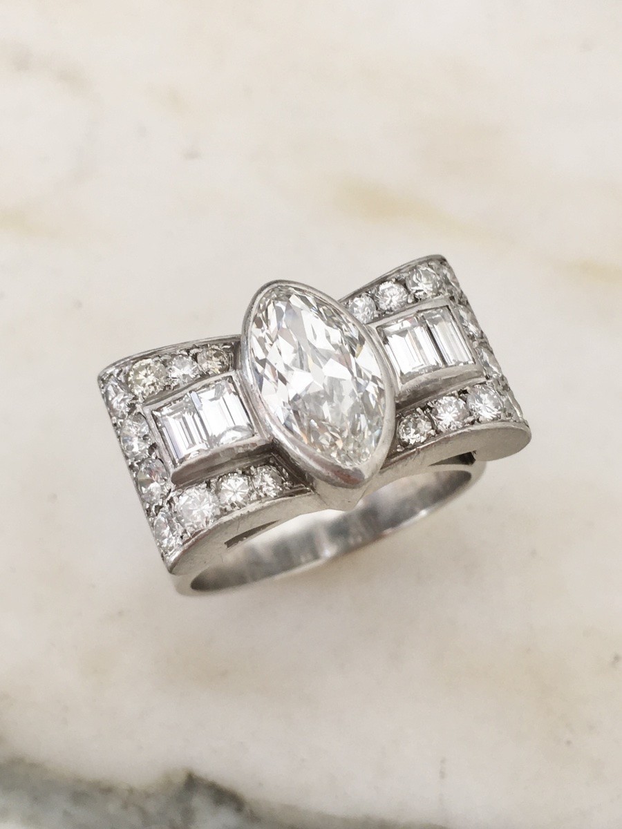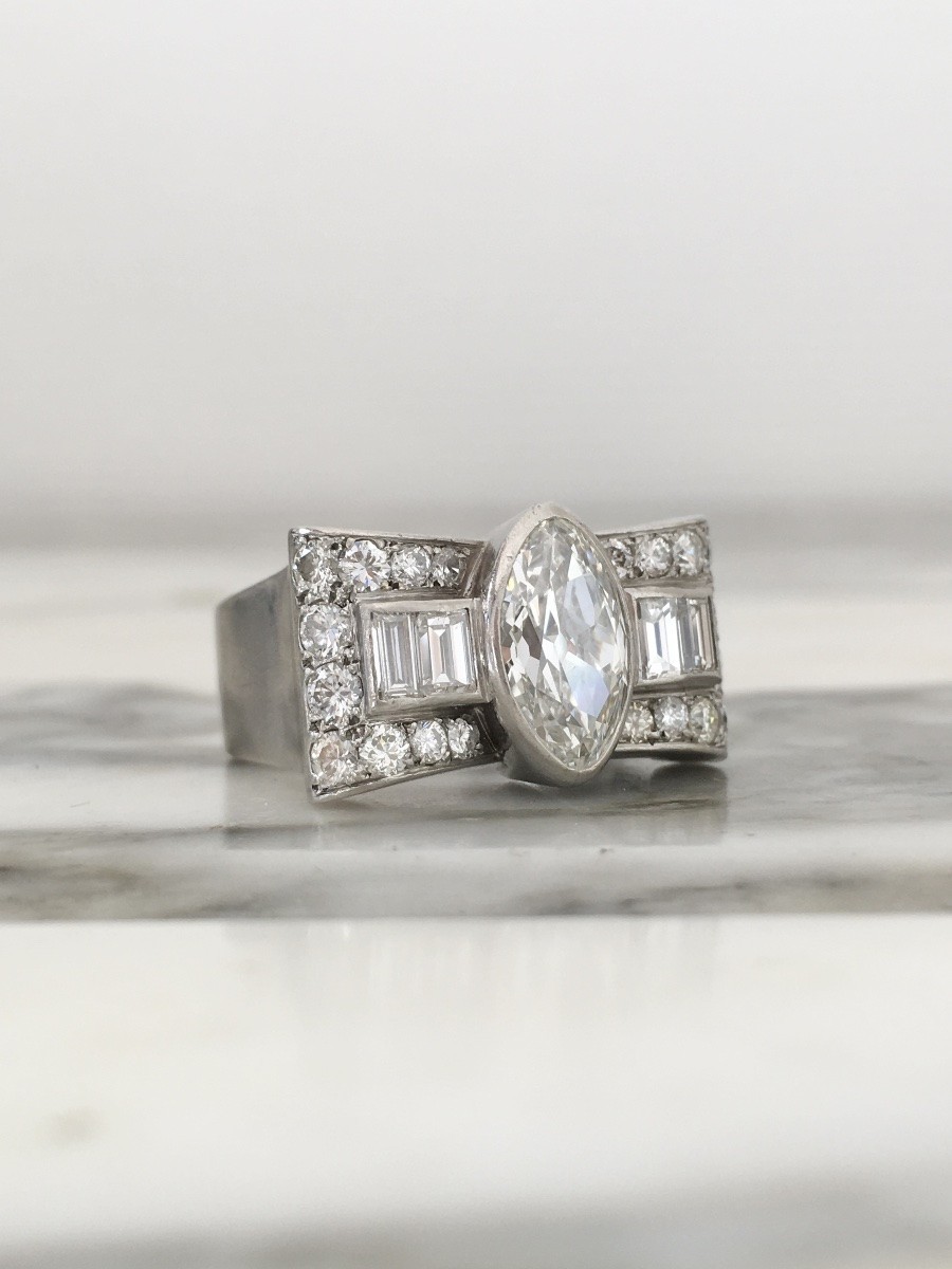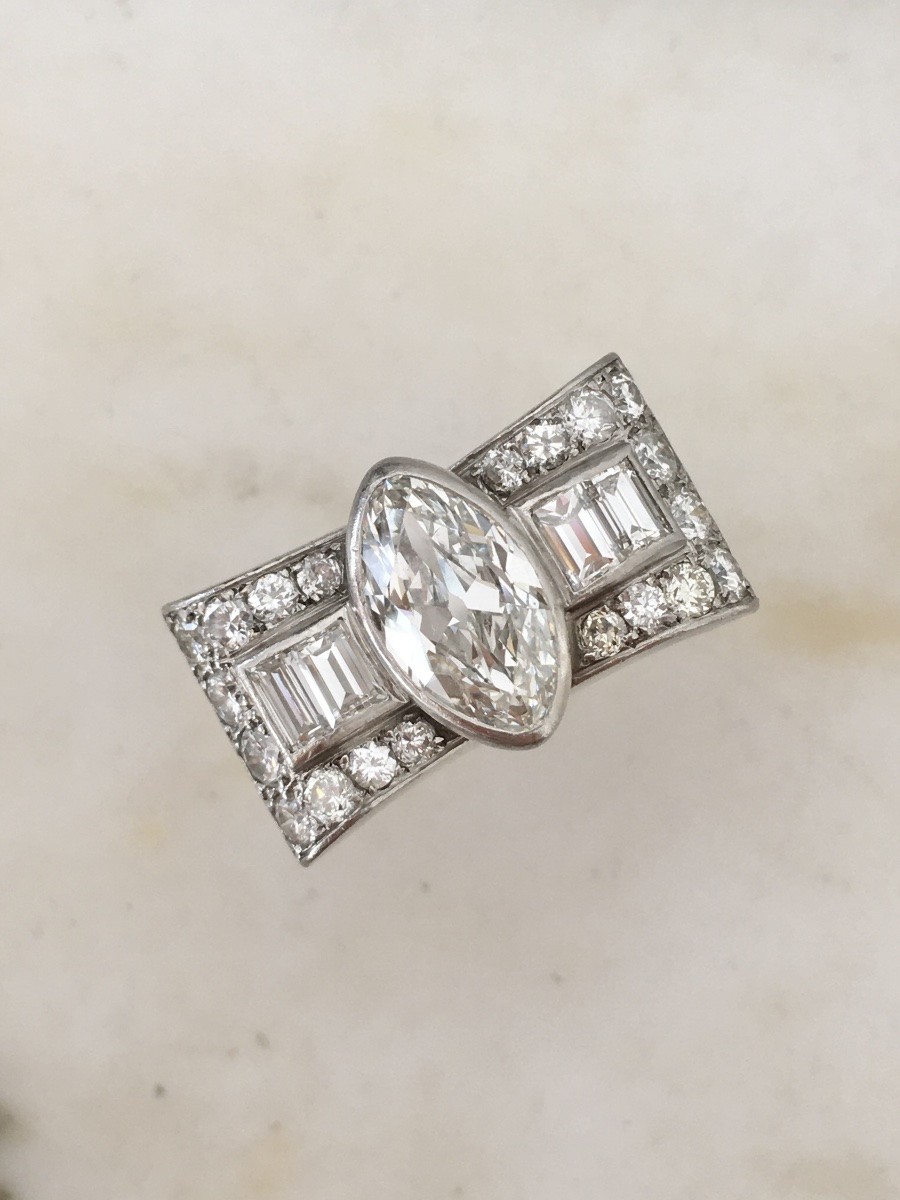 Platinum Art Deco Tank ring set in the center with a marquise-cut natural diamond (I color / SI1 clarity) for approx. 1.96 ct.