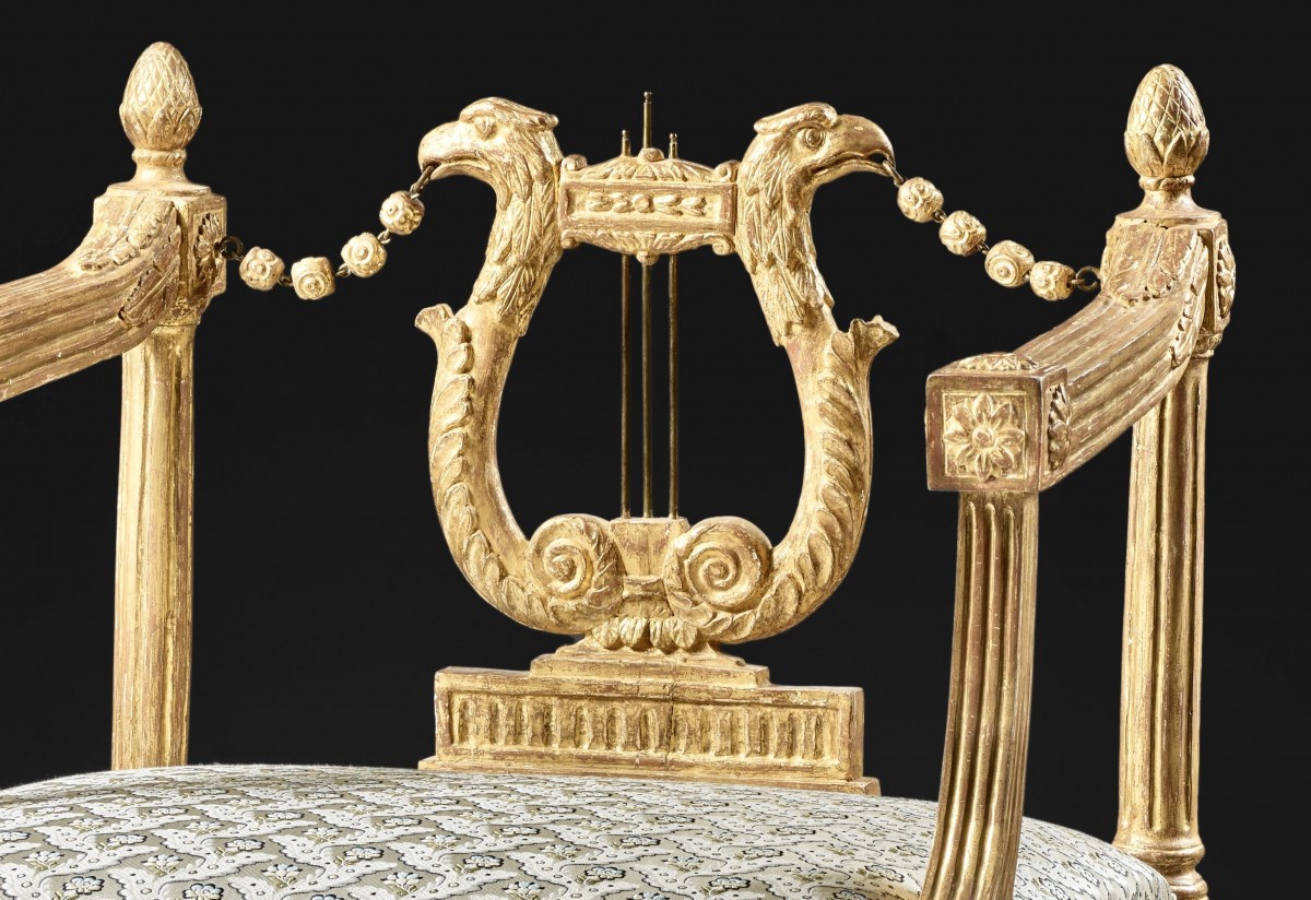 This armchair, crafted in gilt wood, features a low openwork back composed of a lyre, each handle in the shape of an eagle, the upper end of which is the head. The lower part ends in a volute, resting on a slender rectangular base adorned with a frieze of canals. The backrest is linked to the rear uprights by chains emerging from the eagles' beaks and decorated with gilt wood beads. These uprights, in the form of fluted columns, are surmounted by cubes adorned with rosettes and topped with a pinecone.