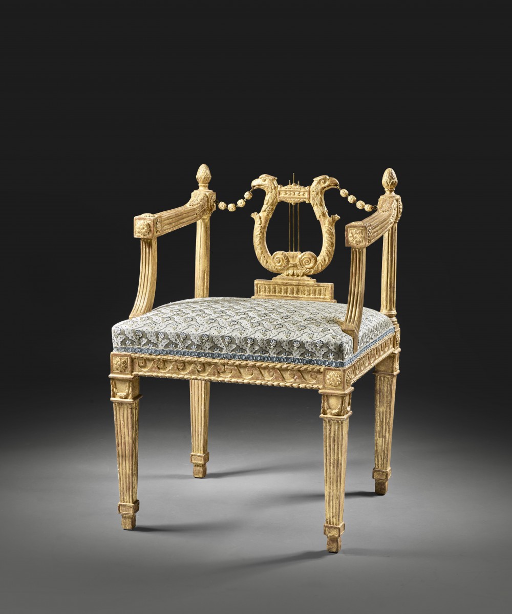 Finding its source in the ancient repertoire, the lyre pattern enjoyed a certain success in France in the furniture of the last years of the Ancien Régime. The carpenter Georges Jacob (1739- 1814) produced several chairs for the royal household that featured this motif. In 1788, he delivered a suite of lyre-backed voyeuses to the Comte d'Artois for the Château de Bagatelle music salon, a pair of related voyeuses to Jean-Baptiste Tourteau de Septeuil, frist valet to the King from 1779 to 1792, and a set of three lyre-backed sofas for the Comte de Provence in Versailles.